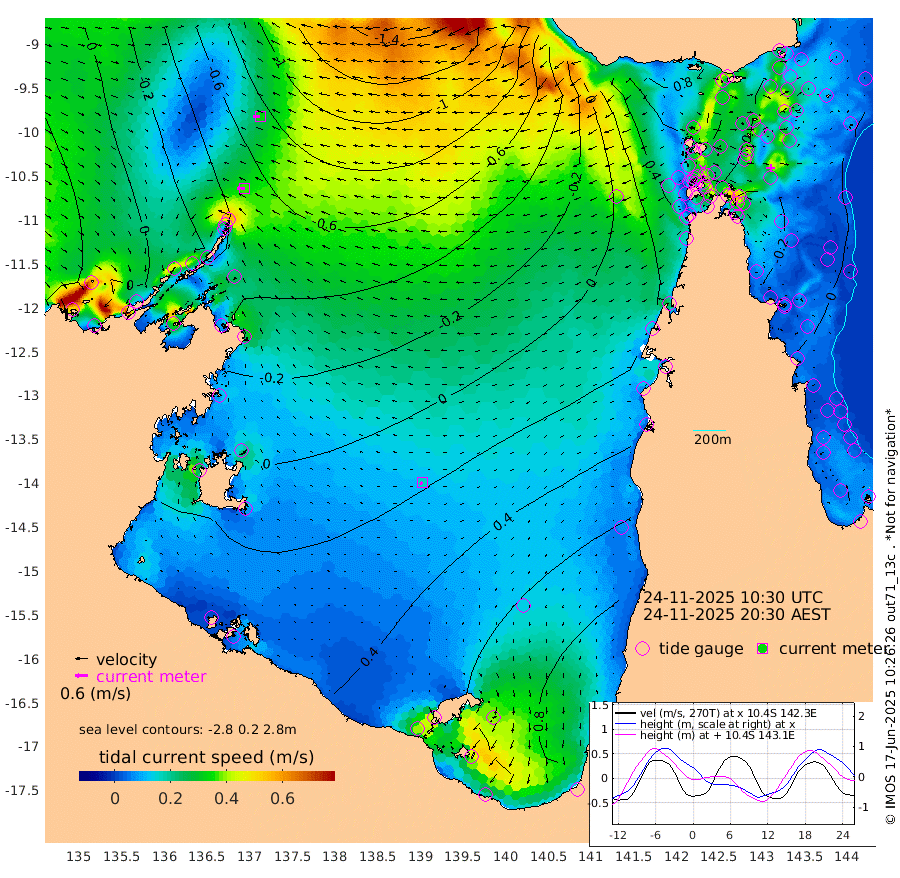 37cm/s -88T +3cm/s rms + 7cm/s -42T. ARA-GOC87 57m 16cm/s -125T +3cm/s rms + 2cm/s -2T. ARA-GOC87 60m 34cm/s -93T +2cm/s rms + 3cm/s 61T. ARA-GOC87 47m -14cm Daru -18cm Bobo Island -4cm Meer Island Barge -9cm Bramble Cay -15cm Unnamed Cay -8cm Pearce Cay -9cm Stephens Island -17cm Merrie England Shoals -19cm Mutacomal Reef -14cm Darnley Island Barge 1cm East Cay -17cm Yorke Island Barge -10cm Rennel Island -13cm Aureed Island 0cm Dungeness Reef -17cm Zagai Island -3cm Yam Island 10cm Dauan Island -7cm Saibai Island 40cm Phipi Reef -1cm Warrior Reef - West 2cm Mabuiag Island Barge -9cm Half Way Island -17cm Coconut Island -9cm Dugong Islet -10cm Poll Island 0cm Kirkcaldie Reef 2cm Suarji Island -18cm Sue Islet 42cm Hawkesbury Island 2cm Alert Patches -4cm Twin Island 32cm Badu Island -3cm St Pauls (Moa Island) 29cm Kubin (Moa Island) 8cm Ince Point 14cm Thursday Island 13cm Nardana Patches 30cm Turtle Head 35cm Round Island 42cm Goods Island 40cm Booby Island 37cm White Rocks Area -5cm Carpentaria -3cm Papou Point 22cm Bampfield Head 34cm Crab Island 34cm Red Wallis Island 37cm Packe Island -13cm Harrington Reef 55cm Herald Camp -2cm Sharp Point 36cm Red Island Point 16cm Possession Island -22cm Alpha Rock -10cm Frederick Point -29cm Wyborn Reef Light -29cm Tetley Island -6cm Triangle Reef -20cm Turtle Head Island 2cm Maclennan Cay 3cm Raine Island -15cm Mcsweeny Reef -14cm Collette Reef -6cm Shadwell Reef -15cm Hannibal Island -7cm Round Point 21cm Vrilya Point -4cm Cape Grenville 2cm Hicks Island -2cm Sir Charles Hardy Island 0cm Harvey Island -4cm Kay Reef 4cm Rocky Island 0cm Chapman Island -1cm Ham Reef -1cm Jubilee Reef 3cm Night Island -1cm Unnamed Reef No. 3 3cm Morris Island 3cm 1st 3 Mile Opening 3cm Creech Reef -2cm Fife Island 3cm Eden Reef 1cm Stanley Island 3cm Normanby River 1cm Yabooma Island -3cm Hutchison River -3cm Elcho Island 10cm North West Crocodile Island -69cm Cape Wessel -42cm Stevens Island -86cm Guluwuru Island -26cm Hopeful Bay -48cm Auster Point -43cm Two Island Bay -43cm Cadell Strait -243cm Mallison Island -63cm Melville Bay (Gove Harbour) -79cm Truant Island -55cm Cape Arnhem -25cm Cape Grey -7cm Hawk Island 4cm Milner Bay (Groote Eylandt) 21cm Cape Beatrice 41cm West Island 41cm Centre Island 93cm Mornington Island 81cm West Wellesley Islands 136cm Bountiful Island 141cm Albert River Mouth 140cm Sweers Island 161cm Karumba 106cm Nassau River Offshore 85cm Christmas Creek 56cm Archer River 33cm Boyd Point 54cm Weipa (Humbug Point) 22cm Pennefather River 30cm Cullen Point