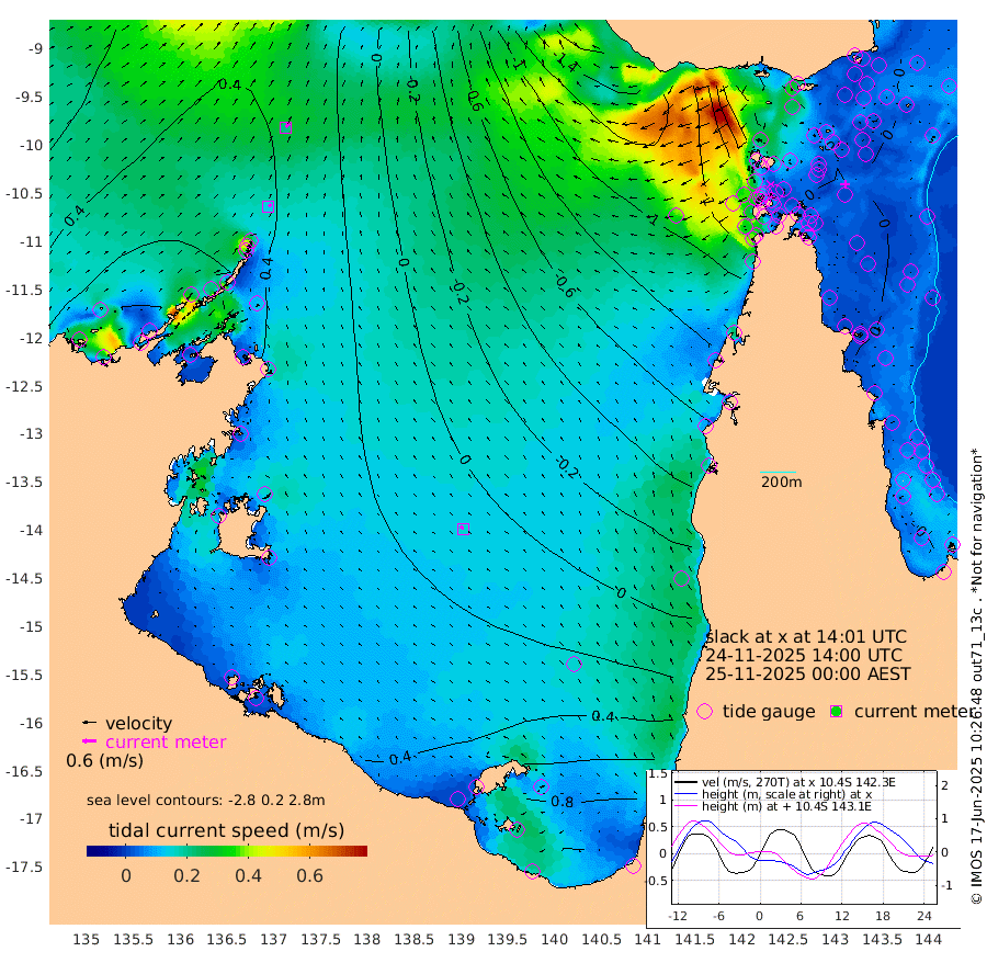 13cm/s 46T +3cm/s rms + 7cm/s -42T. ARA-GOC87 57m 16cm/s -56T +3cm/s rms + 2cm/s -2T. ARA-GOC87 60m 22cm/s 42T +2cm/s rms + 3cm/s 61T. ARA-GOC87 47m 3cm Daru 3cm Bobo Island -11cm Meer Island Barge -2cm Bramble Cay 1cm Unnamed Cay 1cm Pearce Cay -6cm Stephens Island 0cm Merrie England Shoals 1cm Mutacomal Reef -4cm Darnley Island Barge -16cm East Cay 0cm Yorke Island Barge -8cm Rennel Island -3cm Aureed Island -3cm Dungeness Reef -2cm Zagai Island -12cm Yam Island -8cm Dauan Island -9cm Saibai Island 13cm Phipi Reef 2cm Warrior Reef - West -39cm Mabuiag Island Barge -8cm Half Way Island -11cm Coconut Island -10cm Dugong Islet -12cm Poll Island -16cm Kirkcaldie Reef -24cm Suarji Island -9cm Sue Islet -111cm Hawkesbury Island -40cm Alert Patches -38cm Twin Island -86cm Badu Island -34cm St Pauls (Moa Island) -88cm Kubin (Moa Island) -56cm Ince Point -71cm Thursday Island -66cm Nardana Patches -84cm Turtle Head -100cm Round Island -114cm Goods Island -143cm Booby Island -134cm White Rocks Area -163cm Carpentaria -36cm Papou Point -168cm Bampfield Head -124cm Crab Island -141cm Red Wallis Island -110cm Packe Island -16cm Harrington Reef -136cm Herald Camp -2cm Sharp Point -73cm Red Island Point -61cm Possession Island -32cm Alpha Rock -28cm Frederick Point -7cm Wyborn Reef Light -11cm Tetley Island -16cm Triangle Reef -14cm Turtle Head Island -21cm Maclennan Cay -22cm Raine Island -7cm Mcsweeny Reef -5cm Collette Reef -11cm Shadwell Reef -1cm Hannibal Island -9cm Round Point -128cm Vrilya Point -14cm Cape Grenville -14cm Hicks Island -22cm Sir Charles Hardy Island -5cm Harvey Island -17cm Kay Reef -17cm Rocky Island -22cm Chapman Island -25cm Ham Reef -19cm Jubilee Reef -19cm Night Island -27cm Unnamed Reef No. 3 -19cm Morris Island -24cm 1st 3 Mile Opening -23cm Creech Reef -23cm Fife Island -15cm Eden Reef -21cm Stanley Island -16cm Normanby River 71cm Yabooma Island 96cm Hutchison River 82cm Elcho Island 84cm North West Crocodile Island 36cm Cape Wessel 77cm Stevens Island 61cm Guluwuru Island 68cm Hopeful Bay 50cm Auster Point 52cm Two Island Bay 98cm Cadell Strait 66cm Mallison Island 59cm Melville Bay (Gove Harbour) 50cm Truant Island 39cm Cape Arnhem 53cm Cape Grey 59cm Hawk Island 61cm Milner Bay (Groote Eylandt) 62cm Cape Beatrice 58cm West Island 54cm Centre Island 101cm Mornington Island 97cm West Wellesley Islands 145cm Bountiful Island 194cm Albert River Mouth 211cm Sweers Island 181cm Karumba 65cm Nassau River Offshore 9cm Christmas Creek -40cm Archer River -72cm Boyd Point -69cm Weipa (Humbug Point) -77cm Pennefather River -117cm Cullen Point