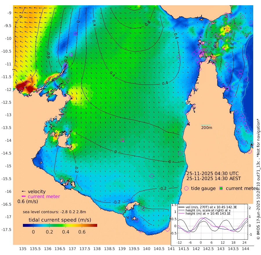 17cm/s 117T +3cm/s rms + 7cm/s -42T. ARA-GOC87 57m 32cm/s 162T +3cm/s rms + 2cm/s -2T. ARA-GOC87 60m 5cm/s 133T +2cm/s rms + 3cm/s 61T. ARA-GOC87 47m 104cm Daru 92cm Bobo Island 63cm Meer Island Barge 78cm Bramble Cay 98cm Unnamed Cay 86cm Pearce Cay 85cm Stephens Island 95cm Merrie England Shoals 108cm Mutacomal Reef 86cm Darnley Island Barge 64cm East Cay 94cm Yorke Island Barge 93cm Rennel Island 89cm Aureed Island 95cm Dungeness Reef 102cm Zagai Island 103cm Yam Island 113cm Dauan Island 111cm Saibai Island 96cm Phipi Reef 111cm Warrior Reef - West 88cm Mabuiag Island Barge 89cm Half Way Island 97cm Coconut Island 97cm Dugong Islet 98cm Poll Island 97cm Kirkcaldie Reef 93cm Suarji Island 103cm Sue Islet 85cm Hawkesbury Island 98cm Alert Patches 98cm Twin Island 82cm Badu Island 100cm St Pauls (Moa Island) 87cm Kubin (Moa Island) 92cm Ince Point 87cm Thursday Island 89cm Nardana Patches 86cm Turtle Head 82cm Round Island 75cm Goods Island 66cm Booby Island 62cm White Rocks Area 60cm Carpentaria 83cm Papou Point 89cm Bampfield Head 53cm Crab Island 70cm Red Wallis Island 88cm Packe Island 96cm Harrington Reef 92cm Herald Camp 28cm Sharp Point 63cm Red Island Point 80cm Possession Island 101cm Alpha Rock 100cm Frederick Point 109cm Wyborn Reef Light 111cm Tetley Island 68cm Triangle Reef 99cm Turtle Head Island 63cm Maclennan Cay 49cm Raine Island 90cm Mcsweeny Reef 87cm Collette Reef 70cm Shadwell Reef 90cm Hannibal Island 80cm Round Point 48cm Vrilya Point 74cm Cape Grenville 67cm Hicks Island 83cm Sir Charles Hardy Island 22cm Harvey Island 67cm Kay Reef 57cm Rocky Island 59cm Chapman Island 56cm Ham Reef 58cm Jubilee Reef 53cm Night Island 56cm Unnamed Reef No. 3 56cm Morris Island 55cm 1st 3 Mile Opening 56cm Creech Reef 58cm Fife Island 59cm Eden Reef 60cm Stanley Island 57cm Normanby River -61cm Yabooma Island -69cm Hutchison River -75cm Elcho Island -81cm North West Crocodile Island -3cm Cape Wessel -35cm Stevens Island 36cm Guluwuru Island -37cm Hopeful Bay -21cm Auster Point -21cm Two Island Bay -21cm Cadell Strait 222cm Mallison Island 18cm Melville Bay (Gove Harbour) 27cm Truant Island 20cm Cape Arnhem -13cm Cape Grey -21cm Hawk Island -58cm Milner Bay (Groote Eylandt) -61cm Cape Beatrice -82cm West Island -83cm Centre Island -69cm Mornington Island -62cm West Wellesley Islands -91cm Bountiful Island -143cm Albert River Mouth -162cm Sweers Island -135cm Karumba -23cm Nassau River Offshore 25cm Christmas Creek 37cm Archer River 53cm Boyd Point 48cm Weipa (Humbug Point) 37cm Pennefather River 56cm Cullen Point