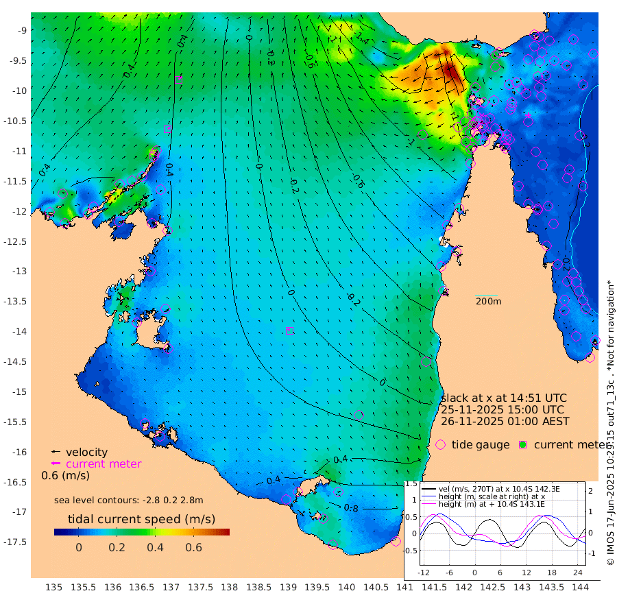 17cm/s 51T +3cm/s rms + 7cm/s -42T. ARA-GOC87 57m 16cm/s -46T +3cm/s rms + 2cm/s -2T. ARA-GOC87 60m 26cm/s 44T +2cm/s rms + 3cm/s 61T. ARA-GOC87 47m -14cm Daru -12cm Bobo Island -17cm Meer Island Barge -13cm Bramble Cay -14cm Unnamed Cay -14cm Pearce Cay -19cm Stephens Island -15cm Merrie England Shoals -18cm Mutacomal Reef -13cm Darnley Island Barge -24cm East Cay -12cm Yorke Island Barge -24cm Rennel Island -17cm Aureed Island -20cm Dungeness Reef -19cm Zagai Island -34cm Yam Island -24cm Dauan Island -24cm Saibai Island -8cm Phipi Reef -18cm Warrior Reef - West -55cm Mabuiag Island Barge -23cm Half Way Island -29cm Coconut Island -27cm Dugong Islet -31cm Poll Island -36cm Kirkcaldie Reef -44cm Suarji Island -25cm Sue Islet -132cm Hawkesbury Island -59cm Alert Patches -58cm Twin Island -108cm Badu Island -53cm St Pauls (Moa Island) -109cm Kubin (Moa Island) -75cm Ince Point -90cm Thursday Island -85cm Nardana Patches -104cm Turtle Head -118cm Round Island -134cm Goods Island -160cm Booby Island -154cm White Rocks Area -170cm Carpentaria -56cm Papou Point -180cm Bampfield Head -137cm Crab Island -159cm Red Wallis Island -132cm Packe Island -35cm Harrington Reef -154cm Herald Camp -7cm Sharp Point -93cm Red Island Point -77cm Possession Island -49cm Alpha Rock -47cm Frederick Point -25cm Wyborn Reef Light -29cm Tetley Island -23cm Triangle Reef -29cm Turtle Head Island -29cm Maclennan Cay -26cm Raine Island -19cm Mcsweeny Reef -15cm Collette Reef -17cm Shadwell Reef -12cm Hannibal Island -20cm Round Point -135cm Vrilya Point -24cm Cape Grenville -23cm Hicks Island -32cm Sir Charles Hardy Island -7cm Harvey Island -25cm Kay Reef -23cm Rocky Island -26cm Chapman Island -29cm Ham Reef -24cm Jubilee Reef -24cm Night Island -32cm Unnamed Reef No. 3 -25cm Morris Island -27cm 1st 3 Mile Opening -28cm Creech Reef -26cm Fife Island -21cm Eden Reef -26cm Stanley Island -23cm Normanby River 57cm Yabooma Island 76cm Hutchison River 67cm Elcho Island 67cm North West Crocodile Island 35cm Cape Wessel 69cm Stevens Island 63cm Guluwuru Island 62cm Hopeful Bay 49cm Auster Point 49cm Two Island Bay 91cm Cadell Strait 94cm Mallison Island 61cm Melville Bay (Gove Harbour) 53cm Truant Island 43cm Cape Arnhem 56cm Cape Grey 62cm Hawk Island 66cm Milner Bay (Groote Eylandt) 64cm Cape Beatrice 61cm West Island 58cm Centre Island 98cm Mornington Island 96cm West Wellesley Islands 135cm Bountiful Island 183cm Albert River Mouth 210cm Sweers Island 170cm Karumba 54cm Nassau River Offshore -2cm Christmas Creek -49cm Archer River -79cm Boyd Point -79cm Weipa (Humbug Point) -80cm Pennefather River -125cm Cullen Point