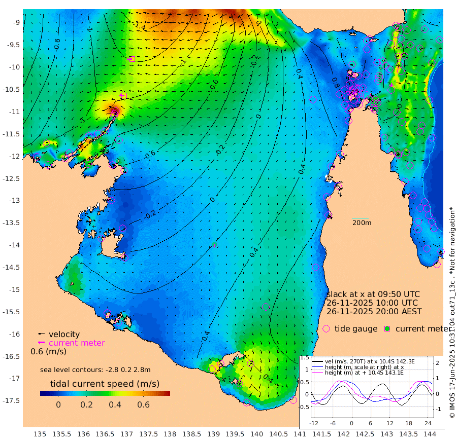 46cm/s -89T +3cm/s rms + 7cm/s -42T. ARA-GOC87 57m 21cm/s -164T +3cm/s rms + 2cm/s -2T. ARA-GOC87 60m 50cm/s -97T +2cm/s rms + 3cm/s 61T. ARA-GOC87 47m 1cm Daru -7cm Bobo Island -15cm Meer Island Barge -14cm Bramble Cay -10cm Unnamed Cay -6cm Pearce Cay -9cm Stephens Island -9cm Merrie England Shoals 3cm Mutacomal Reef -16cm Darnley Island Barge -8cm East Cay -11cm Yorke Island Barge 1cm Rennel Island -1cm Aureed Island 14cm Dungeness Reef 15cm Zagai Island 30cm Yam Island 46cm Dauan Island 34cm Saibai Island 61cm Phipi Reef 33cm Warrior Reef - West 42cm Mabuiag Island Barge 0cm Half Way Island 8cm Coconut Island 7cm Dugong Islet 20cm Poll Island 24cm Kirkcaldie Reef 41cm Suarji Island 11cm Sue Islet 78cm Hawkesbury Island 43cm Alert Patches 39cm Twin Island 66cm Badu Island 41cm St Pauls (Moa Island) 68cm Kubin (Moa Island) 52cm Ince Point 59cm Thursday Island 57cm Nardana Patches 70cm Turtle Head 73cm Round Island 77cm Goods Island 83cm Booby Island 79cm White Rocks Area 58cm Carpentaria 31cm Papou Point 71cm Bampfield Head 73cm Crab Island 88cm Red Wallis Island 90cm Packe Island 10cm Harrington Reef 100cm Herald Camp 15cm Sharp Point 65cm Red Island Point 50cm Possession Island 25cm Alpha Rock 26cm Frederick Point -3cm Wyborn Reef Light 2cm Tetley Island -3cm Triangle Reef -11cm Turtle Head Island -3cm Maclennan Cay -9cm Raine Island -7cm Mcsweeny Reef -9cm Collette Reef -11cm Shadwell Reef -13cm Hannibal Island -9cm Round Point 66cm Vrilya Point -5cm Cape Grenville -8cm Hicks Island -5cm Sir Charles Hardy Island -1cm Harvey Island -9cm Kay Reef -7cm Rocky Island -6cm Chapman Island -8cm Ham Reef -12cm Jubilee Reef -2cm Night Island -4cm Unnamed Reef No. 3 -9cm Morris Island -13cm 1st 3 Mile Opening -8cm Creech Reef -6cm Fife Island -17cm Eden Reef -10cm Stanley Island -13cm Normanby River -113cm Yabooma Island -137cm Hutchison River -116cm Elcho Island -102cm North West Crocodile Island -122cm Cape Wessel -132cm Stevens Island -146cm Guluwuru Island -109cm Hopeful Bay -122cm Auster Point -120cm Two Island Bay -154cm Cadell Strait -216cm Mallison Island -119cm Melville Bay (Gove Harbour) -131cm Truant Island -88cm Cape Arnhem -65cm Cape Grey -35cm Hawk Island -22cm Milner Bay (Groote Eylandt) -1cm Cape Beatrice 34cm West Island 36cm Centre Island 69cm Mornington Island 59cm West Wellesley Islands 77cm Bountiful Island 64cm Albert River Mouth 54cm Sweers Island 90cm Karumba 96cm Nassau River Offshore 94cm Christmas Creek 73cm Archer River 62cm Boyd Point 75cm Weipa (Humbug Point) 52cm Pennefather River 75cm Cullen Point