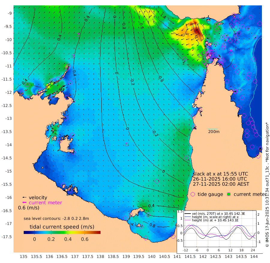 20cm/s 53T +3cm/s rms + 7cm/s -42T. ARA-GOC87 57m 17cm/s -37T +3cm/s rms + 2cm/s -2T. ARA-GOC87 60m 28cm/s 46T +2cm/s rms + 3cm/s 61T. ARA-GOC87 47m -26cm Daru -24cm Bobo Island -14cm Meer Island Barge -16cm Bramble Cay -23cm Unnamed Cay -23cm Pearce Cay -24cm Stephens Island -22cm Merrie England Shoals -32cm Mutacomal Reef -15cm Darnley Island Barge -23cm East Cay -19cm Yorke Island Barge -33cm Rennel Island -26cm Aureed Island -35cm Dungeness Reef -38cm Zagai Island -56cm Yam Island -47cm Dauan Island -45cm Saibai Island -34cm Phipi Reef -40cm Warrior Reef - West -74cm Mabuiag Island Barge -33cm Half Way Island -43cm Coconut Island -39cm Dugong Islet -48cm Poll Island -54cm Kirkcaldie Reef -64cm Suarji Island -40cm Sue Islet -147cm Hawkesbury Island -76cm Alert Patches -77cm Twin Island -126cm Badu Island -74cm St Pauls (Moa Island) -125cm Kubin (Moa Island) -92cm Ince Point -106cm Thursday Island -102cm Nardana Patches -119cm Turtle Head -129cm Round Island -146cm Goods Island -167cm Booby Island -164cm White Rocks Area -166cm Carpentaria -74cm Papou Point -180cm Bampfield Head -141cm Crab Island -168cm Red Wallis Island -146cm Packe Island -48cm Harrington Reef -163cm Herald Camp -14cm Sharp Point -109cm Red Island Point -90cm Possession Island -64cm Alpha Rock -63cm Frederick Point -37cm Wyborn Reef Light -42cm Tetley Island -25cm Triangle Reef -38cm Turtle Head Island -29cm Maclennan Cay -22cm Raine Island -24cm Mcsweeny Reef -19cm Collette Reef -15cm Shadwell Reef -16cm Hannibal Island -22cm Round Point -135cm Vrilya Point -25cm Cape Grenville -23cm Hicks Island -33cm Sir Charles Hardy Island -7cm Harvey Island -24cm Kay Reef -20cm Rocky Island -22cm Chapman Island -24cm Ham Reef -20cm Jubilee Reef -21cm Night Island -28cm Unnamed Reef No. 3 -22cm Morris Island -22cm 1st 3 Mile Opening -24cm Creech Reef -19cm Fife Island -16cm Eden Reef -21cm Stanley Island -20cm Normanby River 45cm Yabooma Island 59cm Hutchison River 53cm Elcho Island 51cm North West Crocodile Island 34cm Cape Wessel 61cm Stevens Island 62cm Guluwuru Island 57cm Hopeful Bay 47cm Auster Point 47cm Two Island Bay 82cm Cadell Strait 119cm Mallison Island 60cm Melville Bay (Gove Harbour) 55cm Truant Island 45cm Cape Arnhem 57cm Cape Grey 61cm Hawk Island 67cm Milner Bay (Groote Eylandt) 62cm Cape Beatrice 60cm West Island 57cm Centre Island 90cm Mornington Island 89cm West Wellesley Islands 118cm Bountiful Island 163cm Albert River Mouth 197cm Sweers Island 150cm Karumba 41cm Nassau River Offshore -12cm Christmas Creek -53cm Archer River -80cm Boyd Point -83cm Weipa (Humbug Point) -78cm Pennefather River -126cm Cullen Point
