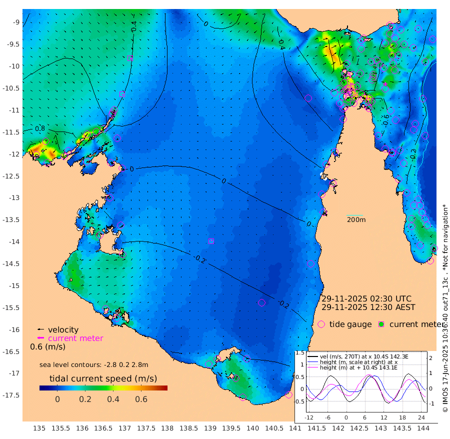 14cm/s 134T +3cm/s rms + 7cm/s -42T. ARA-GOC87 57m 8cm/s 19T +3cm/s rms + 2cm/s -2T. ARA-GOC87 60m 18cm/s 126T +2cm/s rms + 3cm/s 61T. ARA-GOC87 47m -50cm Daru -42cm Bobo Island -21cm Meer Island Barge -39cm Bramble Cay -49cm Unnamed Cay -36cm Pearce Cay -42cm Stephens Island -61cm Merrie England Shoals -56cm Mutacomal Reef -38cm Darnley Island Barge -25cm East Cay -39cm Yorke Island Barge -41cm Rennel Island -35cm Aureed Island -30cm Dungeness Reef -8cm Zagai Island -7cm Yam Island 27cm Dauan Island 25cm Saibai Island 7cm Phipi Reef -12cm Warrior Reef - West 37cm Mabuiag Island Barge -42cm Half Way Island -34cm Coconut Island -37cm Dugong Islet -21cm Poll Island -28cm Kirkcaldie Reef 3cm Suarji Island -21cm Sue Islet 84cm Hawkesbury Island 1cm Alert Patches 1cm Twin Island 78cm Badu Island 6cm St Pauls (Moa Island) 60cm Kubin (Moa Island) 22cm Ince Point 36cm Thursday Island 33cm Nardana Patches 52cm Turtle Head 66cm Round Island 83cm Goods Island 99cm Booby Island 96cm White Rocks Area 86cm Carpentaria 15cm Papou Point 110cm Bampfield Head 75cm Crab Island 88cm Red Wallis Island 58cm Packe Island -42cm Harrington Reef 86cm Herald Camp -8cm Sharp Point 49cm Red Island Point 28cm Possession Island -14cm Alpha Rock -19cm Frederick Point -46cm Wyborn Reef Light -41cm Tetley Island -16cm Triangle Reef -36cm Turtle Head Island -15cm Maclennan Cay -9cm Raine Island -44cm Mcsweeny Reef -44cm Collette Reef -27cm Shadwell Reef -50cm Hannibal Island -42cm Round Point 62cm Vrilya Point -38cm Cape Grenville -25cm Hicks Island -16cm Sir Charles Hardy Island -11cm Harvey Island -32cm Kay Reef -16cm Rocky Island -10cm Chapman Island -9cm Ham Reef -14cm Jubilee Reef -21cm Night Island -13cm Unnamed Reef No. 3 -19cm Morris Island -7cm 1st 3 Mile Opening -14cm Creech Reef -29cm Fife Island -16cm Eden Reef -23cm Stanley Island -24cm Normanby River 103cm Yabooma Island 110cm Hutchison River 93cm Elcho Island 89cm North West Crocodile Island 64cm Cape Wessel 68cm Stevens Island 37cm Guluwuru Island 63cm Hopeful Bay 68cm Auster Point 67cm Two Island Bay 74cm Cadell Strait -87cm Mallison Island 32cm Melville Bay (Gove Harbour) 40cm Truant Island 18cm Cape Arnhem 4cm Cape Grey -16cm Hawk Island -25cm Milner Bay (Groote Eylandt) -37cm Cape Beatrice -59cm West Island -55cm Centre Island -86cm Mornington Island -80cm West Wellesley Islands -74cm Bountiful Island -92cm Albert River Mouth -107cm Sweers Island -99cm Karumba -68cm Nassau River Offshore -36cm Christmas Creek 5cm Archer River 28cm Boyd Point 36cm Weipa (Humbug Point) 19cm Pennefather River 58cm Cullen Point