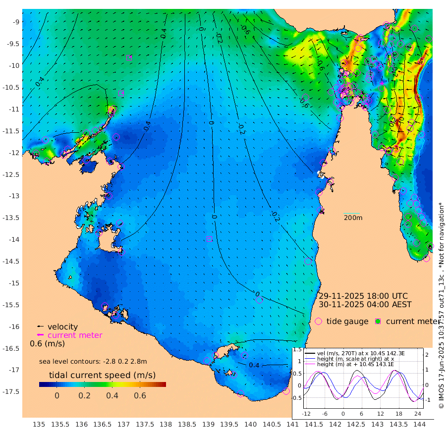 18cm/s 80T +3cm/s rms + 7cm/s -42T. ARA-GOC87 57m 11cm/s -41T +3cm/s rms + 2cm/s -2T. ARA-GOC87 60m 23cm/s 66T +2cm/s rms + 3cm/s 61T. ARA-GOC87 47m -41cm Daru -33cm Bobo Island 17cm Meer Island Barge 2cm Bramble Cay -22cm Unnamed Cay -21cm Pearce Cay -10cm Stephens Island -17cm Merrie England Shoals -49cm Mutacomal Reef -2cm Darnley Island Barge 11cm East Cay -22cm Yorke Island Barge -33cm Rennel Island -31cm Aureed Island -51cm Dungeness Reef -81cm Zagai Island -96cm Yam Island -94cm Dauan Island -101cm Saibai Island -83cm Phipi Reef -86cm Warrior Reef - West -107cm Mabuiag Island Barge -34cm Half Way Island -58cm Coconut Island -49cm Dugong Islet -75cm Poll Island -75cm Kirkcaldie Reef -99cm Suarji Island -73cm Sue Islet -118cm Hawkesbury Island -98cm Alert Patches -102cm Twin Island -112cm Badu Island -107cm St Pauls (Moa Island) -108cm Kubin (Moa Island) -106cm Ince Point -109cm Thursday Island -108cm Nardana Patches -103cm Turtle Head -104cm Round Island -103cm Goods Island -108cm Booby Island -113cm White Rocks Area -106cm Carpentaria -100cm Papou Point -109cm Bampfield Head -87cm Crab Island -115cm Red Wallis Island -113cm Packe Island -58cm Harrington Reef -117cm Herald Camp -34cm Sharp Point -102cm Red Island Point -92cm Possession Island -93cm Alpha Rock -83cm Frederick Point -53cm Wyborn Reef Light -63cm Tetley Island -5cm Triangle Reef -40cm Turtle Head Island 1cm Maclennan Cay 21cm Raine Island -17cm Mcsweeny Reef -9cm Collette Reef 10cm Shadwell Reef -5cm Hannibal Island 2cm Round Point -79cm Vrilya Point 0cm Cape Grenville 7cm Hicks Island -4cm Sir Charles Hardy Island 1cm Harvey Island 10cm Kay Reef 17cm Rocky Island 17cm Chapman Island 16cm Ham Reef 18cm Jubilee Reef 16cm Night Island 14cm Unnamed Reef No. 3 20cm Morris Island 23cm 1st 3 Mile Opening 19cm Creech Reef 28cm Fife Island 33cm Eden Reef 23cm Stanley Island 23cm Normanby River 68cm Yabooma Island 84cm Hutchison River 76cm Elcho Island 65cm North West Crocodile Island 47cm Cape Wessel 74cm Stevens Island 66cm Guluwuru Island 74cm Hopeful Bay 63cm Auster Point 64cm Two Island Bay 95cm Cadell Strait 109cm Mallison Island 65cm Melville Bay (Gove Harbour) 64cm Truant Island 48cm Cape Arnhem 43cm Cape Grey 43cm Hawk Island 37cm Milner Bay (Groote Eylandt) 32cm Cape Beatrice 16cm West Island 16cm Centre Island 43cm Mornington Island 41cm West Wellesley Islands 49cm Bountiful Island 86cm Albert River Mouth 114cm Sweers Island 78cm Karumba 15cm Nassau River Offshore -12cm Christmas Creek -26cm Archer River -44cm Boyd Point -42cm Weipa (Humbug Point) -36cm Pennefather River -76cm Cullen Point