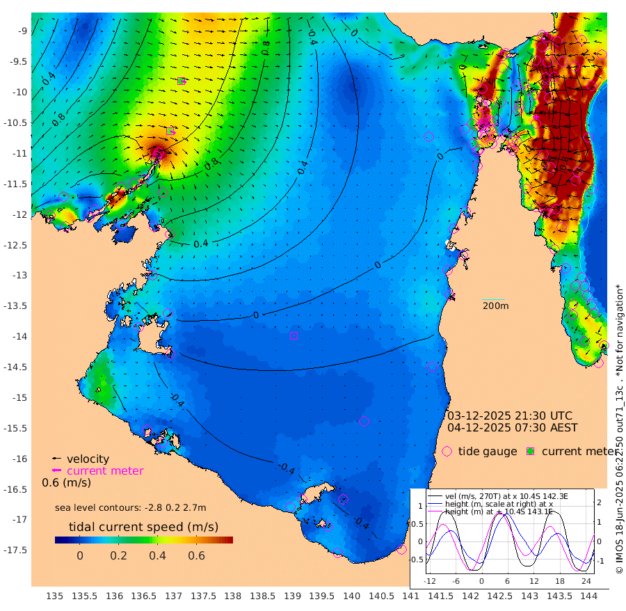 38cm/s 116T +3cm/s rms + 7cm/s -42T. ARA-GOC87 57m 4cm/s 169T +3cm/s rms + 2cm/s -2T. ARA-GOC87 60m 36cm/s 110T +2cm/s rms + 3cm/s 61T. ARA-GOC87 47m 36cm Daru 54cm Bobo Island 94cm Meer Island Barge 92cm Bramble Cay 65cm Unnamed Cay 73cm Pearce Cay 82cm Stephens Island 75cm Merrie England Shoals 35cm Mutacomal Reef 79cm Darnley Island Barge 100cm East Cay 53cm Yorke Island Barge 55cm Rennel Island 48cm Aureed Island 23cm Dungeness Reef -34cm Zagai Island -39cm Yam Island -81cm Dauan Island -89cm Saibai Island -66cm Phipi Reef -44cm Warrior Reef - West -67cm Mabuiag Island Barge 54cm Half Way Island 29cm Coconut Island 34cm Dugong Islet -6cm Poll Island 3cm Kirkcaldie Reef -43cm Suarji Island -19cm Sue Islet 0cm Hawkesbury Island -28cm Alert Patches -27cm Twin Island -9cm Badu Island -48cm St Pauls (Moa Island) -8cm Kubin (Moa Island) -33cm Ince Point -28cm Thursday Island -31cm Nardana Patches -9cm Turtle Head -6cm Round Island 17cm Goods Island 20cm Booby Island 18cm White Rocks Area 11cm Carpentaria -30cm Papou Point 30cm Bampfield Head 21cm Crab Island 11cm Red Wallis Island 2cm Packe Island 36cm Harrington Reef -7cm Herald Camp -33cm Sharp Point -10cm Red Island Point -17cm Possession Island -31cm Alpha Rock -2cm Frederick Point 33cm Wyborn Reef Light 19cm Tetley Island 67cm Triangle Reef 60cm Turtle Head Island 83cm Maclennan Cay 97cm Raine Island 65cm Mcsweeny Reef 69cm Collette Reef 80cm Shadwell Reef 82cm Hannibal Island 97cm Round Point 20cm Vrilya Point 87cm Cape Grenville 93cm Hicks Island 87cm Sir Charles Hardy Island 27cm Harvey Island 98cm Kay Reef 94cm Rocky Island 95cm Chapman Island 92cm Ham Reef 95cm Jubilee Reef 87cm Night Island 95cm Unnamed Reef No. 3 104cm Morris Island 101cm 1st 3 Mile Opening 99cm Creech Reef 102cm Fife Island 127cm Eden Reef 105cm Stanley Island 115cm Normanby River 147cm Yabooma Island 190cm Hutchison River 157cm Elcho Island 138cm North West Crocodile Island 111cm Cape Wessel 141cm Stevens Island 125cm Guluwuru Island 128cm Hopeful Bay 123cm Auster Point 123cm Two Island Bay 172cm Cadell Strait 121cm Mallison Island 106cm Melville Bay (Gove Harbour) 115cm Truant Island 70cm Cape Arnhem 32cm Cape Grey 10cm Hawk Island -33cm Milner Bay (Groote Eylandt) -39cm Cape Beatrice -94cm West Island -92cm Centre Island -79cm Mornington Island -85cm West Wellesley Islands -102cm Bountiful Island -96cm Albert River Mouth -106cm Sweers Island -99cm Karumba -57cm Nassau River Offshore -28cm Christmas Creek 9cm Archer River 11cm Boyd Point 15cm Weipa (Humbug Point) 23cm Pennefather River 5cm Cullen Point