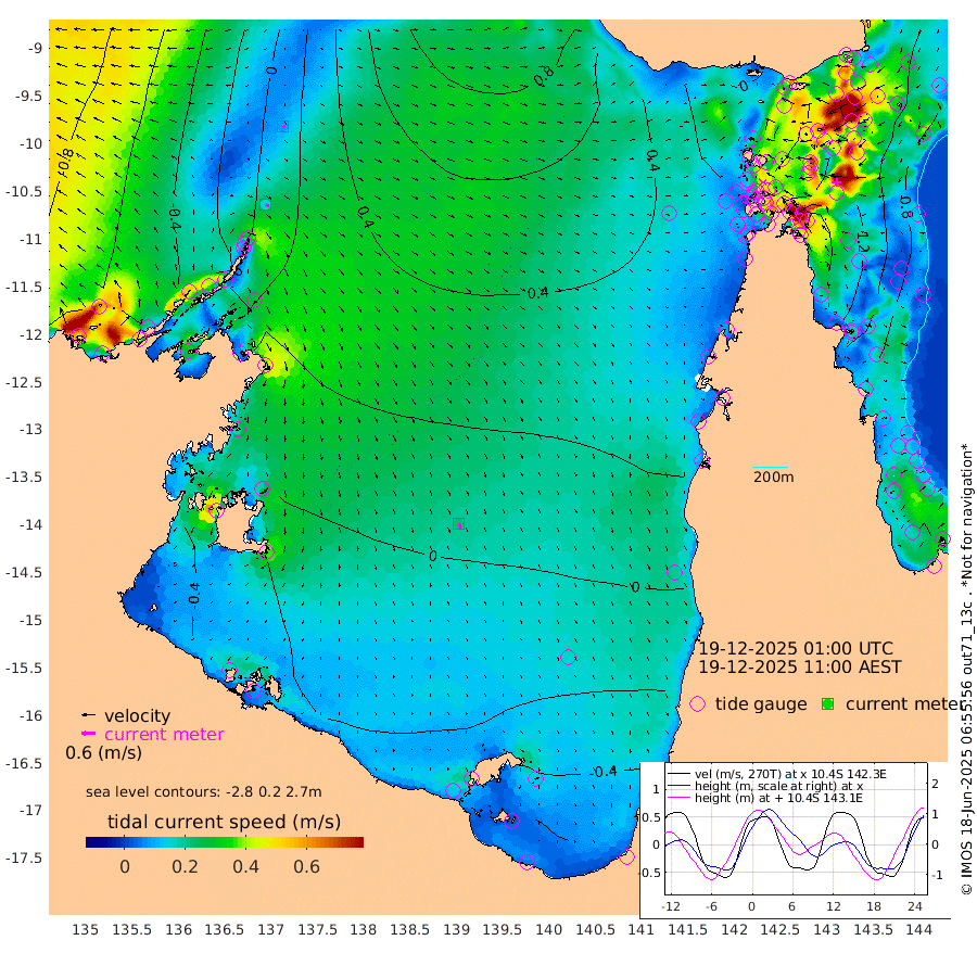 16cm/s 123T +3cm/s rms + 7cm/s -42T. ARA-GOC87 57m 22cm/s 160T +3cm/s rms + 2cm/s -2T. ARA-GOC87 60m 8cm/s 127T +2cm/s rms + 3cm/s 61T. ARA-GOC87 47m 134cm Daru 138cm Bobo Island 83cm Meer Island Barge 108cm Bramble Cay 130cm Unnamed Cay 136cm Pearce Cay 121cm Stephens Island 130cm Merrie England Shoals 142cm Mutacomal Reef 115cm Darnley Island Barge 93cm East Cay 125cm Yorke Island Barge 131cm Rennel Island 134cm Aureed Island 131cm Dungeness Reef 123cm Zagai Island 119cm Yam Island 95cm Dauan Island 98cm Saibai Island 105cm Phipi Reef 125cm Warrior Reef - West 90cm Mabuiag Island Barge 124cm Half Way Island 143cm Coconut Island 131cm Dugong Islet 131cm Poll Island 127cm Kirkcaldie Reef 135cm Suarji Island 127cm Sue Islet 92cm Hawkesbury Island 131cm Alert Patches 131cm Twin Island 89cm Badu Island 124cm St Pauls (Moa Island) 94cm Kubin (Moa Island) 111cm Ince Point 104cm Thursday Island 105cm Nardana Patches 98cm Turtle Head 94cm Round Island 84cm Goods Island 70cm Booby Island 76cm White Rocks Area 62cm Carpentaria 111cm Papou Point 104cm Bampfield Head 52cm Crab Island 74cm Red Wallis Island 94cm Packe Island 146cm Harrington Reef 86cm Herald Camp 31cm Sharp Point 86cm Red Island Point 113cm Possession Island 123cm Alpha Rock 138cm Frederick Point 147cm Wyborn Reef Light 147cm Tetley Island 91cm Triangle Reef 146cm Turtle Head Island 85cm Maclennan Cay 64cm Raine Island 123cm Mcsweeny Reef 117cm Collette Reef 86cm Shadwell Reef 124cm Hannibal Island 115cm Round Point 43cm Vrilya Point 102cm Cape Grenville 93cm Hicks Island 100cm Sir Charles Hardy Island 30cm Harvey Island 92cm Kay Reef 76cm Rocky Island 79cm Chapman Island 71cm Ham Reef 73cm Jubilee Reef 69cm Night Island 75cm Unnamed Reef No. 3 77cm Morris Island 69cm 1st 3 Mile Opening 74cm Creech Reef 73cm Fife Island 81cm Eden Reef 77cm Stanley Island 82cm Normanby River -42cm Yabooma Island -29cm Hutchison River -43cm Elcho Island -51cm North West Crocodile Island 10cm Cape Wessel -20cm Stevens Island 34cm Guluwuru Island -20cm Hopeful Bay -3cm Auster Point -15cm Two Island Bay -12cm Cadell Strait 112cm Mallison Island 20cm Melville Bay (Gove Harbour) 29cm Truant Island 20cm Cape Arnhem -4cm Cape Grey -9cm Hawk Island -50cm Milner Bay (Groote Eylandt) -53cm Cape Beatrice -76cm West Island -70cm Centre Island -64cm Mornington Island -63cm West Wellesley Islands -89cm Bountiful Island -141cm Albert River Mouth -146cm Sweers Island -127cm Karumba -35cm Nassau River Offshore 8cm Christmas Creek 31cm Archer River 43cm Boyd Point 37cm Weipa (Humbug Point) 34cm Pennefather River 44cm Cullen Point
