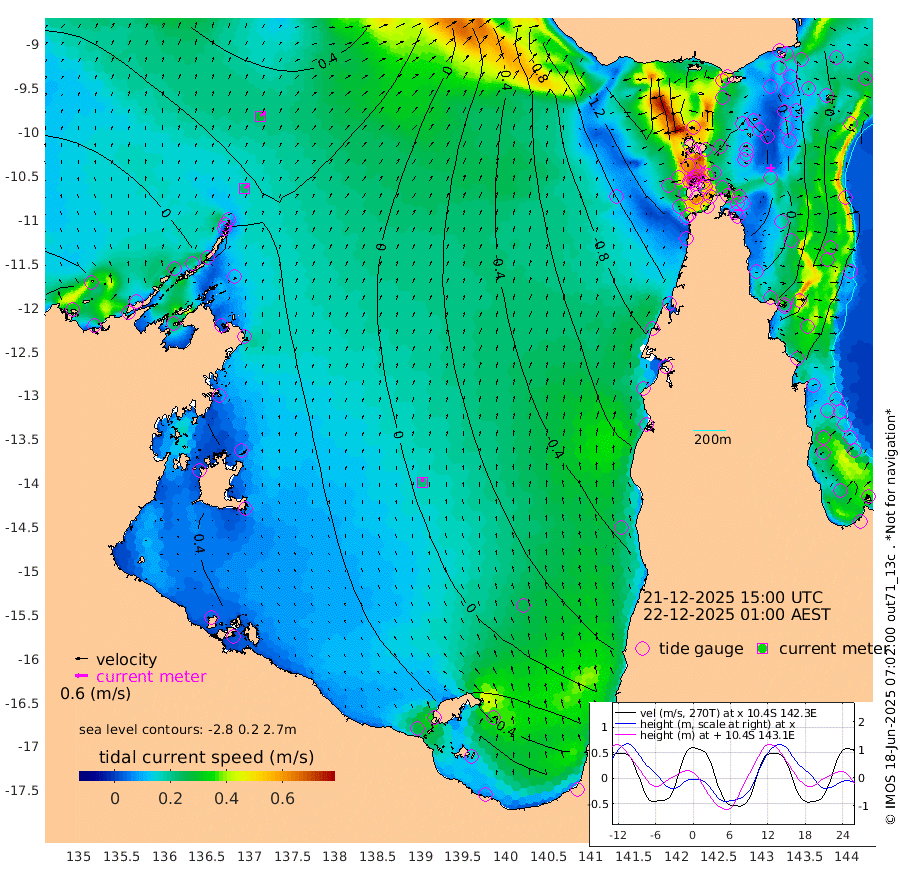 23cm/s 47T +3cm/s rms + 7cm/s -42T. ARA-GOC87 57m 23cm/s -2T +3cm/s rms + 2cm/s -2T. ARA-GOC87 60m 28cm/s 47T +2cm/s rms + 3cm/s 61T. ARA-GOC87 47m -10cm Daru -5cm Bobo Island -47cm Meer Island Barge -33cm Bramble Cay -22cm Unnamed Cay -18cm Pearce Cay -31cm Stephens Island -20cm Merrie England Shoals -6cm Mutacomal Reef -29cm Darnley Island Barge -50cm East Cay -17cm Yorke Island Barge -24cm Rennel Island -11cm Aureed Island -22cm Dungeness Reef 0cm Zagai Island -17cm Yam Island -30cm Dauan Island -12cm Saibai Island -34cm Phipi Reef -7cm Warrior Reef - West -41cm Mabuiag Island Barge -23cm Half Way Island -12cm Coconut Island -22cm Dugong Islet -12cm Poll Island -26cm Kirkcaldie Reef -19cm Suarji Island -7cm Sue Islet -161cm Hawkesbury Island -41cm Alert Patches -33cm Twin Island -126cm Badu Island -29cm St Pauls (Moa Island) -123cm Kubin (Moa Island) -61cm Ince Point -81cm Thursday Island -75cm Nardana Patches -115cm Turtle Head -141cm Round Island -161cm Goods Island -184cm Booby Island -165cm White Rocks Area -151cm Carpentaria -34cm Papou Point -205cm Bampfield Head -156cm Crab Island -167cm Red Wallis Island -142cm Packe Island -15cm Harrington Reef -192cm Herald Camp 6cm Sharp Point -100cm Red Island Point -78cm Possession Island -14cm Alpha Rock -23cm Frederick Point -6cm Wyborn Reef Light -6cm Tetley Island -38cm Triangle Reef -28cm Turtle Head Island -53cm Maclennan Cay -59cm Raine Island -22cm Mcsweeny Reef -25cm Collette Reef -42cm Shadwell Reef -25cm Hannibal Island -37cm Round Point -144cm Vrilya Point -43cm Cape Grenville -51cm Hicks Island -59cm Sir Charles Hardy Island -15cm Harvey Island -49cm Kay Reef -55cm Rocky Island -54cm Chapman Island -57cm Ham Reef -55cm Jubilee Reef -50cm Night Island -55cm Unnamed Reef No. 3 -58cm Morris Island -67cm 1st 3 Mile Opening -60cm Creech Reef -47cm Fife Island -66cm Eden Reef -60cm Stanley Island -56cm Normanby River -16cm Yabooma Island -13cm Hutchison River -5cm Elcho Island -2cm North West Crocodile Island 28cm Cape Wessel 26cm Stevens Island 37cm Guluwuru Island 13cm Hopeful Bay 16cm Auster Point 10cm Two Island Bay 24cm Cadell Strait 131cm Mallison Island 36cm Melville Bay (Gove Harbour) 34cm Truant Island 33cm Cape Arnhem 45cm Cape Grey 49cm Hawk Island 75cm Milner Bay (Groote Eylandt) 68cm Cape Beatrice 85cm West Island 80cm Centre Island 70cm Mornington Island 77cm West Wellesley Islands 79cm Bountiful Island 119cm Albert River Mouth 147cm Sweers Island 96cm Karumba 13cm Nassau River Offshore -44cm Christmas Creek -86cm Archer River -103cm Boyd Point -119cm Weipa (Humbug Point) -98cm Pennefather River -139cm Cullen Point