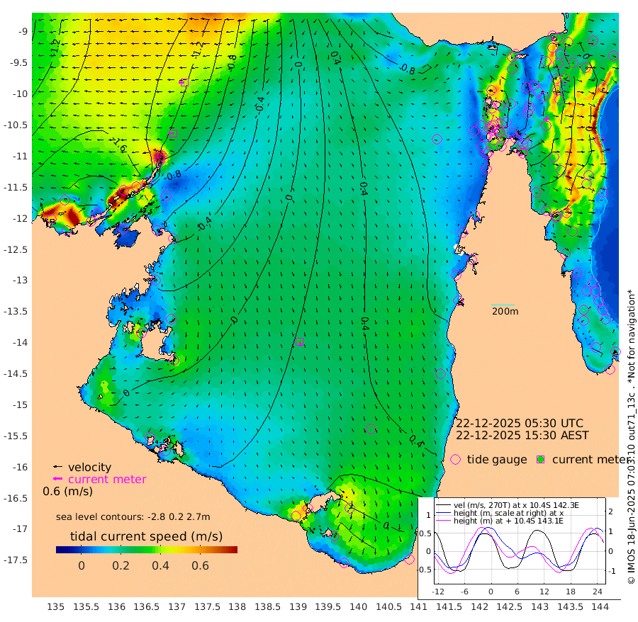 31cm/s -86T +3cm/s rms + 7cm/s -42T. ARA-GOC87 57m 31cm/s 171T +3cm/s rms + 2cm/s -2T. ARA-GOC87 60m 41cm/s -92T +2cm/s rms + 3cm/s 61T. ARA-GOC87 47m 46cm Daru 31cm Bobo Island -1cm Meer Island Barge 1cm Bramble Cay 19cm Unnamed Cay 21cm Pearce Cay 15cm Stephens Island 12cm Merrie England Shoals 39cm Mutacomal Reef 15cm Darnley Island Barge 4cm East Cay 30cm Yorke Island Barge 35cm Rennel Island 39cm Aureed Island 54cm Dungeness Reef 84cm Zagai Island 89cm Yam Island 132cm Dauan Island 127cm Saibai Island 118cm Phipi Reef 105cm Warrior Reef - West 106cm Mabuiag Island Barge 28cm Half Way Island 53cm Coconut Island 44cm Dugong Islet 69cm Poll Island 67cm Kirkcaldie Reef 99cm Suarji Island 74cm Sue Islet 103cm Hawkesbury Island 96cm Alert Patches 92cm Twin Island 99cm Badu Island 102cm St Pauls (Moa Island) 100cm Kubin (Moa Island) 100cm Ince Point 101cm Thursday Island 102cm Nardana Patches 104cm Turtle Head 103cm Round Island 94cm Goods Island 97cm Booby Island 87cm White Rocks Area 91cm Carpentaria 81cm Papou Point 110cm Bampfield Head 84cm Crab Island 103cm Red Wallis Island 110cm Packe Island 48cm Harrington Reef 130cm Herald Camp 35cm Sharp Point 89cm Red Island Point 92cm Possession Island 82cm Alpha Rock 76cm Frederick Point 44cm Wyborn Reef Light 53cm Tetley Island 20cm Triangle Reef 28cm Turtle Head Island 12cm Maclennan Cay -2cm Raine Island 25cm Mcsweeny Reef 20cm Collette Reef 10cm Shadwell Reef 12cm Hannibal Island 5cm Round Point 77cm Vrilya Point 8cm Cape Grenville 6cm Hicks Island 20cm Sir Charles Hardy Island 3cm Harvey Island -1cm Kay Reef 2cm Rocky Island 6cm Chapman Island 6cm Ham Reef 0cm Jubilee Reef 5cm Night Island 6cm Unnamed Reef No. 3 -3cm Morris Island -3cm 1st 3 Mile Opening 2cm Creech Reef 9cm Fife Island -16cm Eden Reef -4cm Stanley Island -12cm Normanby River -193cm Yabooma Island -228cm Hutchison River -205cm Elcho Island -196cm North West Crocodile Island -124cm Cape Wessel -184cm Stevens Island -114cm Guluwuru Island -161cm Hopeful Bay -145cm Auster Point -148cm Two Island Bay -189cm Cadell Strait -40cm Mallison Island -105cm Melville Bay (Gove Harbour) -106cm Truant Island -65cm Cape Arnhem -60cm Cape Grey -45cm Hawk Island -50cm Milner Bay (Groote Eylandt) -36cm Cape Beatrice -10cm West Island -9cm Centre Island 13cm Mornington Island 13cm West Wellesley Islands -1cm Bountiful Island -54cm Albert River Mouth -66cm Sweers Island -27cm Karumba 49cm Nassau River Offshore 79cm Christmas Creek 70cm Archer River 80cm Boyd Point 80cm Weipa (Humbug Point) 57cm Pennefather River 92cm Cullen Point