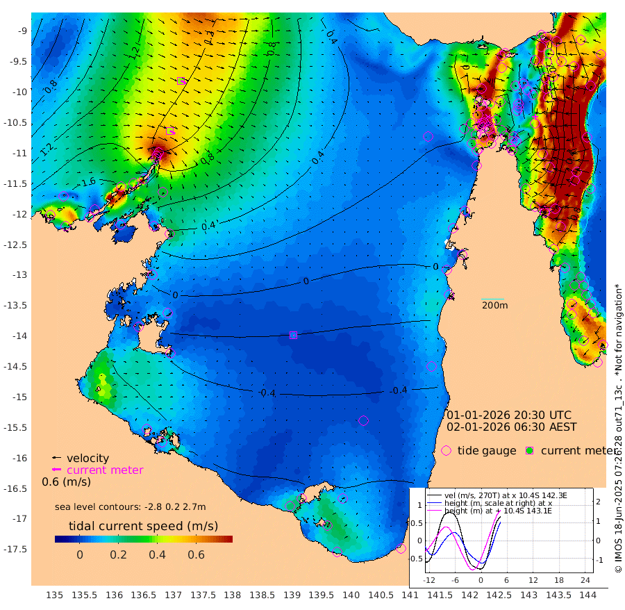 40cm/s 120T +3cm/s rms + 7cm/s -42T. ARA-GOC87 57m 5cm/s 131T +3cm/s rms + 2cm/s -2T. ARA-GOC87 60m 39cm/s 116T +2cm/s rms + 3cm/s 61T. ARA-GOC87 47m -39cm Daru -19cm Bobo Island 54cm Meer Island Barge 36cm Bramble Cay -6cm Unnamed Cay 3cm Pearce Cay 15cm Stephens Island 3cm Merrie England Shoals -41cm Mutacomal Reef 20cm Darnley Island Barge 54cm East Cay -11cm Yorke Island Barge -17cm Rennel Island -19cm Aureed Island -47cm Dungeness Reef -87cm Zagai Island -92cm Yam Island -107cm Dauan Island -106cm Saibai Island -111cm Phipi Reef -99cm Warrior Reef - West -80cm Mabuiag Island Barge -16cm Half Way Island -41cm Coconut Island -37cm Dugong Islet -68cm Poll Island -63cm Kirkcaldie Reef -100cm Suarji Island -73cm Sue Islet 13cm Hawkesbury Island -77cm Alert Patches -76cm Twin Island -4cm Badu Island -94cm St Pauls (Moa Island) -16cm Kubin (Moa Island) -64cm Ince Point -49cm Thursday Island -55cm Nardana Patches -22cm Turtle Head -13cm Round Island 26cm Goods Island 46cm Booby Island 34cm White Rocks Area 48cm Carpentaria -68cm Papou Point 44cm Bampfield Head 41cm Crab Island 33cm Red Wallis Island -2cm Packe Island -43cm Harrington Reef 1cm Herald Camp -46cm Sharp Point -18cm Red Island Point -51cm Possession Island -78cm Alpha Rock -63cm Frederick Point -40cm Wyborn Reef Light -50cm Tetley Island 31cm Triangle Reef -15cm Turtle Head Island 43cm Maclennan Cay 69cm Raine Island 0cm Mcsweeny Reef 9cm Collette Reef 40cm Shadwell Reef 16cm Hannibal Island 38cm Round Point 47cm Vrilya Point 35cm Cape Grenville 44cm Hicks Island 45cm Sir Charles Hardy Island 10cm Harvey Island 56cm Kay Reef 60cm Rocky Island 68cm Chapman Island 67cm Ham Reef 65cm Jubilee Reef 53cm Night Island 68cm Unnamed Reef No. 3 68cm Morris Island 69cm 1st 3 Mile Opening 66cm Creech Reef 64cm Fife Island 92cm Eden Reef 69cm Stanley Island 74cm Normanby River 161cm Yabooma Island 196cm Hutchison River 170cm Elcho Island 152cm North West Crocodile Island 121cm Cape Wessel 148cm Stevens Island 119cm Guluwuru Island 138cm Hopeful Bay 129cm Auster Point 134cm Two Island Bay 176cm Cadell Strait 112cm Mallison Island 100cm Melville Bay (Gove Harbour) 111cm Truant Island 64cm Cape Arnhem 22cm Cape Grey -4cm Hawk Island -44cm Milner Bay (Groote Eylandt) -53cm Cape Beatrice -108cm West Island -107cm Centre Island -118cm Mornington Island -122cm West Wellesley Islands -139cm Bountiful Island -139cm Albert River Mouth -150cm Sweers Island -146cm Karumba -87cm Nassau River Offshore -50cm Christmas Creek 8cm Archer River 19cm Boyd Point 24cm Weipa (Humbug Point) 34cm Pennefather River 28cm Cullen Point