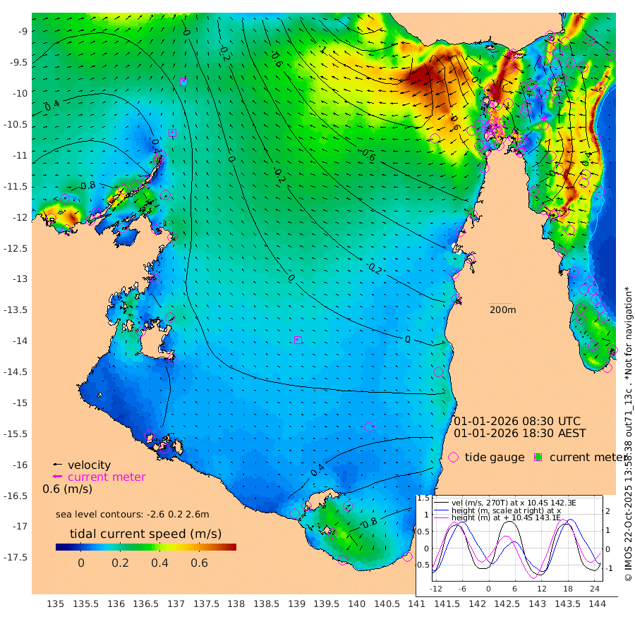 13cm/s -35T +3cm/s rms + 7cm/s -42T. ARA-GOC87 57m 14cm/s -77T +3cm/s rms + 2cm/s -2T. ARA-GOC87 60m 13cm/s -5T +2cm/s rms + 3cm/s 61T. ARA-GOC87 47m -26cm Daru -16cm Bobo Island 31cm Meer Island Barge 22cm Bramble Cay -5cm Unnamed Cay -9cm Pearce Cay 6cm Stephens Island -3cm Merrie England Shoals -29cm Mutacomal Reef 10cm Darnley Island Barge 37cm East Cay -10cm Yorke Island Barge -18cm Rennel Island -17cm Aureed Island -36cm Dungeness Reef -65cm Zagai Island -63cm Yam Island -76cm Dauan Island -74cm Saibai Island -56cm Phipi Reef -60cm Warrior Reef - West -95cm Mabuiag Island Barge -21cm Half Way Island -46cm Coconut Island -34cm Dugong Islet -62cm Poll Island -55cm Kirkcaldie Reef -83cm Suarji Island -63cm Sue Islet -96cm Hawkesbury Island -97cm Alert Patches -92cm Twin Island -102cm Badu Island -101cm St Pauls (Moa Island) -89cm Kubin (Moa Island) -98cm Ince Point -102cm Thursday Island -101cm Nardana Patches -93cm Turtle Head -82cm Round Island -91cm Goods Island -103cm Booby Island -101cm White Rocks Area -114cm Carpentaria -84cm Papou Point -101cm Bampfield Head -89cm Crab Island -103cm Red Wallis Island -89cm Packe Island -46cm Harrington Reef -72cm Herald Camp -31cm Sharp Point -76cm Red Island Point -82cm Possession Island -82cm Alpha Rock -72cm Frederick Point -44cm Wyborn Reef Light -54cm Tetley Island 10cm Triangle Reef -48cm Turtle Head Island 25cm Maclennan Cay 36cm Raine Island -8cm Mcsweeny Reef 2cm Collette Reef 21cm Shadwell Reef 8cm Hannibal Island 20cm Round Point -99cm Vrilya Point 22cm Cape Grenville 31cm Hicks Island 35cm Sir Charles Hardy Island 8cm Harvey Island 34cm Kay Reef 41cm Rocky Island 40cm Chapman Island 39cm Ham Reef 36cm Jubilee Reef 31cm Night Island 36cm Unnamed Reef No. 3 41cm Morris Island 33cm 1st 3 Mile Opening 36cm Creech Reef 39cm Fife Island 56cm Eden Reef 41cm Stanley Island 51cm Normanby River 87cm Yabooma Island 101cm Hutchison River 88cm Elcho Island 88cm North West Crocodile Island 42cm Cape Wessel 66cm Stevens Island 48cm Guluwuru Island 76cm Hopeful Bay 49cm Auster Point 58cm Two Island Bay 84cm Cadell Strait 37cm Mallison Island 46cm Melville Bay (Gove Harbour) 39cm Truant Island 27cm Cape Arnhem 31cm Cape Grey 35cm Hawk Island 31cm Milner Bay (Groote Eylandt) 36cm Cape Beatrice 27cm West Island 26cm Centre Island 85cm Mornington Island 76cm West Wellesley Islands 132cm Bountiful Island 153cm Albert River Mouth 155cm Sweers Island 153cm Karumba 72cm Nassau River Offshore 39cm Christmas Creek -5cm Archer River -33cm Boyd Point -19cm Weipa (Humbug Point) -65cm Pennefather River -70cm Cullen Point