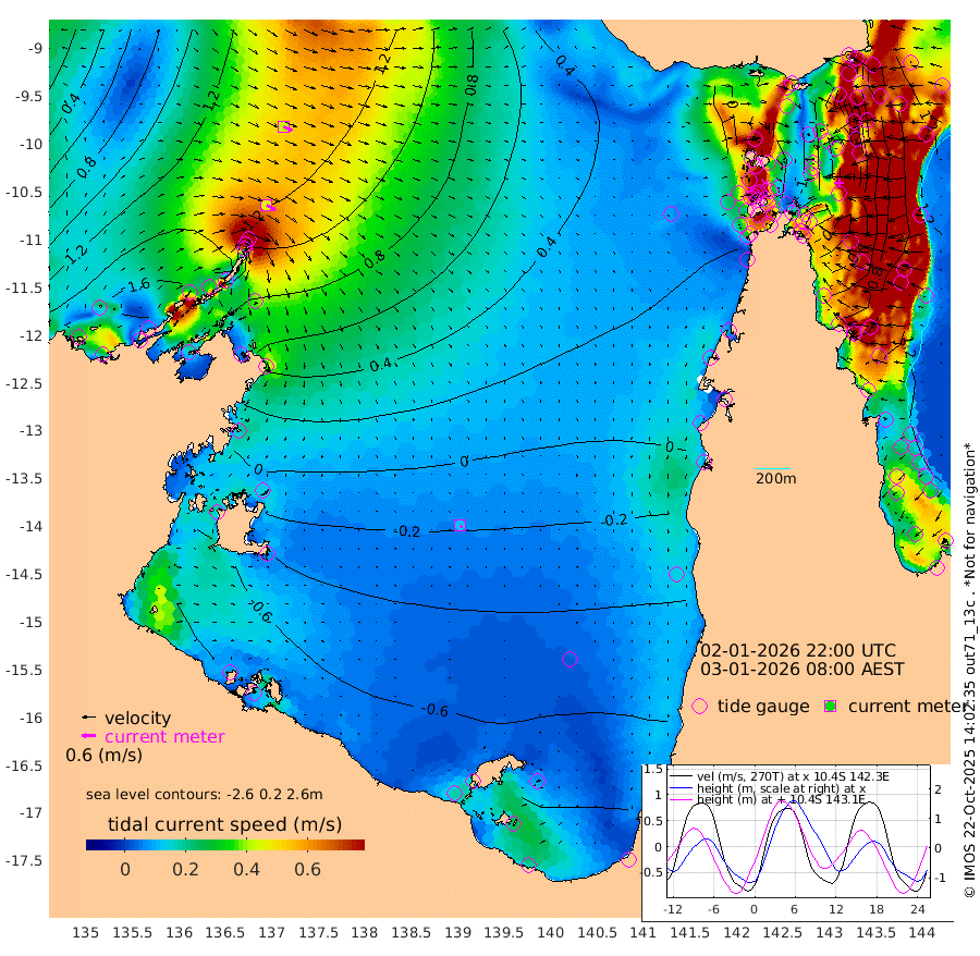 45cm/s 119T +3cm/s rms + 7cm/s -42T. ARA-GOC87 57m 12cm/s 154T +3cm/s rms + 2cm/s -2T. ARA-GOC87 60m 42cm/s 116T +2cm/s rms + 3cm/s 61T. ARA-GOC87 47m 30cm Daru 53cm Bobo Island 100cm Meer Island Barge 97cm Bramble Cay 67cm Unnamed Cay 76cm Pearce Cay 83cm Stephens Island 77cm Merrie England Shoals 36cm Mutacomal Reef 82cm Darnley Island Barge 106cm East Cay 55cm Yorke Island Barge 54cm Rennel Island 49cm Aureed Island 21cm Dungeness Reef -34cm Zagai Island -35cm Yam Island -76cm Dauan Island -75cm Saibai Island -73cm Phipi Reef -46cm Warrior Reef - West -49cm Mabuiag Island Barge 54cm Half Way Island 27cm Coconut Island 36cm Dugong Islet -5cm Poll Island 2cm Kirkcaldie Reef -42cm Suarji Island -13cm Sue Islet 48cm Hawkesbury Island -21cm Alert Patches -18cm Twin Island 25cm Badu Island -41cm St Pauls (Moa Island) 21cm Kubin (Moa Island) -18cm Ince Point -8cm Thursday Island -13cm Nardana Patches 15cm Turtle Head 21cm Round Island 55cm Goods Island 66cm Booby Island 62cm White Rocks Area 59cm Carpentaria -19cm Papou Point 74cm Bampfield Head 52cm Crab Island 56cm Red Wallis Island 34cm Packe Island 34cm Harrington Reef 32cm Herald Camp -34cm Sharp Point 16cm Red Island Point -5cm Possession Island -22cm Alpha Rock 2cm Frederick Point 35cm Wyborn Reef Light 22cm Tetley Island 76cm Triangle Reef 62cm Turtle Head Island 91cm Maclennan Cay 104cm Raine Island 66cm Mcsweeny Reef 71cm Collette Reef 85cm Shadwell Reef 84cm Hannibal Island 102cm Round Point 53cm Vrilya Point 93cm Cape Grenville 97cm Hicks Island 101cm Sir Charles Hardy Island 28cm Harvey Island 109cm Kay Reef 103cm Rocky Island 108cm Chapman Island 104cm Ham Reef 105cm Jubilee Reef 91cm Night Island 107cm Unnamed Reef No. 3 112cm Morris Island 107cm 1st 3 Mile Opening 108cm Creech Reef 102cm Fife Island 139cm Eden Reef 114cm Stanley Island 125cm Normanby River 170cm Yabooma Island 212cm Hutchison River 175cm Elcho Island 156cm North West Crocodile Island 135cm Cape Wessel 158cm Stevens Island 141cm Guluwuru Island 145cm Hopeful Bay 141cm Auster Point 144cm Two Island Bay 191cm Cadell Strait 142cm Mallison Island 115cm Melville Bay (Gove Harbour) 127cm Truant Island 73cm Cape Arnhem 24cm Cape Grey -5cm Hawk Island -60cm Milner Bay (Groote Eylandt) -69cm Cape Beatrice -133cm West Island -132cm Centre Island -138cm Mornington Island -139cm West Wellesley Islands -161cm Bountiful Island -180cm Albert River Mouth -198cm Sweers Island -183cm Karumba -95cm Nassau River Offshore -45cm Christmas Creek 16cm Archer River 28cm Boyd Point 33cm Weipa (Humbug Point) 37cm Pennefather River 36cm Cullen Point