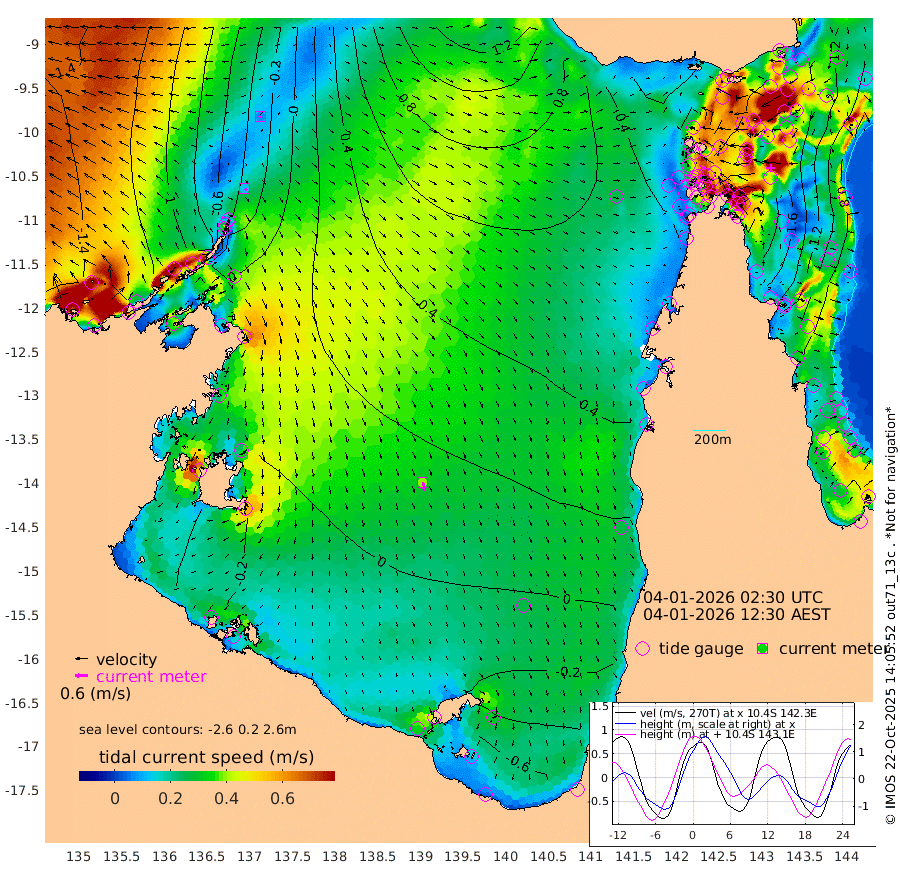 12cm/s 132T +3cm/s rms + 7cm/s -42T. ARA-GOC87 57m 40cm/s 164T +3cm/s rms + 2cm/s -2T. ARA-GOC87 60m 7cm/s -135T +2cm/s rms + 3cm/s 61T. ARA-GOC87 47m 195cm Daru 185cm Bobo Island 101cm Meer Island Barge 131cm Bramble Cay 173cm Unnamed Cay 180cm Pearce Cay 164cm Stephens Island 167cm Merrie England Shoals 193cm Mutacomal Reef 153cm Darnley Island Barge 109cm East Cay 174cm Yorke Island Barge 184cm Rennel Island 181cm Aureed Island 194cm Dungeness Reef 185cm Zagai Island 190cm Yam Island 169cm Dauan Island 156cm Saibai Island 167cm Phipi Reef 198cm Warrior Reef - West 139cm Mabuiag Island Barge 182cm Half Way Island 194cm Coconut Island 199cm Dugong Islet 195cm Poll Island 199cm Kirkcaldie Reef 195cm Suarji Island 190cm Sue Islet 119cm Hawkesbury Island 190cm Alert Patches 193cm Twin Island 120cm Badu Island 196cm St Pauls (Moa Island) 138cm Kubin (Moa Island) 169cm Ince Point 156cm Thursday Island 158cm Nardana Patches 142cm Turtle Head 114cm Round Island 110cm Goods Island 89cm Booby Island 93cm White Rocks Area 72cm Carpentaria 168cm Papou Point 100cm Bampfield Head 71cm Crab Island 96cm Red Wallis Island 130cm Packe Island 211cm Harrington Reef 111cm Herald Camp 54cm Sharp Point 120cm Red Island Point 150cm Possession Island 178cm Alpha Rock 200cm Frederick Point 196cm Wyborn Reef Light 199cm Tetley Island 107cm Triangle Reef 206cm Turtle Head Island 107cm Maclennan Cay 70cm Raine Island 166cm Mcsweeny Reef 148cm Collette Reef 102cm Shadwell Reef 156cm Hannibal Island 135cm Round Point 64cm Vrilya Point 122cm Cape Grenville 115cm Hicks Island 121cm Sir Charles Hardy Island 39cm Harvey Island 100cm Kay Reef 83cm Rocky Island 75cm Chapman Island 73cm Ham Reef 83cm Jubilee Reef 81cm Night Island 76cm Unnamed Reef No. 3 85cm Morris Island 81cm 1st 3 Mile Opening 86cm Creech Reef 89cm Fife Island 83cm Eden Reef 86cm Stanley Island 91cm Normanby River -113cm Yabooma Island -113cm Hutchison River -125cm Elcho Island -125cm North West Crocodile Island -39cm Cape Wessel -90cm Stevens Island 11cm Guluwuru Island -98cm Hopeful Bay -59cm Auster Point -60cm Two Island Bay -57cm Cadell Strait 98cm Mallison Island -9cm Melville Bay (Gove Harbour) -1cm Truant Island 2cm Cape Arnhem -18cm Cape Grey -31cm Hawk Island -69cm Milner Bay (Groote Eylandt) -61cm Cape Beatrice -72cm West Island -76cm Centre Island -57cm Mornington Island -48cm West Wellesley Islands -89cm Bountiful Island -152cm Albert River Mouth -179cm Sweers Island -137cm Karumba -9cm Nassau River Offshore 40cm Christmas Creek 44cm Archer River 63cm Boyd Point 52cm Weipa (Humbug Point) 50cm Pennefather River 59cm Cullen Point