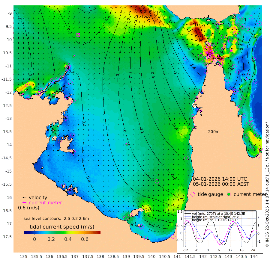 28cm/s 49T +3cm/s rms + 7cm/s -42T. ARA-GOC87 57m 24cm/s -12T +3cm/s rms + 2cm/s -2T. ARA-GOC87 60m 36cm/s 46T +2cm/s rms + 3cm/s 61T. ARA-GOC87 47m 52cm Daru 61cm Bobo Island 13cm Meer Island Barge 33cm Bramble Cay 47cm Unnamed Cay 53cm Pearce Cay 45cm Stephens Island 48cm Merrie England Shoals 52cm Mutacomal Reef 41cm Darnley Island Barge 13cm East Cay 48cm Yorke Island Barge 42cm Rennel Island 54cm Aureed Island 37cm Dungeness Reef 24cm Zagai Island 8cm Yam Island -44cm Dauan Island -39cm Saibai Island -25cm Phipi Reef 15cm Warrior Reef - West -70cm Mabuiag Island Barge 46cm Half Way Island 38cm Coconut Island 43cm Dugong Islet 27cm Poll Island 18cm Kirkcaldie Reef 7cm Suarji Island 22cm Sue Islet -198cm Hawkesbury Island -29cm Alert Patches -16cm Twin Island -171cm Badu Island -17cm St Pauls (Moa Island) -136cm Kubin (Moa Island) -63cm Ince Point -92cm Thursday Island -84cm Nardana Patches -131cm Turtle Head -153cm Round Island -193cm Goods Island -231cm Booby Island -207cm White Rocks Area -207cm Carpentaria -25cm Papou Point -232cm Bampfield Head -201cm Crab Island -214cm Red Wallis Island -162cm Packe Island 51cm Harrington Reef -207cm Herald Camp 5cm Sharp Point -123cm Red Island Point -65cm Possession Island 0cm Alpha Rock 12cm Frederick Point 48cm Wyborn Reef Light 42cm Tetley Island 5cm Triangle Reef 42cm Turtle Head Island 3cm Maclennan Cay -16cm Raine Island 42cm Mcsweeny Reef 35cm Collette Reef 7cm Shadwell Reef 44cm Hannibal Island 30cm Round Point -194cm Vrilya Point 20cm Cape Grenville 14cm Hicks Island -1cm Sir Charles Hardy Island 7cm Harvey Island 6cm Kay Reef -4cm Rocky Island -13cm Chapman Island -16cm Ham Reef -8cm Jubilee Reef 0cm Night Island -15cm Unnamed Reef No. 3 -3cm Morris Island -15cm 1st 3 Mile Opening -9cm Creech Reef 7cm Fife Island -3cm Eden Reef -4cm Stanley Island 9cm Normanby River 20cm Yabooma Island 33cm Hutchison River 28cm Elcho Island 27cm North West Crocodile Island 50cm Cape Wessel 54cm Stevens Island 71cm Guluwuru Island 42cm Hopeful Bay 47cm Auster Point 49cm Two Island Bay 68cm Cadell Strait 130cm Mallison Island 68cm Melville Bay (Gove Harbour) 67cm Truant Island 56cm Cape Arnhem 64cm Cape Grey 73cm Hawk Island 90cm Milner Bay (Groote Eylandt) 82cm Cape Beatrice 93cm West Island 89cm Centre Island 99cm Mornington Island 102cm West Wellesley Islands 116cm Bountiful Island 154cm Albert River Mouth 193cm Sweers Island 136cm Karumba 33cm Nassau River Offshore -35cm Christmas Creek -101cm Archer River -124cm Boyd Point -138cm Weipa (Humbug Point) -127cm Pennefather River -177cm Cullen Point