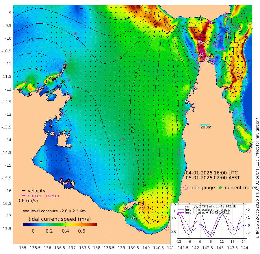 21cm/s 26T +3cm/s rms + 7cm/s -42T. ARA-GOC87 57m 32cm/s 11T +3cm/s rms + 2cm/s -2T. ARA-GOC87 60m 24cm/s 33T +2cm/s rms + 3cm/s 61T. ARA-GOC87 47m -15cm Daru -18cm Bobo Island -65cm Meer Island Barge -60cm Bramble Cay -36cm Unnamed Cay -38cm Pearce Cay -43cm Stephens Island -40cm Merrie England Shoals -20cm Mutacomal Reef -42cm Darnley Island Barge -75cm East Cay -24cm Yorke Island Barge -32cm Rennel Island -21cm Aureed Island -23cm Dungeness Reef 7cm Zagai Island -7cm Yam Island -29cm Dauan Island -14cm Saibai Island -37cm Phipi Reef -7cm Warrior Reef - West -30cm Mabuiag Island Barge -25cm Half Way Island -16cm Coconut Island -20cm Dugong Islet -7cm Poll Island -18cm Kirkcaldie Reef -4cm Suarji Island 2cm Sue Islet -156cm Hawkesbury Island -27cm Alert Patches -19cm Twin Island -131cm Badu Island -7cm St Pauls (Moa Island) -108cm Kubin (Moa Island) -45cm Ince Point -64cm Thursday Island -59cm Nardana Patches -108cm Turtle Head -116cm Round Island -159cm Goods Island -172cm Booby Island -162cm White Rocks Area -116cm Carpentaria -17cm Papou Point -167cm Bampfield Head -145cm Crab Island -161cm Red Wallis Island -137cm Packe Island -10cm Harrington Reef -160cm Herald Camp 15cm Sharp Point -100cm Red Island Point -50cm Possession Island -2cm Alpha Rock -14cm Frederick Point -10cm Wyborn Reef Light -6cm Tetley Island -59cm Triangle Reef -17cm Turtle Head Island -69cm Maclennan Cay -84cm Raine Island -33cm Mcsweeny Reef -42cm Collette Reef -63cm Shadwell Reef -46cm Hannibal Island -65cm Round Point -126cm Vrilya Point -63cm Cape Grenville -69cm Hicks Island -84cm Sir Charles Hardy Island -18cm Harvey Island -78cm Kay Reef -81cm Rocky Island -91cm Chapman Island -85cm Ham Reef -80cm Jubilee Reef -69cm Night Island -87cm Unnamed Reef No. 3 -84cm Morris Island -84cm 1st 3 Mile Opening -83cm Creech Reef -72cm Fife Island -103cm Eden Reef -85cm Stanley Island -87cm Normanby River -74cm Yabooma Island -89cm Hutchison River -68cm Elcho Island -64cm North West Crocodile Island -8cm Cape Wessel -33cm Stevens Island -4cm Guluwuru Island -42cm Hopeful Bay -19cm Auster Point -17cm Two Island Bay -44cm Cadell Strait 44cm Mallison Island 0cm Melville Bay (Gove Harbour) 2cm Truant Island 13cm Cape Arnhem 34cm Cape Grey 40cm Hawk Island 81cm Milner Bay (Groote Eylandt) 68cm Cape Beatrice 104cm West Island 101cm Centre Island 47cm Mornington Island 51cm West Wellesley Islands 36cm Bountiful Island 58cm Albert River Mouth 104cm Sweers Island 44cm Karumba -27cm Nassau River Offshore -78cm Christmas Creek -111cm Archer River -108cm Boyd Point -135cm Weipa (Humbug Point) -92cm Pennefather River -125cm Cullen Point