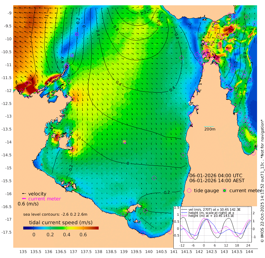 10cm/s 116T +3cm/s rms + 7cm/s -42T. ARA-GOC87 57m 39cm/s 164T +3cm/s rms + 2cm/s -2T. ARA-GOC87 60m 4cm/s -99T +2cm/s rms + 3cm/s 61T. ARA-GOC87 47m 159cm Daru 152cm Bobo Island 82cm Meer Island Barge 102cm Bramble Cay 133cm Unnamed Cay 144cm Pearce Cay 131cm Stephens Island 126cm Merrie England Shoals 150cm Mutacomal Reef 124cm Darnley Island Barge 90cm East Cay 142cm Yorke Island Barge 146cm Rennel Island 147cm Aureed Island 154cm Dungeness Reef 156cm Zagai Island 160cm Yam Island 152cm Dauan Island 144cm Saibai Island 139cm Phipi Reef 171cm Warrior Reef - West 116cm Mabuiag Island Barge 144cm Half Way Island 153cm Coconut Island 158cm Dugong Islet 156cm Poll Island 160cm Kirkcaldie Reef 152cm Suarji Island 156cm Sue Islet 92cm Hawkesbury Island 146cm Alert Patches 153cm Twin Island 89cm Badu Island 158cm St Pauls (Moa Island) 108cm Kubin (Moa Island) 132cm Ince Point 120cm Thursday Island 122cm Nardana Patches 106cm Turtle Head 86cm Round Island 76cm Goods Island 57cm Booby Island 57cm White Rocks Area 48cm Carpentaria 136cm Papou Point 66cm Bampfield Head 47cm Crab Island 66cm Red Wallis Island 98cm Packe Island 166cm Harrington Reef 90cm Herald Camp 45cm Sharp Point 94cm Red Island Point 116cm Possession Island 142cm Alpha Rock 160cm Frederick Point 155cm Wyborn Reef Light 158cm Tetley Island 87cm Triangle Reef 161cm Turtle Head Island 87cm Maclennan Cay 55cm Raine Island 132cm Mcsweeny Reef 117cm Collette Reef 81cm Shadwell Reef 120cm Hannibal Island 106cm Round Point 41cm Vrilya Point 94cm Cape Grenville 93cm Hicks Island 102cm Sir Charles Hardy Island 32cm Harvey Island 76cm Kay Reef 67cm Rocky Island 60cm Chapman Island 61cm Ham Reef 67cm Jubilee Reef 65cm Night Island 62cm Unnamed Reef No. 3 67cm Morris Island 61cm 1st 3 Mile Opening 68cm Creech Reef 78cm Fife Island 64cm Eden Reef 67cm Stanley Island 73cm Normanby River -99cm Yabooma Island -102cm Hutchison River -112cm Elcho Island -110cm North West Crocodile Island -22cm Cape Wessel -78cm Stevens Island 23cm Guluwuru Island -83cm Hopeful Bay -47cm Auster Point -40cm Two Island Bay -33cm Cadell Strait 129cm Mallison Island 2cm Melville Bay (Gove Harbour) 11cm Truant Island 10cm Cape Arnhem -14cm Cape Grey -28cm Hawk Island -68cm Milner Bay (Groote Eylandt) -61cm Cape Beatrice -74cm West Island -81cm Centre Island -58cm Mornington Island -53cm West Wellesley Islands -86cm Bountiful Island -149cm Albert River Mouth -173cm Sweers Island -130cm Karumba -12cm Nassau River Offshore 33cm Christmas Creek 31cm Archer River 50cm Boyd Point 38cm Weipa (Humbug Point) 30cm Pennefather River 45cm Cullen Point