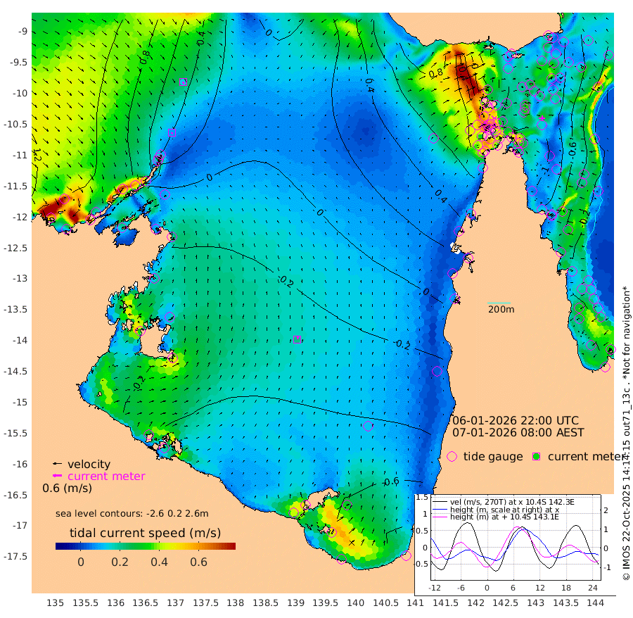 9cm/s -165T +3cm/s rms + 7cm/s -42T. ARA-GOC87 57m 21cm/s 12T +3cm/s rms + 2cm/s -2T. ARA-GOC87 60m 15cm/s 164T +2cm/s rms + 3cm/s 61T. ARA-GOC87 47m -98cm Daru -95cm Bobo Island -39cm Meer Island Barge -56cm Bramble Cay -72cm Unnamed Cay -88cm Pearce Cay -75cm Stephens Island -69cm Merrie England Shoals -85cm Mutacomal Reef -71cm Darnley Island Barge -45cm East Cay -83cm Yorke Island Barge -80cm Rennel Island -92cm Aureed Island -90cm Dungeness Reef -90cm Zagai Island -83cm Yam Island -84cm Dauan Island -73cm Saibai Island -96cm Phipi Reef -109cm Warrior Reef - West -24cm Mabuiag Island Barge -80cm Half Way Island -85cm Coconut Island -86cm Dugong Islet -83cm Poll Island -83cm Kirkcaldie Reef -73cm Suarji Island -80cm Sue Islet 66cm Hawkesbury Island -50cm Alert Patches -58cm Twin Island 39cm Badu Island -64cm St Pauls (Moa Island) 23cm Kubin (Moa Island) -28cm Ince Point -7cm Thursday Island -12cm Nardana Patches 12cm Turtle Head 50cm Round Island 64cm Goods Island 99cm Booby Island 91cm White Rocks Area 111cm Carpentaria -44cm Papou Point 123cm Bampfield Head 77cm Crab Island 83cm Red Wallis Island 33cm Packe Island -90cm Harrington Reef 70cm Herald Camp -28cm Sharp Point 11cm Red Island Point -10cm Possession Island -53cm Alpha Rock -73cm Frederick Point -79cm Wyborn Reef Light -78cm Tetley Island -40cm Triangle Reef -71cm Turtle Head Island -37cm Maclennan Cay -18cm Raine Island -74cm Mcsweeny Reef -65cm Collette Reef -38cm Shadwell Reef -69cm Hannibal Island -55cm Round Point 80cm Vrilya Point -45cm Cape Grenville -45cm Hicks Island -42cm Sir Charles Hardy Island -16cm Harvey Island -30cm Kay Reef -27cm Rocky Island -22cm Chapman Island -18cm Ham Reef -25cm Jubilee Reef -30cm Night Island -21cm Unnamed Reef No. 3 -26cm Morris Island -16cm 1st 3 Mile Opening -26cm Creech Reef -45cm Fife Island -24cm Eden Reef -24cm Stanley Island -31cm Normanby River 103cm Yabooma Island 103cm Hutchison River 102cm Elcho Island 96cm North West Crocodile Island 48cm Cape Wessel 74cm Stevens Island -1cm Guluwuru Island 75cm Hopeful Bay 62cm Auster Point 59cm Two Island Bay 31cm Cadell Strait -109cm Mallison Island 4cm Melville Bay (Gove Harbour) 10cm Truant Island -7cm Cape Arnhem -10cm Cape Grey -18cm Hawk Island -11cm Milner Bay (Groote Eylandt) -25cm Cape Beatrice -35cm West Island -29cm Centre Island -101cm Mornington Island -99cm West Wellesley Islands -108cm Bountiful Island -112cm Albert River Mouth -111cm Sweers Island -121cm Karumba -103cm Nassau River Offshore -76cm Christmas Creek -9cm Archer River 15cm Boyd Point 20cm Weipa (Humbug Point) 35cm Pennefather River 63cm Cullen Point