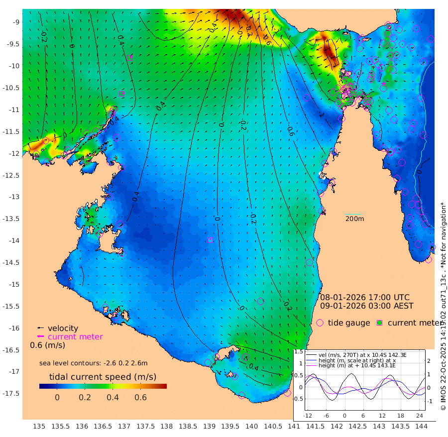 26cm/s 71T +3cm/s rms + 7cm/s -42T. ARA-GOC87 57m 12cm/s -1T +3cm/s rms + 2cm/s -2T. ARA-GOC87 60m 29cm/s 62T +2cm/s rms + 3cm/s 61T. ARA-GOC87 47m 6cm Daru 19cm Bobo Island 6cm Meer Island Barge 6cm Bramble Cay 0cm Unnamed Cay 14cm Pearce Cay 9cm Stephens Island 1cm Merrie England Shoals -6cm Mutacomal Reef 14cm Darnley Island Barge 3cm East Cay 12cm Yorke Island Barge -1cm Rennel Island 17cm Aureed Island -8cm Dungeness Reef -7cm Zagai Island -34cm Yam Island -44cm Dauan Island -36cm Saibai Island -40cm Phipi Reef -13cm Warrior Reef - West -69cm Mabuiag Island Barge -3cm Half Way Island 0cm Coconut Island -9cm Dugong Islet -17cm Poll Island -26cm Kirkcaldie Reef -29cm Suarji Island -15cm Sue Islet -171cm Hawkesbury Island -53cm Alert Patches -47cm Twin Island -132cm Badu Island -47cm St Pauls (Moa Island) -125cm Kubin (Moa Island) -74cm Ince Point -92cm Thursday Island -87cm Nardana Patches -113cm Turtle Head -140cm Round Island -151cm Goods Island -171cm Booby Island -163cm White Rocks Area -137cm Carpentaria -50cm Papou Point -177cm Bampfield Head -142cm Crab Island -163cm Red Wallis Island -139cm Packe Island -2cm Harrington Reef -181cm Herald Camp -8cm Sharp Point -107cm Red Island Point -79cm Possession Island -37cm Alpha Rock -26cm Frederick Point -2cm Wyborn Reef Light -8cm Tetley Island -1cm Triangle Reef -8cm Turtle Head Island -5cm Maclennan Cay -3cm Raine Island 9cm Mcsweeny Reef 8cm Collette Reef 2cm Shadwell Reef 11cm Hannibal Island 4cm Round Point -132cm Vrilya Point -3cm Cape Grenville -1cm Hicks Island -9cm Sir Charles Hardy Island 0cm Harvey Island -4cm Kay Reef -2cm Rocky Island -2cm Chapman Island -4cm Ham Reef -1cm Jubilee Reef 1cm Night Island -3cm Unnamed Reef No. 3 -1cm Morris Island -5cm 1st 3 Mile Opening -2cm Creech Reef 15cm Fife Island 2cm Eden Reef -4cm Stanley Island 0cm Normanby River -18cm Yabooma Island 3cm Hutchison River 2cm Elcho Island -8cm North West Crocodile Island 39cm Cape Wessel 24cm Stevens Island 74cm Guluwuru Island 16cm Hopeful Bay 28cm Auster Point 21cm Two Island Bay 49cm Cadell Strait 172cm Mallison Island 65cm Melville Bay (Gove Harbour) 67cm Truant Island 59cm Cape Arnhem 56cm Cape Grey 51cm Hawk Island 56cm Milner Bay (Groote Eylandt) 49cm Cape Beatrice 48cm West Island 44cm Centre Island 57cm Mornington Island 57cm West Wellesley Islands 58cm Bountiful Island 84cm Albert River Mouth 115cm Sweers Island 68cm Karumba 12cm Nassau River Offshore -27cm Christmas Creek -63cm Archer River -77cm Boyd Point -90cm Weipa (Humbug Point) -79cm Pennefather River -125cm Cullen Point