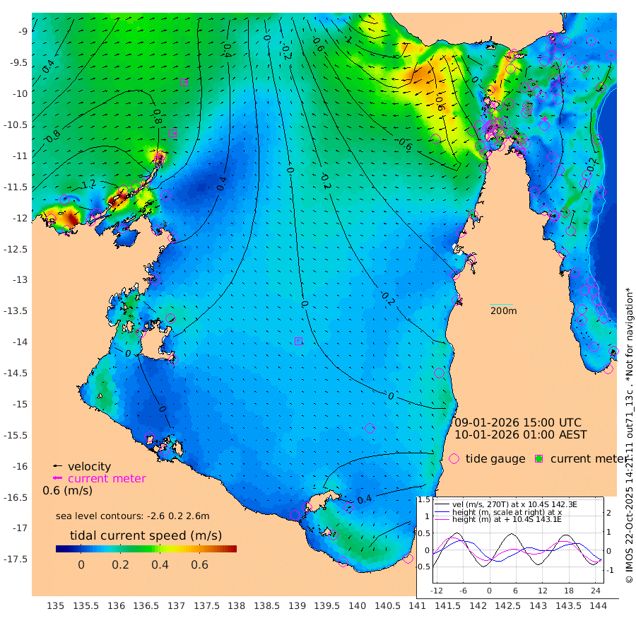 24cm/s 102T +3cm/s rms + 7cm/s -42T. ARA-GOC87 57m 11cm/s -50T +3cm/s rms + 2cm/s -2T. ARA-GOC87 60m 27cm/s 86T +2cm/s rms + 3cm/s 61T. ARA-GOC87 47m -33cm Daru -28cm Bobo Island -19cm Meer Island Barge -19cm Bramble Cay -34cm Unnamed Cay -21cm Pearce Cay -32cm Stephens Island -31cm Merrie England Shoals -38cm Mutacomal Reef -30cm Darnley Island Barge -21cm East Cay -34cm Yorke Island Barge -37cm Rennel Island -32cm Aureed Island -37cm Dungeness Reef -36cm Zagai Island -50cm Yam Island -19cm Dauan Island -27cm Saibai Island -10cm Phipi Reef -31cm Warrior Reef - West -36cm Mabuiag Island Barge -42cm Half Way Island -37cm Coconut Island -50cm Dugong Islet -42cm Poll Island -52cm Kirkcaldie Reef -50cm Suarji Island -46cm Sue Islet -57cm Hawkesbury Island -51cm Alert Patches -53cm Twin Island -32cm Badu Island -52cm St Pauls (Moa Island) -56cm Kubin (Moa Island) -53cm Ince Point -55cm Thursday Island -54cm Nardana Patches -49cm Turtle Head -63cm Round Island -51cm Goods Island -64cm Booby Island -59cm White Rocks Area -96cm Carpentaria -51cm Papou Point -89cm Bampfield Head -49cm Crab Island -64cm Red Wallis Island -59cm Packe Island -52cm Harrington Reef -88cm Herald Camp -17cm Sharp Point -43cm Red Island Point -57cm Possession Island -54cm Alpha Rock -50cm Frederick Point -38cm Wyborn Reef Light -41cm Tetley Island -19cm Triangle Reef -42cm Turtle Head Island -29cm Maclennan Cay -11cm Raine Island -30cm Mcsweeny Reef -26cm Collette Reef -17cm Shadwell Reef -26cm Hannibal Island -18cm Round Point -54cm Vrilya Point -30cm Cape Grenville -24cm Hicks Island -35cm Sir Charles Hardy Island -10cm Harvey Island -23cm Kay Reef -16cm Rocky Island -7cm Chapman Island -17cm Ham Reef -16cm Jubilee Reef -17cm Night Island -15cm Unnamed Reef No. 3 -17cm Morris Island -19cm 1st 3 Mile Opening -20cm Creech Reef -9cm Fife Island -13cm Eden Reef -21cm Stanley Island -20cm Normanby River 122cm Yabooma Island 144cm Hutchison River 127cm Elcho Island 122cm North West Crocodile Island 70cm Cape Wessel 123cm Stevens Island 70cm Guluwuru Island 111cm Hopeful Bay 88cm Auster Point 80cm Two Island Bay 140cm Cadell Strait 92cm Mallison Island 76cm Melville Bay (Gove Harbour) 73cm Truant Island 50cm Cape Arnhem 41cm Cape Grey 41cm Hawk Island 30cm Milner Bay (Groote Eylandt) 25cm Cape Beatrice 0cm West Island -2cm Centre Island 39cm Mornington Island 35cm West Wellesley Islands 63cm Bountiful Island 106cm Albert River Mouth 123cm Sweers Island 97cm Karumba 32cm Nassau River Offshore 3cm Christmas Creek -8cm Archer River -34cm Boyd Point -25cm Weipa (Humbug Point) -24cm Pennefather River -57cm Cullen Point
