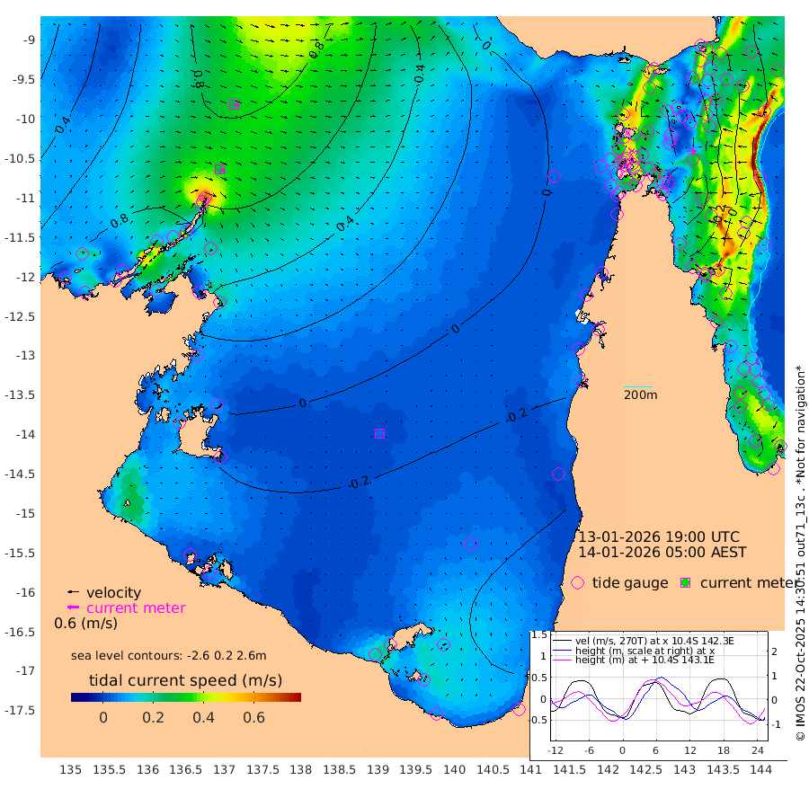 29cm/s 111T +3cm/s rms + 7cm/s -42T. ARA-GOC87 57m 5cm/s 87T +3cm/s rms + 2cm/s -2T. ARA-GOC87 60m 27cm/s 104T +2cm/s rms + 3cm/s 61T. ARA-GOC87 47m -40cm Daru -33cm Bobo Island 11cm Meer Island Barge 0cm Bramble Cay -22cm Unnamed Cay -29cm Pearce Cay -19cm Stephens Island -16cm Merrie England Shoals -41cm Mutacomal Reef -10cm Darnley Island Barge 6cm East Cay -26cm Yorke Island Barge -37cm Rennel Island -38cm Aureed Island -53cm Dungeness Reef -60cm Zagai Island -73cm Yam Island -64cm Dauan Island -54cm Saibai Island -66cm Phipi Reef -70cm Warrior Reef - West -49cm Mabuiag Island Barge -40cm Half Way Island -45cm Coconut Island -53cm Dugong Islet -63cm Poll Island -63cm Kirkcaldie Reef -81cm Suarji Island -53cm Sue Islet -18cm Hawkesbury Island -61cm Alert Patches -67cm Twin Island -21cm Badu Island -74cm St Pauls (Moa Island) -39cm Kubin (Moa Island) -58cm Ince Point -52cm Thursday Island -54cm Nardana Patches -41cm Turtle Head -25cm Round Island -19cm Goods Island -8cm Booby Island -22cm White Rocks Area 3cm Carpentaria -61cm Papou Point 4cm Bampfield Head -2cm Crab Island -19cm Red Wallis Island -36cm Packe Island -57cm Harrington Reef -29cm Herald Camp -27cm Sharp Point -36cm Red Island Point -46cm Possession Island -58cm Alpha Rock -59cm Frederick Point -37cm Wyborn Reef Light -42cm Tetley Island 1cm Triangle Reef -31cm Turtle Head Island -2cm Maclennan Cay 21cm Raine Island -20cm Mcsweeny Reef -10cm Collette Reef 11cm Shadwell Reef -8cm Hannibal Island 1cm Round Point 7cm Vrilya Point -1cm Cape Grenville 2cm Hicks Island 0cm Sir Charles Hardy Island -2cm Harvey Island 14cm Kay Reef 16cm Rocky Island 22cm Chapman Island 22cm Ham Reef 19cm Jubilee Reef 11cm Night Island 20cm Unnamed Reef No. 3 18cm Morris Island 18cm 1st 3 Mile Opening 16cm Creech Reef 16cm Fife Island 27cm Eden Reef 19cm Stanley Island 14cm Normanby River 76cm Yabooma Island 96cm Hutchison River 86cm Elcho Island 72cm North West Crocodile Island 70cm Cape Wessel 89cm Stevens Island 82cm Guluwuru Island 86cm Hopeful Bay 76cm Auster Point 75cm Two Island Bay 100cm Cadell Strait 170cm Mallison Island 72cm Melville Bay (Gove Harbour) 78cm Truant Island 50cm Cape Arnhem 26cm Cape Grey 14cm Hawk Island -14cm Milner Bay (Groote Eylandt) -26cm Cape Beatrice -61cm West Island -59cm Centre Island -67cm Mornington Island -75cm West Wellesley Islands -81cm Bountiful Island -82cm Albert River Mouth -66cm Sweers Island -82cm Karumba -62cm Nassau River Offshore -45cm Christmas Creek -7cm Archer River -4cm Boyd Point -6cm Weipa (Humbug Point) 13cm Pennefather River -3cm Cullen Point