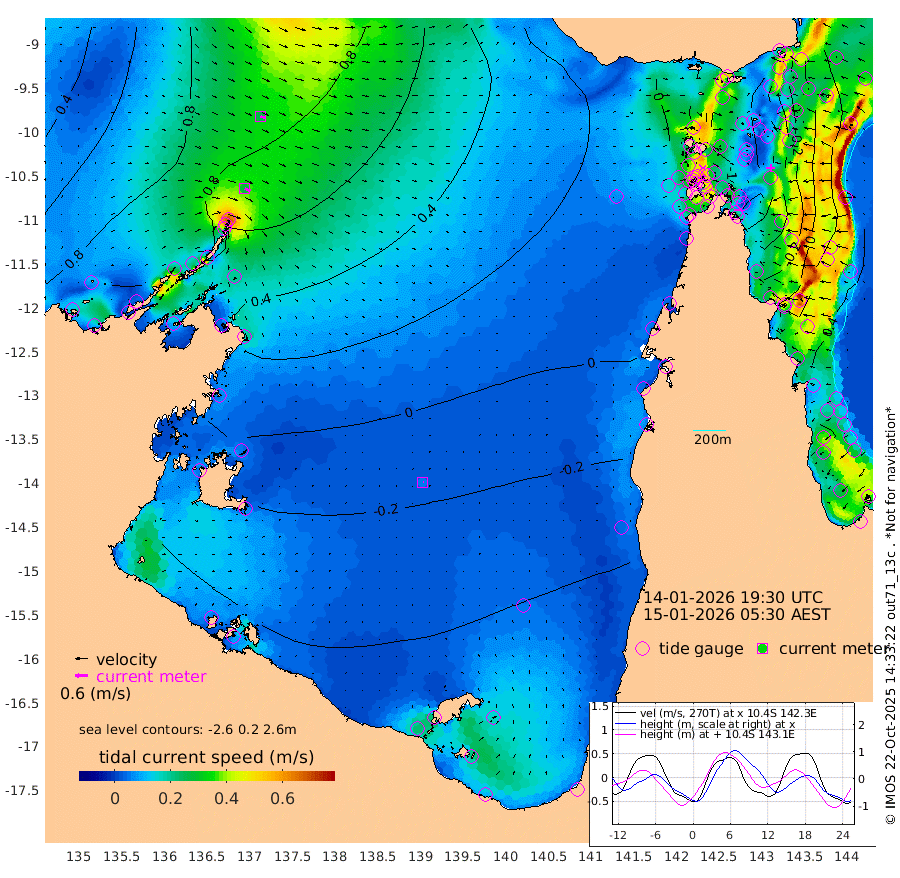 28cm/s 115T +3cm/s rms + 7cm/s -42T. ARA-GOC87 57m 5cm/s 92T +3cm/s rms + 2cm/s -2T. ARA-GOC87 60m 26cm/s 110T +2cm/s rms + 3cm/s 61T. ARA-GOC87 47m -40cm Daru -34cm Bobo Island 17cm Meer Island Barge 6cm Bramble Cay -16cm Unnamed Cay -28cm Pearce Cay -14cm Stephens Island -10cm Merrie England Shoals -38cm Mutacomal Reef -5cm Darnley Island Barge 12cm East Cay -23cm Yorke Island Barge -33cm Rennel Island -38cm Aureed Island -52cm Dungeness Reef -65cm Zagai Island -74cm Yam Island -72cm Dauan Island -64cm Saibai Island -74cm Phipi Reef -77cm Warrior Reef - West -50cm Mabuiag Island Barge -34cm Half Way Island -45cm Coconut Island -49cm Dugong Islet -62cm Poll Island -60cm Kirkcaldie Reef -83cm Suarji Island -54cm Sue Islet 1cm Hawkesbury Island -59cm Alert Patches -65cm Twin Island -10cm Badu Island -73cm St Pauls (Moa Island) -24cm Kubin (Moa Island) -53cm Ince Point -44cm Thursday Island -46cm Nardana Patches -29cm Turtle Head -8cm Round Island 0cm Goods Island 16cm Booby Island 0cm White Rocks Area 26cm Carpentaria -59cm Papou Point 32cm Bampfield Head 16cm Crab Island 2cm Red Wallis Island -19cm Packe Island -54cm Harrington Reef -4cm Herald Camp -29cm Sharp Point -29cm Red Island Point -38cm Possession Island -55cm Alpha Rock -58cm Frederick Point -34cm Wyborn Reef Light -40cm Tetley Island 5cm Triangle Reef -25cm Turtle Head Island 5cm Maclennan Cay 28cm Raine Island -17cm Mcsweeny Reef -6cm Collette Reef 16cm Shadwell Reef -3cm Hannibal Island 7cm Round Point 26cm Vrilya Point 7cm Cape Grenville 8cm Hicks Island 8cm Sir Charles Hardy Island 1cm Harvey Island 22cm Kay Reef 22cm Rocky Island 27cm Chapman Island 28cm Ham Reef 25cm Jubilee Reef 17cm Night Island 25cm Unnamed Reef No. 3 25cm Morris Island 28cm 1st 3 Mile Opening 23cm Creech Reef 20cm Fife Island 37cm Eden Reef 28cm Stanley Island 23cm Normanby River 88cm Yabooma Island 107cm Hutchison River 95cm Elcho Island 81cm North West Crocodile Island 73cm Cape Wessel 95cm Stevens Island 81cm Guluwuru Island 92cm Hopeful Bay 81cm Auster Point 83cm Two Island Bay 101cm Cadell Strait 154cm Mallison Island 70cm Melville Bay (Gove Harbour) 77cm Truant Island 47cm Cape Arnhem 20cm Cape Grey 7cm Hawk Island -21cm Milner Bay (Groote Eylandt) -35cm Cape Beatrice -71cm West Island -68cm Centre Island -85cm Mornington Island -93cm West Wellesley Islands -104cm Bountiful Island -108cm Albert River Mouth -96cm Sweers Island -108cm Karumba -75cm Nassau River Offshore -50cm Christmas Creek -4cm Archer River 4cm Boyd Point 3cm Weipa (Humbug Point) 23cm Pennefather River 14cm Cullen Point