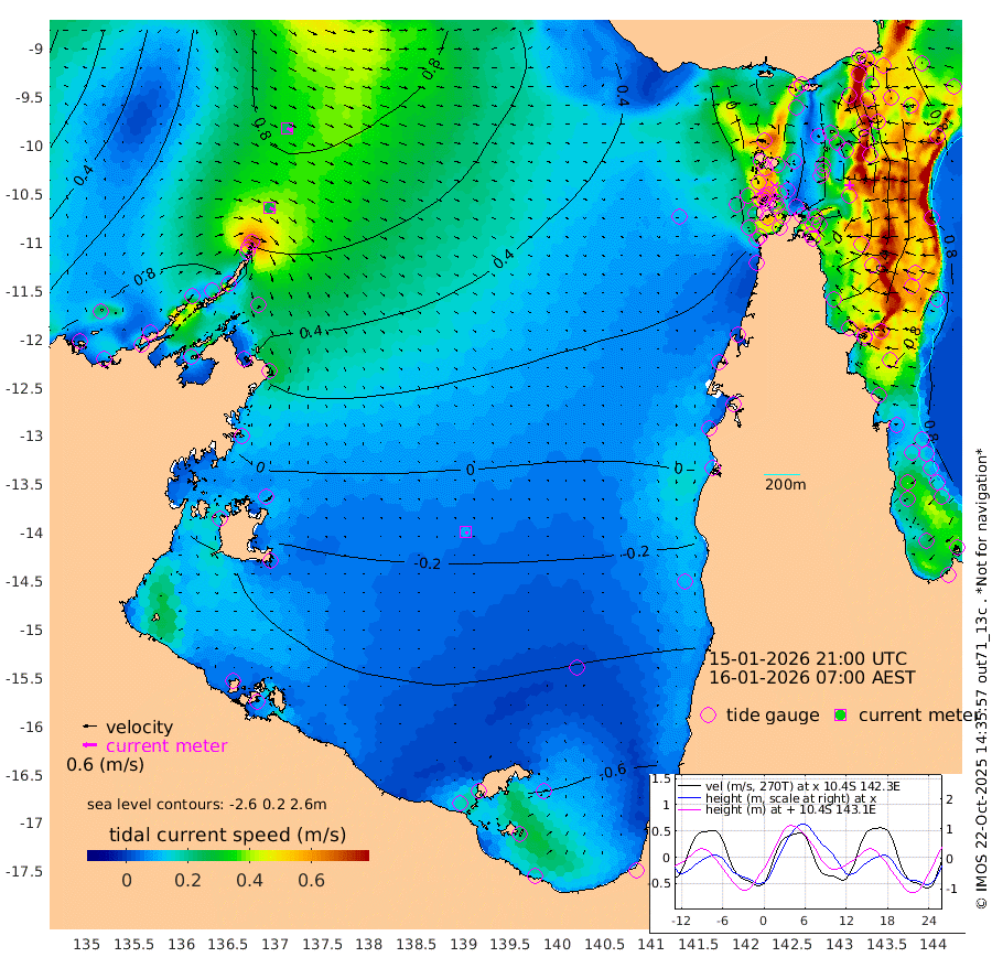 28cm/s 120T +3cm/s rms + 7cm/s -42T. ARA-GOC87 57m 10cm/s 141T +3cm/s rms + 2cm/s -2T. ARA-GOC87 60m 24cm/s 117T +2cm/s rms + 3cm/s 61T. ARA-GOC87 47m 17cm Daru 23cm Bobo Island 63cm Meer Island Barge 64cm Bramble Cay 49cm Unnamed Cay 34cm Pearce Cay 47cm Stephens Island 59cm Merrie England Shoals 29cm Mutacomal Reef 51cm Darnley Island Barge 64cm East Cay 32cm Yorke Island Barge 28cm Rennel Island 18cm Aureed Island 2cm Dungeness Reef -32cm Zagai Island -34cm Yam Island -61cm Dauan Island -53cm Saibai Island -57cm Phipi Reef -44cm Warrior Reef - West -33cm Mabuiag Island Barge 26cm Half Way Island 11cm Coconut Island 13cm Dugong Islet -14cm Poll Island -8cm Kirkcaldie Reef -41cm Suarji Island -10cm Sue Islet 34cm Hawkesbury Island -16cm Alert Patches -21cm Twin Island 13cm Badu Island -37cm St Pauls (Moa Island) 8cm Kubin (Moa Island) -17cm Ince Point -10cm Thursday Island -13cm Nardana Patches 4cm Turtle Head 23cm Round Island 32cm Goods Island 44cm Booby Island 34cm White Rocks Area 50cm Carpentaria -24cm Papou Point 69cm Bampfield Head 34cm Crab Island 33cm Red Wallis Island 18cm Packe Island 10cm Harrington Reef 29cm Herald Camp -22cm Sharp Point -1cm Red Island Point -2cm Possession Island -11cm Alpha Rock -7cm Frederick Point 28cm Wyborn Reef Light 19cm Tetley Island 48cm Triangle Reef 38cm Turtle Head Island 53cm Maclennan Cay 65cm Raine Island 41cm Mcsweeny Reef 50cm Collette Reef 61cm Shadwell Reef 60cm Hannibal Island 68cm Round Point 41cm Vrilya Point 65cm Cape Grenville 60cm Hicks Island 63cm Sir Charles Hardy Island 17cm Harvey Island 77cm Kay Reef 67cm Rocky Island 70cm Chapman Island 69cm Ham Reef 68cm Jubilee Reef 58cm Night Island 68cm Unnamed Reef No. 3 72cm Morris Island 69cm 1st 3 Mile Opening 68cm Creech Reef 61cm Fife Island 89cm Eden Reef 77cm Stanley Island 77cm Normanby River 82cm Yabooma Island 103cm Hutchison River 87cm Elcho Island 71cm North West Crocodile Island 73cm Cape Wessel 90cm Stevens Island 84cm Guluwuru Island 87cm Hopeful Bay 78cm Auster Point 77cm Two Island Bay 91cm Cadell Strait 168cm Mallison Island 69cm Melville Bay (Gove Harbour) 77cm Truant Island 45cm Cape Arnhem 13cm Cape Grey 0cm Hawk Island -39cm Milner Bay (Groote Eylandt) -49cm Cape Beatrice -90cm West Island -86cm Centre Island -101cm Mornington Island -105cm West Wellesley Islands -125cm Bountiful Island -144cm Albert River Mouth -143cm Sweers Island -144cm Karumba -78cm Nassau River Offshore -40cm Christmas Creek 10cm Archer River 21cm Boyd Point 20cm Weipa (Humbug Point) 34cm Pennefather River 30cm Cullen Point