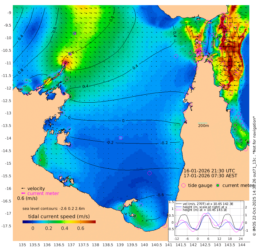 30cm/s 122T +3cm/s rms + 7cm/s -42T. ARA-GOC87 57m 11cm/s 145T +3cm/s rms + 2cm/s -2T. ARA-GOC87 60m 26cm/s 121T +2cm/s rms + 3cm/s 61T. ARA-GOC87 47m 28cm Daru 34cm Bobo Island 73cm Meer Island Barge 76cm Bramble Cay 63cm Unnamed Cay 46cm Pearce Cay 61cm Stephens Island 73cm Merrie England Shoals 42cm Mutacomal Reef 62cm Darnley Island Barge 74cm East Cay 43cm Yorke Island Barge 42cm Rennel Island 28cm Aureed Island 15cm Dungeness Reef -25cm Zagai Island -24cm Yam Island -57cm Dauan Island -54cm Saibai Island -54cm Phipi Reef -38cm Warrior Reef - West -28cm Mabuiag Island Barge 42cm Half Way Island 21cm Coconut Island 29cm Dugong Islet -2cm Poll Island 5cm Kirkcaldie Reef -32cm Suarji Island -2cm Sue Islet 51cm Hawkesbury Island -5cm Alert Patches -9cm Twin Island 26cm Badu Island -26cm St Pauls (Moa Island) 26cm Kubin (Moa Island) -5cm Ince Point 3cm Thursday Island 0cm Nardana Patches 19cm Turtle Head 38cm Round Island 51cm Goods Island 63cm Booby Island 55cm White Rocks Area 63cm Carpentaria -14cm Papou Point 87cm Bampfield Head 48cm Crab Island 51cm Red Wallis Island 36cm Packe Island 25cm Harrington Reef 47cm Herald Camp -22cm Sharp Point 9cm Red Island Point 8cm Possession Island 0cm Alpha Rock 5cm Frederick Point 40cm Wyborn Reef Light 31cm Tetley Island 56cm Triangle Reef 54cm Turtle Head Island 64cm Maclennan Cay 74cm Raine Island 54cm Mcsweeny Reef 61cm Collette Reef 70cm Shadwell Reef 72cm Hannibal Island 80cm Round Point 53cm Vrilya Point 77cm Cape Grenville 71cm Hicks Island 75cm Sir Charles Hardy Island 21cm Harvey Island 88cm Kay Reef 76cm Rocky Island 77cm Chapman Island 76cm Ham Reef 77cm Jubilee Reef 67cm Night Island 76cm Unnamed Reef No. 3 82cm Morris Island 81cm 1st 3 Mile Opening 78cm Creech Reef 68cm Fife Island 100cm Eden Reef 88cm Stanley Island 90cm Normanby River 104cm Yabooma Island 127cm Hutchison River 106cm Elcho Island 90cm North West Crocodile Island 82cm Cape Wessel 105cm Stevens Island 91cm Guluwuru Island 99cm Hopeful Bay 90cm Auster Point 91cm Two Island Bay 105cm Cadell Strait 153cm Mallison Island 74cm Melville Bay (Gove Harbour) 83cm Truant Island 46cm Cape Arnhem 11cm Cape Grey -4cm Hawk Island -44cm Milner Bay (Groote Eylandt) -54cm Cape Beatrice -99cm West Island -96cm Centre Island -114cm Mornington Island -114cm West Wellesley Islands -138cm Bountiful Island -157cm Albert River Mouth -164cm Sweers Island -160cm Karumba -85cm Nassau River Offshore -42cm Christmas Creek 12cm Archer River 26cm Boyd Point 27cm Weipa (Humbug Point) 40cm Pennefather River 40cm Cullen Point