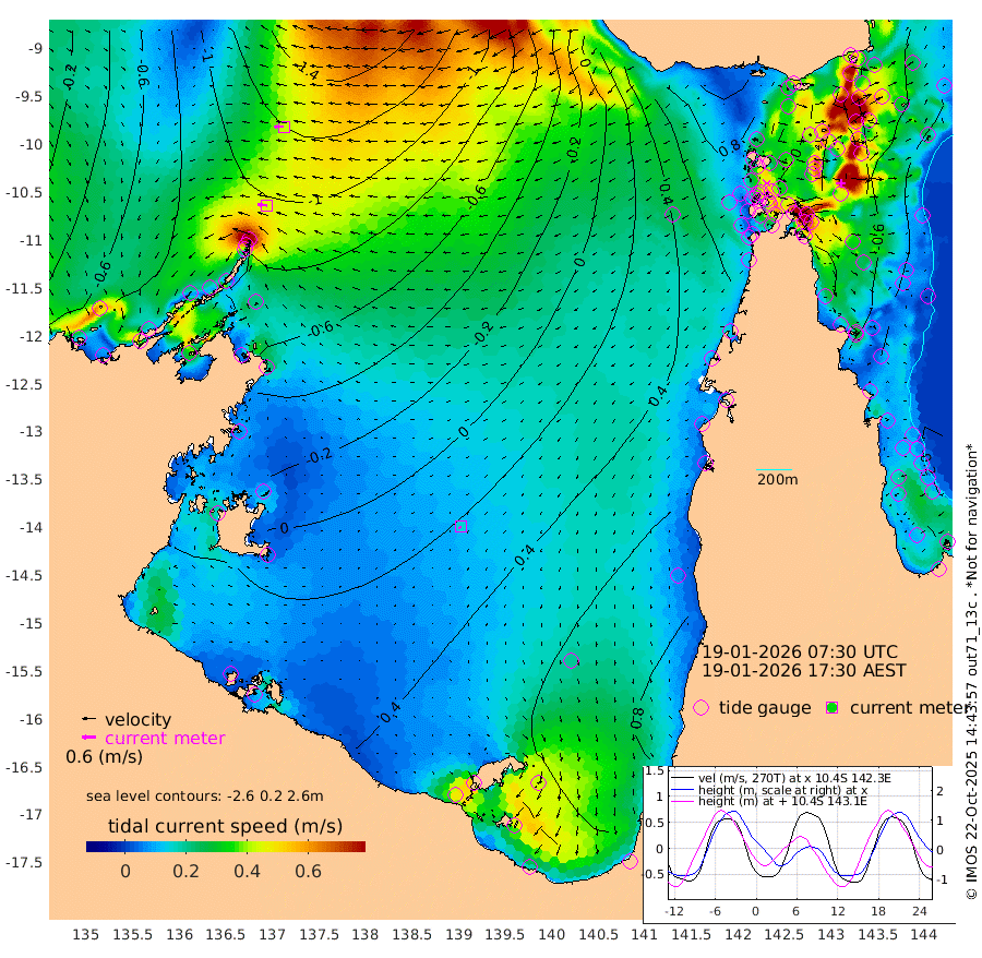 43cm/s -84T +3cm/s rms + 7cm/s -42T. ARA-GOC87 57m 15cm/s -137T +3cm/s rms + 2cm/s -2T. ARA-GOC87 60m 42cm/s -90T +2cm/s rms + 3cm/s 61T. ARA-GOC87 47m -78cm Daru -84cm Bobo Island -38cm Meer Island Barge -66cm Bramble Cay -83cm Unnamed Cay -81cm Pearce Cay -72cm Stephens Island -88cm Merrie England Shoals -92cm Mutacomal Reef -64cm Darnley Island Barge -40cm East Cay -72cm Yorke Island Barge -75cm Rennel Island -72cm Aureed Island -61cm Dungeness Reef -51cm Zagai Island -41cm Yam Island 10cm Dauan Island -1cm Saibai Island 20cm Phipi Reef -34cm Warrior Reef - West -6cm Mabuiag Island Barge -75cm Half Way Island -78cm Coconut Island -74cm Dugong Islet -64cm Poll Island -55cm Kirkcaldie Reef -43cm Suarji Island -60cm Sue Islet 38cm Hawkesbury Island -39cm Alert Patches -47cm Twin Island 25cm Badu Island -40cm St Pauls (Moa Island) 17cm Kubin (Moa Island) -19cm Ince Point -6cm Thursday Island -8cm Nardana Patches 18cm Turtle Head 33cm Round Island 40cm Goods Island 56cm Booby Island 36cm White Rocks Area 37cm Carpentaria -36cm Papou Point 46cm Bampfield Head 56cm Crab Island 47cm Red Wallis Island 31cm Packe Island -86cm Harrington Reef 75cm Herald Camp -8cm Sharp Point 23cm Red Island Point -7cm Possession Island -61cm Alpha Rock -64cm Frederick Point -98cm Wyborn Reef Light -94cm Tetley Island -38cm Triangle Reef -96cm Turtle Head Island -32cm Maclennan Cay -19cm Raine Island -75cm Mcsweeny Reef -67cm Collette Reef -39cm Shadwell Reef -76cm Hannibal Island -68cm Round Point 51cm Vrilya Point -53cm Cape Grenville -41cm Hicks Island -36cm Sir Charles Hardy Island -13cm Harvey Island -46cm Kay Reef -26cm Rocky Island -25cm Chapman Island -21cm Ham Reef -28cm Jubilee Reef -24cm Night Island -24cm Unnamed Reef No. 3 -30cm Morris Island -22cm 1st 3 Mile Opening -24cm Creech Reef -32cm Fife Island -31cm Eden Reef -30cm Stanley Island -39cm Normanby River -97cm Yabooma Island -120cm Hutchison River -99cm Elcho Island -87cm North West Crocodile Island -120cm Cape Wessel -130cm Stevens Island -128cm Guluwuru Island -99cm Hopeful Bay -112cm Auster Point -105cm Two Island Bay -131cm Cadell Strait -219cm Mallison Island -109cm Melville Bay (Gove Harbour) -123cm Truant Island -79cm Cape Arnhem -51cm Cape Grey -28cm Hawk Island -11cm Milner Bay (Groote Eylandt) 7cm Cape Beatrice 37cm West Island 44cm Centre Island 86cm Mornington Island 74cm West Wellesley Islands 106cm Bountiful Island 108cm Albert River Mouth 100cm Sweers Island 132cm Karumba 98cm Nassau River Offshore 93cm Christmas Creek 71cm Archer River 57cm Boyd Point 74cm Weipa (Humbug Point) 42cm Pennefather River 64cm Cullen Point