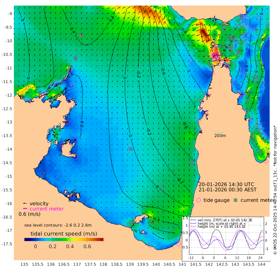 26cm/s 60T +3cm/s rms + 7cm/s -42T. ARA-GOC87 57m 22cm/s -6T +3cm/s rms + 2cm/s -2T. ARA-GOC87 60m 33cm/s 54T +2cm/s rms + 3cm/s 61T. ARA-GOC87 47m 50cm Daru 51cm Bobo Island -7cm Meer Island Barge 17cm Bramble Cay 37cm Unnamed Cay 37cm Pearce Cay 25cm Stephens Island 39cm Merrie England Shoals 50cm Mutacomal Reef 22cm Darnley Island Barge -6cm East Cay 35cm Yorke Island Barge 31cm Rennel Island 38cm Aureed Island 32cm Dungeness Reef 38cm Zagai Island 21cm Yam Island -7cm Dauan Island 4cm Saibai Island 12cm Phipi Reef 32cm Warrior Reef - West -23cm Mabuiag Island Barge 29cm Half Way Island 41cm Coconut Island 29cm Dugong Islet 31cm Poll Island 23cm Kirkcaldie Reef 21cm Suarji Island 35cm Sue Islet -142cm Hawkesbury Island -2cm Alert Patches 3cm Twin Island -108cm Badu Island 6cm St Pauls (Moa Island) -101cm Kubin (Moa Island) -34cm Ince Point -58cm Thursday Island -51cm Nardana Patches -93cm Turtle Head -110cm Round Island -147cm Goods Island -181cm Booby Island -162cm White Rocks Area -172cm Carpentaria -3cm Papou Point -181cm Bampfield Head -152cm Crab Island -171cm Red Wallis Island -127cm Packe Island 41cm Harrington Reef -169cm Herald Camp 13cm Sharp Point -78cm Red Island Point -37cm Possession Island 17cm Alpha Rock 22cm Frederick Point 51cm Wyborn Reef Light 48cm Tetley Island -5cm Triangle Reef 39cm Turtle Head Island -16cm Maclennan Cay -27cm Raine Island 31cm Mcsweeny Reef 27cm Collette Reef -2cm Shadwell Reef 31cm Hannibal Island 16cm Round Point -149cm Vrilya Point 3cm Cape Grenville -4cm Hicks Island -20cm Sir Charles Hardy Island 0cm Harvey Island -7cm Kay Reef -18cm Rocky Island -23cm Chapman Island -28cm Ham Reef -21cm Jubilee Reef -18cm Night Island -27cm Unnamed Reef No. 3 -20cm Morris Island -31cm 1st 3 Mile Opening -26cm Creech Reef -11cm Fife Island -28cm Eden Reef -22cm Stanley Island -16cm Normanby River 21cm Yabooma Island 33cm Hutchison River 27cm Elcho Island 27cm North West Crocodile Island 43cm Cape Wessel 59cm Stevens Island 64cm Guluwuru Island 45cm Hopeful Bay 45cm Auster Point 36cm Two Island Bay 65cm Cadell Strait 153cm Mallison Island 64cm Melville Bay (Gove Harbour) 62cm Truant Island 51cm Cape Arnhem 63cm Cape Grey 65cm Hawk Island 76cm Milner Bay (Groote Eylandt) 65cm Cape Beatrice 70cm West Island 66cm Centre Island 77cm Mornington Island 77cm West Wellesley Islands 96cm Bountiful Island 124cm Albert River Mouth 167cm Sweers Island 114cm Karumba 23cm Nassau River Offshore -32cm Christmas Creek -77cm Archer River -101cm Boyd Point -113cm Weipa (Humbug Point) -93cm Pennefather River -144cm Cullen Point