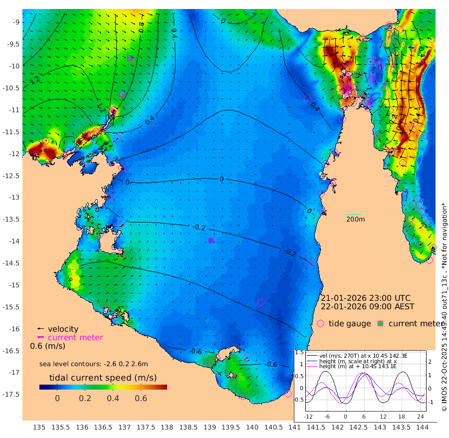 20cm/s 138T +3cm/s rms + 7cm/s -42T. ARA-GOC87 57m 5cm/s 25T +3cm/s rms + 2cm/s -2T. ARA-GOC87 60m 24cm/s 133T +2cm/s rms + 3cm/s 61T. ARA-GOC87 47m -29cm Daru -14cm Bobo Island 40cm Meer Island Barge 28cm Bramble Cay 4cm Unnamed Cay 10cm Pearce Cay 16cm Stephens Island 6cm Merrie England Shoals -21cm Mutacomal Reef 14cm Darnley Island Barge 41cm East Cay -5cm Yorke Island Barge -2cm Rennel Island -10cm Aureed Island -20cm Dungeness Reef -59cm Zagai Island -49cm Yam Island -72cm Dauan Island -75cm Saibai Island -79cm Phipi Reef -71cm Warrior Reef - West -31cm Mabuiag Island Barge 1cm Half Way Island -25cm Coconut Island -7cm Dugong Islet -33cm Poll Island -29cm Kirkcaldie Reef -44cm Suarji Island -42cm Sue Islet 75cm Hawkesbury Island -28cm Alert Patches -29cm Twin Island 45cm Badu Island -42cm St Pauls (Moa Island) 38cm Kubin (Moa Island) -12cm Ince Point 6cm Thursday Island 0cm Nardana Patches 30cm Turtle Head 42cm Round Island 80cm Goods Island 101cm Booby Island 102cm White Rocks Area 88cm Carpentaria -21cm Papou Point 104cm Bampfield Head 72cm Crab Island 87cm Red Wallis Island 47cm Packe Island -15cm Harrington Reef 65cm Herald Camp -33cm Sharp Point 27cm Red Island Point -1cm Possession Island -35cm Alpha Rock -27cm Frederick Point -22cm Wyborn Reef Light -28cm Tetley Island 24cm Triangle Reef 5cm Turtle Head Island 40cm Maclennan Cay 51cm Raine Island 4cm Mcsweeny Reef 6cm Collette Reef 27cm Shadwell Reef 12cm Hannibal Island 30cm Round Point 69cm Vrilya Point 31cm Cape Grenville 37cm Hicks Island 42cm Sir Charles Hardy Island 9cm Harvey Island 45cm Kay Reef 47cm Rocky Island 50cm Chapman Island 50cm Ham Reef 49cm Jubilee Reef 37cm Night Island 50cm Unnamed Reef No. 3 52cm Morris Island 58cm 1st 3 Mile Opening 52cm Creech Reef 37cm Fife Island 70cm Eden Reef 54cm Stanley Island 62cm Normanby River 177cm Yabooma Island 195cm Hutchison River 169cm Elcho Island 160cm North West Crocodile Island 102cm Cape Wessel 132cm Stevens Island 69cm Guluwuru Island 122cm Hopeful Bay 117cm Auster Point 118cm Two Island Bay 134cm Cadell Strait -74cm Mallison Island 60cm Melville Bay (Gove Harbour) 68cm Truant Island 29cm Cape Arnhem 9cm Cape Grey -16cm Hawk Island -34cm Milner Bay (Groote Eylandt) -41cm Cape Beatrice -76cm West Island -78cm Centre Island -113cm Mornington Island -103cm West Wellesley Islands -107cm Bountiful Island -122cm Albert River Mouth -140cm Sweers Island -134cm Karumba -86cm Nassau River Offshore -51cm Christmas Creek 7cm Archer River 26cm Boyd Point 37cm Weipa (Humbug Point) 30cm Pennefather River 52cm Cullen Point