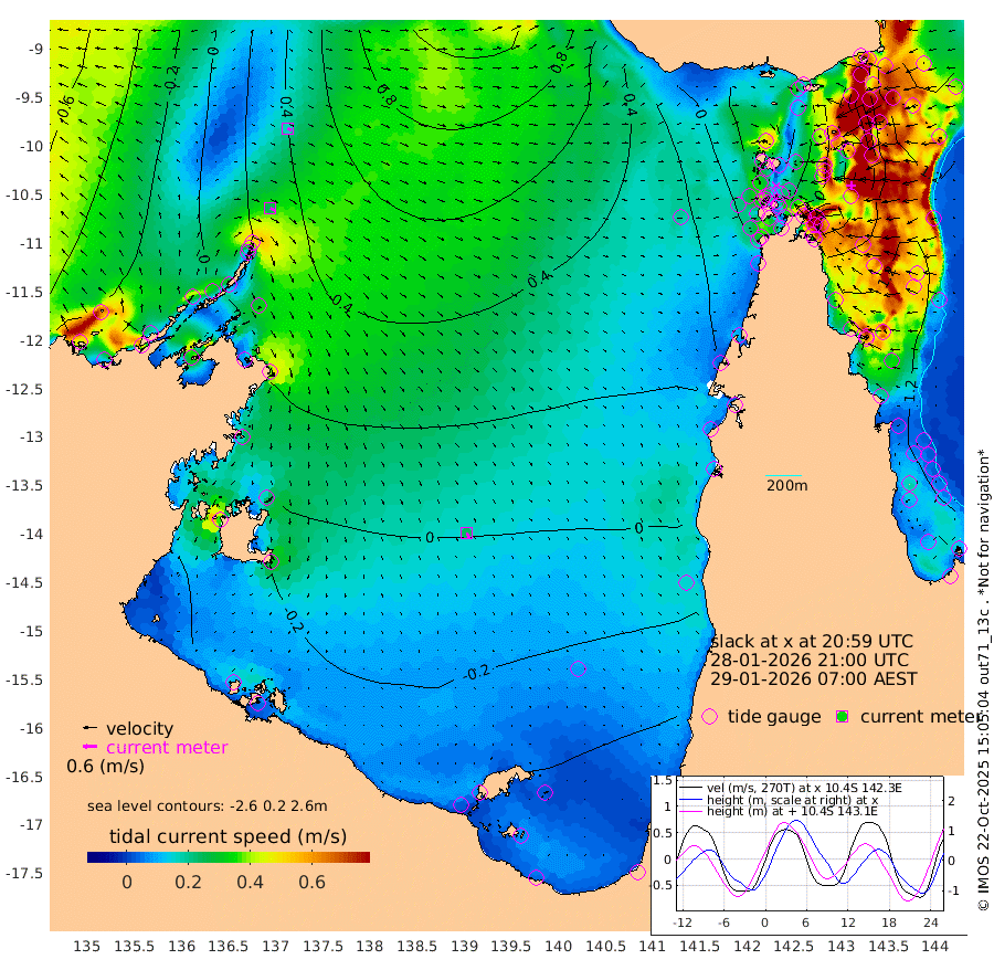 26cm/s 116T +3cm/s rms + 7cm/s -42T. ARA-GOC87 57m 24cm/s 158T +3cm/s rms + 2cm/s -2T. ARA-GOC87 60m 17cm/s 119T +2cm/s rms + 3cm/s 61T. ARA-GOC87 47m 94cm Daru 103cm Bobo Island 117cm Meer Island Barge 124cm Bramble Cay 120cm Unnamed Cay 116cm Pearce Cay 125cm Stephens Island 129cm Merrie England Shoals 100cm Mutacomal Reef 125cm Darnley Island Barge 119cm East Cay 110cm Yorke Island Barge 104cm Rennel Island 101cm Aureed Island 79cm Dungeness Reef 25cm Zagai Island 22cm Yam Island -35cm Dauan Island -33cm Saibai Island -23cm Phipi Reef 16cm Warrior Reef - West -27cm Mabuiag Island Barge 109cm Half Way Island 83cm Coconut Island 98cm Dugong Islet 53cm Poll Island 65cm Kirkcaldie Reef 18cm Suarji Island 51cm Sue Islet 4cm Hawkesbury Island 30cm Alert Patches 31cm Twin Island -7cm Badu Island 13cm St Pauls (Moa Island) 8cm Kubin (Moa Island) 13cm Ince Point 11cm Thursday Island 9cm Nardana Patches 12cm Turtle Head 0cm Round Island 16cm Goods Island 16cm Booby Island 11cm White Rocks Area 33cm Carpentaria 15cm Papou Point 24cm Bampfield Head 9cm Crab Island 11cm Red Wallis Island 15cm Packe Island 99cm Harrington Reef 0cm Herald Camp -6cm Sharp Point 3cm Red Island Point 17cm Possession Island 33cm Alpha Rock 58cm Frederick Point 93cm Wyborn Reef Light 81cm Tetley Island 92cm Triangle Reef 114cm Turtle Head Island 107cm Maclennan Cay 102cm Raine Island 114cm Mcsweeny Reef 114cm Collette Reef 107cm Shadwell Reef 130cm Hannibal Island 127cm Round Point 23cm Vrilya Point 123cm Cape Grenville 115cm Hicks Island 119cm Sir Charles Hardy Island 37cm Harvey Island 125cm Kay Reef 109cm Rocky Island 105cm Chapman Island 104cm Ham Reef 110cm Jubilee Reef 102cm Night Island 107cm Unnamed Reef No. 3 117cm Morris Island 113cm 1st 3 Mile Opening 115cm Creech Reef 110cm Fife Island 138cm Eden Reef 124cm Stanley Island 130cm Normanby River -26cm Yabooma Island -7cm Hutchison River -19cm Elcho Island -32cm North West Crocodile Island 20cm Cape Wessel -4cm Stevens Island 65cm Guluwuru Island -6cm Hopeful Bay 11cm Auster Point 12cm Two Island Bay 23cm Cadell Strait 166cm Mallison Island 39cm Melville Bay (Gove Harbour) 47cm Truant Island 32cm Cape Arnhem 7cm Cape Grey -9cm Hawk Island -42cm Milner Bay (Groote Eylandt) -42cm Cape Beatrice -65cm West Island -65cm Centre Island -65cm Mornington Island -62cm West Wellesley Islands -96cm Bountiful Island -130cm Albert River Mouth -139cm Sweers Island -131cm Karumba -38cm Nassau River Offshore -3cm Christmas Creek 19cm Archer River 26cm Boyd Point 19cm Weipa (Humbug Point) 31cm Pennefather River 12cm Cullen Point