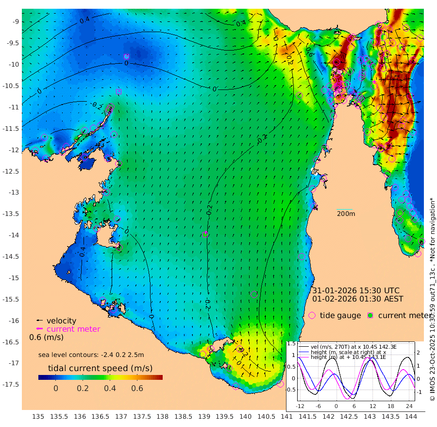 11cm/s 27T +3cm/s rms + 7cm/s -42T. ARA-GOC87 57m 35cm/s 14T +3cm/s rms + 2cm/s -2T. ARA-GOC87 60m 12cm/s 55T +2cm/s rms + 3cm/s 61T. ARA-GOC87 47m -60cm Daru -68cm Bobo Island -111cm Meer Island Barge -112cm Bramble Cay -89cm Unnamed Cay -91cm Pearce Cay -99cm Stephens Island -96cm Merrie England Shoals -65cm Mutacomal Reef -98cm Darnley Island Barge -122cm East Cay -75cm Yorke Island Barge -78cm Rennel Island -71cm Aureed Island -56cm Dungeness Reef 0cm Zagai Island -8cm Yam Island 3cm Dauan Island 15cm Saibai Island -15cm Phipi Reef -14cm Warrior Reef - West 18cm Mabuiag Island Barge -73cm Half Way Island -47cm Coconut Island -63cm Dugong Islet -24cm Poll Island -37cm Kirkcaldie Reef -1cm Suarji Island -16cm Sue Islet -59cm Hawkesbury Island -11cm Alert Patches -8cm Twin Island -41cm Badu Island 11cm St Pauls (Moa Island) -40cm Kubin (Moa Island) -10cm Ince Point -15cm Thursday Island -13cm Nardana Patches -47cm Turtle Head -39cm Round Island -72cm Goods Island -68cm Booby Island -65cm White Rocks Area -28cm Carpentaria 4cm Papou Point -62cm Bampfield Head -53cm Crab Island -64cm Red Wallis Island -62cm Packe Island -52cm Harrington Reef -67cm Herald Camp 17cm Sharp Point -39cm Red Island Point -14cm Possession Island -1cm Alpha Rock -25cm Frederick Point -48cm Wyborn Reef Light -36cm Tetley Island -91cm Triangle Reef -55cm Turtle Head Island -108cm Maclennan Cay -115cm Raine Island -84cm Mcsweeny Reef -91cm Collette Reef -103cm Shadwell Reef -103cm Hannibal Island -116cm Round Point -41cm Vrilya Point -112cm Cape Grenville -114cm Hicks Island -128cm Sir Charles Hardy Island -34cm Harvey Island -124cm Kay Reef -120cm Rocky Island -126cm Chapman Island -118cm Ham Reef -117cm Jubilee Reef -107cm Night Island -122cm Unnamed Reef No. 3 -126cm Morris Island -119cm 1st 3 Mile Opening -123cm Creech Reef -119cm Fife Island -153cm Eden Reef -130cm Stanley Island -138cm Normanby River -37cm Yabooma Island -57cm Hutchison River -36cm Elcho Island -30cm North West Crocodile Island -7cm Cape Wessel -16cm Stevens Island -32cm Guluwuru Island -26cm Hopeful Bay -11cm Auster Point -9cm Two Island Bay -43cm Cadell Strait -54cm Mallison Island -20cm Melville Bay (Gove Harbour) -17cm Truant Island -8cm Cape Arnhem 12cm Cape Grey 14cm Hawk Island 56cm Milner Bay (Groote Eylandt) 38cm Cape Beatrice 69cm West Island 69cm Centre Island -6cm Mornington Island -6cm West Wellesley Islands -19cm Bountiful Island -4cm Albert River Mouth 32cm Sweers Island -11cm Karumba -59cm Nassau River Offshore -88cm Christmas Creek -87cm Archer River -71cm Boyd Point -91cm Weipa (Humbug Point) -44cm Pennefather River -51cm Cullen Point