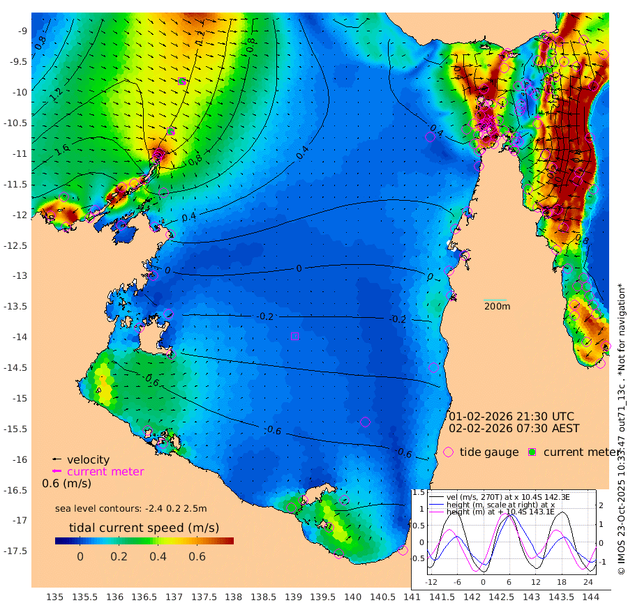 32cm/s 126T +3cm/s rms + 7cm/s -42T. ARA-GOC87 57m 5cm/s 116T +3cm/s rms + 2cm/s -2T. ARA-GOC87 60m 33cm/s 122T +2cm/s rms + 3cm/s 61T. ARA-GOC87 47m -53cm Daru -33cm Bobo Island 48cm Meer Island Barge 34cm Bramble Cay -6cm Unnamed Cay -8cm Pearce Cay 5cm Stephens Island 3cm Merrie England Shoals -39cm Mutacomal Reef 10cm Darnley Island Barge 50cm East Cay -20cm Yorke Island Barge -25cm Rennel Island -32cm Aureed Island -57cm Dungeness Reef -98cm Zagai Island -94cm Yam Island -112cm Dauan Island -102cm Saibai Island -123cm Phipi Reef -112cm Warrior Reef - West -65cm Mabuiag Island Barge -25cm Half Way Island -53cm Coconut Island -42cm Dugong Islet -74cm Poll Island -72cm Kirkcaldie Reef -100cm Suarji Island -75cm Sue Islet 61cm Hawkesbury Island -72cm Alert Patches -74cm Twin Island 22cm Badu Island -94cm St Pauls (Moa Island) 9cm Kubin (Moa Island) -54cm Ince Point -34cm Thursday Island -41cm Nardana Patches -3cm Turtle Head 22cm Round Island 59cm Goods Island 85cm Booby Island 78cm White Rocks Area 81cm Carpentaria -66cm Papou Point 95cm Bampfield Head 61cm Crab Island 71cm Red Wallis Island 27cm Packe Island -53cm Harrington Reef 49cm Herald Camp -49cm Sharp Point 0cm Red Island Point -37cm Possession Island -67cm Alpha Rock -66cm Frederick Point -40cm Wyborn Reef Light -50cm Tetley Island 30cm Triangle Reef -24cm Turtle Head Island 41cm Maclennan Cay 65cm Raine Island -7cm Mcsweeny Reef 5cm Collette Reef 38cm Shadwell Reef 12cm Hannibal Island 38cm Round Point 64cm Vrilya Point 37cm Cape Grenville 41cm Hicks Island 50cm Sir Charles Hardy Island 9cm Harvey Island 62cm Kay Reef 62cm Rocky Island 74cm Chapman Island 71cm Ham Reef 63cm Jubilee Reef 48cm Night Island 70cm Unnamed Reef No. 3 66cm Morris Island 65cm 1st 3 Mile Opening 64cm Creech Reef 53cm Fife Island 92cm Eden Reef 70cm Stanley Island 77cm Normanby River 201cm Yabooma Island 223cm Hutchison River 196cm Elcho Island 182cm North West Crocodile Island 138cm Cape Wessel 173cm Stevens Island 108cm Guluwuru Island 167cm Hopeful Bay 148cm Auster Point 151cm Two Island Bay 176cm Cadell Strait 88cm Mallison Island 94cm Melville Bay (Gove Harbour) 105cm Truant Island 53cm Cape Arnhem 13cm Cape Grey -10cm Hawk Island -50cm Milner Bay (Groote Eylandt) -63cm Cape Beatrice -117cm West Island -116cm Centre Island -147cm Mornington Island -143cm West Wellesley Islands -151cm Bountiful Island -173cm Albert River Mouth -181cm Sweers Island -179cm Karumba -108cm Nassau River Offshore -62cm Christmas Creek 10cm Archer River 27cm Boyd Point 36cm Weipa (Humbug Point) 33cm Pennefather River 52cm Cullen Point