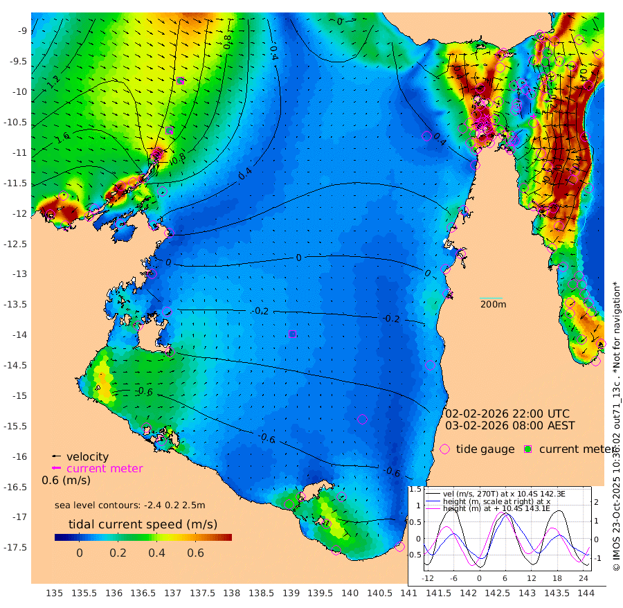 25cm/s 131T +3cm/s rms + 7cm/s -42T. ARA-GOC87 57m 3cm/s 67T +3cm/s rms + 2cm/s -2T. ARA-GOC87 60m 27cm/s 127T +2cm/s rms + 3cm/s 61T. ARA-GOC87 47m -54cm Daru -38cm Bobo Island 37cm Meer Island Barge 26cm Bramble Cay -8cm Unnamed Cay -14cm Pearce Cay -3cm Stephens Island 0cm Merrie England Shoals -37cm Mutacomal Reef 1cm Darnley Island Barge 40cm East Cay -26cm Yorke Island Barge -26cm Rennel Island -37cm Aureed Island -56cm Dungeness Reef -93cm Zagai Island -86cm Yam Island -101cm Dauan Island -94cm Saibai Island -112cm Phipi Reef -106cm Warrior Reef - West -52cm Mabuiag Island Barge -28cm Half Way Island -52cm Coconut Island -42cm Dugong Islet -69cm Poll Island -69cm Kirkcaldie Reef -88cm Suarji Island -71cm Sue Islet 72cm Hawkesbury Island -61cm Alert Patches -64cm Twin Island 33cm Badu Island -83cm St Pauls (Moa Island) 20cm Kubin (Moa Island) -43cm Ince Point -22cm Thursday Island -29cm Nardana Patches 8cm Turtle Head 37cm Round Island 69cm Goods Island 94cm Booby Island 90cm White Rocks Area 84cm Carpentaria -58cm Papou Point 109cm Bampfield Head 66cm Crab Island 80cm Red Wallis Island 37cm Packe Island -53cm Harrington Reef 63cm Herald Camp -45cm Sharp Point 7cm Red Island Point -26cm Possession Island -57cm Alpha Rock -60cm Frederick Point -38cm Wyborn Reef Light -46cm Tetley Island 23cm Triangle Reef -25cm Turtle Head Island 33cm Maclennan Cay 55cm Raine Island -12cm Mcsweeny Reef 0cm Collette Reef 30cm Shadwell Reef 6cm Hannibal Island 31cm Round Point 65cm Vrilya Point 31cm Cape Grenville 32cm Hicks Island 41cm Sir Charles Hardy Island 6cm Harvey Island 53cm Kay Reef 52cm Rocky Island 64cm Chapman Island 60cm Ham Reef 53cm Jubilee Reef 39cm Night Island 59cm Unnamed Reef No. 3 56cm Morris Island 55cm 1st 3 Mile Opening 52cm Creech Reef 42cm Fife Island 77cm Eden Reef 60cm Stanley Island 65cm Normanby River 207cm Yabooma Island 225cm Hutchison River 199cm Elcho Island 186cm North West Crocodile Island 132cm Cape Wessel 173cm Stevens Island 92cm Guluwuru Island 169cm Hopeful Bay 146cm Auster Point 146cm Two Island Bay 163cm Cadell Strait 51cm Mallison Island 85cm Melville Bay (Gove Harbour) 94cm Truant Island 44cm Cape Arnhem 10cm Cape Grey -8cm Hawk Island -43cm Milner Bay (Groote Eylandt) -55cm Cape Beatrice -104cm West Island -103cm Centre Island -137cm Mornington Island -131cm West Wellesley Islands -134cm Bountiful Island -153cm Albert River Mouth -160cm Sweers Island -161cm Karumba -102cm Nassau River Offshore -61cm Christmas Creek 9cm Archer River 26cm Boyd Point 38cm Weipa (Humbug Point) 30cm Pennefather River 55cm Cullen Point
