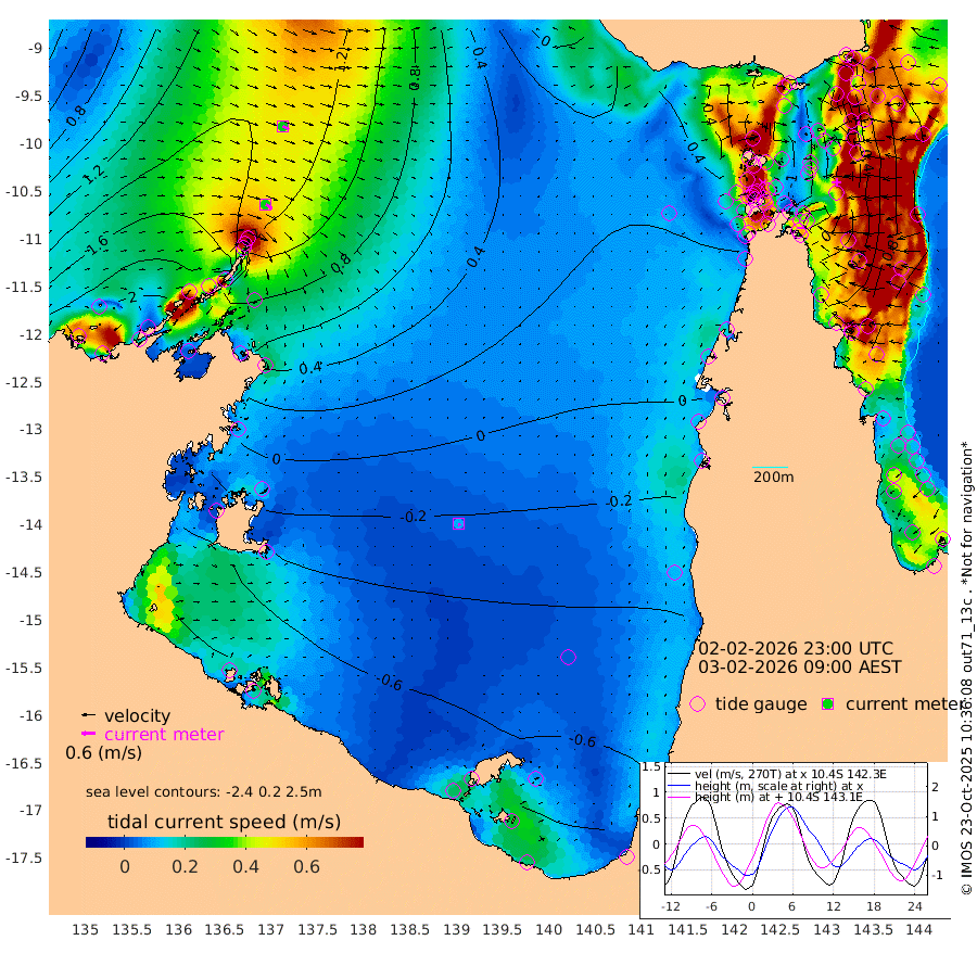 33cm/s 122T +3cm/s rms + 7cm/s -42T. ARA-GOC87 57m 10cm/s 162T +3cm/s rms + 2cm/s -2T. ARA-GOC87 60m 32cm/s 117T +2cm/s rms + 3cm/s 61T. ARA-GOC87 47m 28cm Daru 45cm Bobo Island 88cm Meer Island Barge 93cm Bramble Cay 69cm Unnamed Cay 71cm Pearce Cay 74cm Stephens Island 77cm Merrie England Shoals 45cm Mutacomal Reef 71cm Darnley Island Barge 97cm East Cay 49cm Yorke Island Barge 53cm Rennel Island 42cm Aureed Island 20cm Dungeness Reef -32cm Zagai Island -26cm Yam Island -61cm Dauan Island -59cm Saibai Island -66cm Phipi Reef -40cm Warrior Reef - West -27cm Mabuiag Island Barge 49cm Half Way Island 24cm Coconut Island 37cm Dugong Islet 1cm Poll Island 1cm Kirkcaldie Reef -28cm Suarji Island -8cm Sue Islet 81cm Hawkesbury Island -9cm Alert Patches -8cm Twin Island 43cm Badu Island -30cm St Pauls (Moa Island) 42cm Kubin (Moa Island) -3cm Ince Point 7cm Thursday Island 3cm Nardana Patches 31cm Turtle Head 48cm Round Island 74cm Goods Island 82cm Booby Island 87cm White Rocks Area 58cm Carpentaria -12cm Papou Point 100cm Bampfield Head 53cm Crab Island 75cm Red Wallis Island 55cm Packe Island 32cm Harrington Reef 64cm Herald Camp -32cm Sharp Point 27cm Red Island Point 9cm Possession Island -3cm Alpha Rock 8cm Frederick Point 43cm Wyborn Reef Light 32cm Tetley Island 73cm Triangle Reef 58cm Turtle Head Island 83cm Maclennan Cay 92cm Raine Island 62cm Mcsweeny Reef 67cm Collette Reef 78cm Shadwell Reef 79cm Hannibal Island 101cm Round Point 45cm Vrilya Point 90cm Cape Grenville 90cm Hicks Island 98cm Sir Charles Hardy Island 25cm Harvey Island 105cm Kay Reef 96cm Rocky Island 106cm Chapman Island 98cm Ham Reef 95cm Jubilee Reef 81cm Night Island 99cm Unnamed Reef No. 3 102cm Morris Island 94cm 1st 3 Mile Opening 96cm Creech Reef 93cm Fife Island 126cm Eden Reef 105cm Stanley Island 119cm Normanby River 223cm Yabooma Island 251cm Hutchison River 212cm Elcho Island 197cm North West Crocodile Island 157cm Cape Wessel 196cm Stevens Island 133cm Guluwuru Island 184cm Hopeful Bay 167cm Auster Point 168cm Two Island Bay 205cm Cadell Strait 121cm Mallison Island 118cm Melville Bay (Gove Harbour) 130cm Truant Island 69cm Cape Arnhem 22cm Cape Grey 0cm Hawk Island -55cm Milner Bay (Groote Eylandt) -65cm Cape Beatrice -127cm West Island -130cm Centre Island -141cm Mornington Island -133cm West Wellesley Islands -139cm Bountiful Island -170cm Albert River Mouth -182cm Sweers Island -174cm Karumba -95cm Nassau River Offshore -49cm Christmas Creek 11cm Archer River 26cm Boyd Point 35cm Weipa (Humbug Point) 21cm Pennefather River 40cm Cullen Point