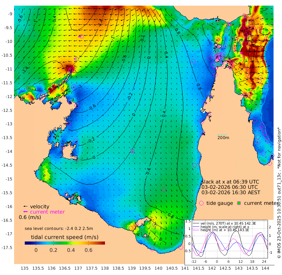 43cm/s -87T +3cm/s rms + 7cm/s -42T. ARA-GOC87 57m 20cm/s -177T +3cm/s rms + 2cm/s -2T. ARA-GOC87 60m 50cm/s -95T +2cm/s rms + 3cm/s 61T. ARA-GOC87 47m -45cm Daru -67cm Bobo Island -66cm Meer Island Barge -82cm Bramble Cay -72cm Unnamed Cay -79cm Pearce Cay -76cm Stephens Island -78cm Merrie England Shoals -56cm Mutacomal Reef -70cm Darnley Island Barge -73cm East Cay -58cm Yorke Island Barge -57cm Rennel Island -60cm Aureed Island -28cm Dungeness Reef 16cm Zagai Island 28cm Yam Island 91cm Dauan Island 85cm Saibai Island 82cm Phipi Reef 34cm Warrior Reef - West 77cm Mabuiag Island Barge -54cm Half Way Island -38cm Coconut Island -42cm Dugong Islet -9cm Poll Island 1cm Kirkcaldie Reef 20cm Suarji Island 3cm Sue Islet 94cm Hawkesbury Island 35cm Alert Patches 26cm Twin Island 92cm Badu Island 43cm St Pauls (Moa Island) 73cm Kubin (Moa Island) 55cm Ince Point 67cm Thursday Island 65cm Nardana Patches 77cm Turtle Head 77cm Round Island 86cm Goods Island 104cm Booby Island 81cm White Rocks Area 98cm Carpentaria 34cm Papou Point 81cm Bampfield Head 105cm Crab Island 101cm Red Wallis Island 83cm Packe Island -49cm Harrington Reef 111cm Herald Camp 25cm Sharp Point 77cm Red Island Point 44cm Possession Island 12cm Alpha Rock -6cm Frederick Point -57cm Wyborn Reef Light -45cm Tetley Island -50cm Triangle Reef -64cm Turtle Head Island -55cm Maclennan Cay -53cm Raine Island -67cm Mcsweeny Reef -65cm Collette Reef -55cm Shadwell Reef -79cm Hannibal Island -87cm Round Point 107cm Vrilya Point -71cm Cape Grenville -68cm Hicks Island -61cm Sir Charles Hardy Island -20cm Harvey Island -74cm Kay Reef -62cm Rocky Island -64cm Chapman Island -55cm Ham Reef -58cm Jubilee Reef -54cm Night Island -57cm Unnamed Reef No. 3 -67cm Morris Island -56cm 1st 3 Mile Opening -58cm Creech Reef -69cm Fife Island -83cm Eden Reef -67cm Stanley Island -85cm Normanby River -211cm Yabooma Island -248cm Hutchison River -212cm Elcho Island -194cm North West Crocodile Island -180cm Cape Wessel -217cm Stevens Island -171cm Guluwuru Island -195cm Hopeful Bay -187cm Auster Point -182cm Two Island Bay -226cm Cadell Strait -189cm Mallison Island -160cm Melville Bay (Gove Harbour) -171cm Truant Island -109cm Cape Arnhem -77cm Cape Grey -59cm Hawk Island -34cm Milner Bay (Groote Eylandt) -13cm Cape Beatrice 30cm West Island 34cm Centre Island 51cm Mornington Island 44cm West Wellesley Islands 39cm Bountiful Island 32cm Albert River Mouth 5cm Sweers Island 54cm Karumba 73cm Nassau River Offshore 86cm Christmas Creek 78cm Archer River 79cm Boyd Point 83cm Weipa (Humbug Point) 81cm Pennefather River 103cm Cullen Point