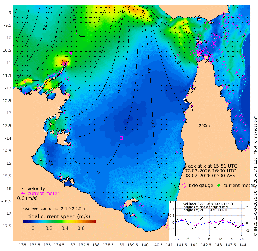 36cm/s 99T +3cm/s rms + 7cm/s -42T. ARA-GOC87 57m 2cm/s 17T +3cm/s rms + 2cm/s -2T. ARA-GOC87 60m 35cm/s 87T +2cm/s rms + 3cm/s 61T. ARA-GOC87 47m 12cm Daru 21cm Bobo Island 6cm Meer Island Barge 9cm Bramble Cay 2cm Unnamed Cay 17cm Pearce Cay 5cm Stephens Island 2cm Merrie England Shoals 1cm Mutacomal Reef 10cm Darnley Island Barge 5cm East Cay 10cm Yorke Island Barge 0cm Rennel Island 14cm Aureed Island 1cm Dungeness Reef 13cm Zagai Island -10cm Yam Island 8cm Dauan Island 12cm Saibai Island 13cm Phipi Reef 13cm Warrior Reef - West -15cm Mabuiag Island Barge -5cm Half Way Island 10cm Coconut Island -11cm Dugong Islet -3cm Poll Island -13cm Kirkcaldie Reef -10cm Suarji Island 0cm Sue Islet -68cm Hawkesbury Island -19cm Alert Patches -18cm Twin Island -35cm Badu Island -16cm St Pauls (Moa Island) -52cm Kubin (Moa Island) -30cm Ince Point -40cm Thursday Island -36cm Nardana Patches -46cm Turtle Head -59cm Round Island -63cm Goods Island -80cm Booby Island -79cm White Rocks Area -83cm Carpentaria -17cm Papou Point -83cm Bampfield Head -62cm Crab Island -79cm Red Wallis Island -62cm Packe Island -5cm Harrington Reef -91cm Herald Camp -4cm Sharp Point -39cm Red Island Point -32cm Possession Island -17cm Alpha Rock -8cm Frederick Point 8cm Wyborn Reef Light 6cm Tetley Island 7cm Triangle Reef 3cm Turtle Head Island -4cm Maclennan Cay 4cm Raine Island 8cm Mcsweeny Reef 9cm Collette Reef 6cm Shadwell Reef 10cm Hannibal Island 9cm Round Point -64cm Vrilya Point -3cm Cape Grenville 2cm Hicks Island -5cm Sir Charles Hardy Island -1cm Harvey Island -1cm Kay Reef 3cm Rocky Island 8cm Chapman Island 2cm Ham Reef 3cm Jubilee Reef 1cm Night Island 3cm Unnamed Reef No. 3 2cm Morris Island -2cm 1st 3 Mile Opening 0cm Creech Reef 12cm Fife Island 5cm Eden Reef -4cm Stanley Island -2cm Normanby River 65cm Yabooma Island 95cm Hutchison River 77cm Elcho Island 67cm North West Crocodile Island 77cm Cape Wessel 92cm Stevens Island 103cm Guluwuru Island 79cm Hopeful Bay 77cm Auster Point 70cm Two Island Bay 124cm Cadell Strait 196cm Mallison Island 95cm Melville Bay (Gove Harbour) 99cm Truant Island 72cm Cape Arnhem 51cm Cape Grey 40cm Hawk Island 17cm Milner Bay (Groote Eylandt) 5cm Cape Beatrice -25cm West Island -27cm Centre Island 0cm Mornington Island -8cm West Wellesley Islands 4cm Bountiful Island 18cm Albert River Mouth 39cm Sweers Island 14cm Karumba -8cm Nassau River Offshore -19cm Christmas Creek -25cm Archer River -37cm Boyd Point -41cm Weipa (Humbug Point) -33cm Pennefather River -64cm Cullen Point