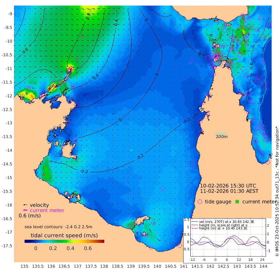 29cm/s 113T +3cm/s rms + 7cm/s -42T. ARA-GOC87 57m 12cm/s 10T +3cm/s rms + 2cm/s -2T. ARA-GOC87 60m 30cm/s 104T +2cm/s rms + 3cm/s 61T. ARA-GOC87 47m -45cm Daru -50cm Bobo Island -45cm Meer Island Barge -53cm Bramble Cay -55cm Unnamed Cay -53cm Pearce Cay -56cm Stephens Island -60cm Merrie England Shoals -56cm Mutacomal Reef -54cm Darnley Island Barge -54cm East Cay -51cm Yorke Island Barge -54cm Rennel Island -55cm Aureed Island -43cm Dungeness Reef -21cm Zagai Island -27cm Yam Island 8cm Dauan Island -3cm Saibai Island 1cm Phipi Reef -24cm Warrior Reef - West 7cm Mabuiag Island Barge -52cm Half Way Island -44cm Coconut Island -55cm Dugong Islet -34cm Poll Island -41cm Kirkcaldie Reef -31cm Suarji Island -35cm Sue Islet 17cm Hawkesbury Island -23cm Alert Patches -25cm Twin Island 24cm Badu Island -14cm St Pauls (Moa Island) 10cm Kubin (Moa Island) -11cm Ince Point -5cm Thursday Island -5cm Nardana Patches -1cm Turtle Head 16cm Round Island 9cm Goods Island 14cm Booby Island 5cm White Rocks Area -4cm Carpentaria -13cm Papou Point 18cm Bampfield Head 18cm Crab Island 5cm Red Wallis Island 0cm Packe Island -56cm Harrington Reef 8cm Herald Camp -7cm Sharp Point -5cm Red Island Point -5cm Possession Island -30cm Alpha Rock -36cm Frederick Point -43cm Wyborn Reef Light -38cm Tetley Island -41cm Triangle Reef -33cm Turtle Head Island -50cm Maclennan Cay -38cm Raine Island -52cm Mcsweeny Reef -53cm Collette Reef -43cm Shadwell Reef -58cm Hannibal Island -54cm Round Point 15cm Vrilya Point -58cm Cape Grenville -50cm Hicks Island -61cm Sir Charles Hardy Island -17cm Harvey Island -59cm Kay Reef -48cm Rocky Island -48cm Chapman Island -48cm Ham Reef -45cm Jubilee Reef -42cm Night Island -51cm Unnamed Reef No. 3 -49cm Morris Island -40cm 1st 3 Mile Opening -49cm Creech Reef -47cm Fife Island -56cm Eden Reef -53cm Stanley Island -60cm Normanby River 126cm Yabooma Island 139cm Hutchison River 124cm Elcho Island 118cm North West Crocodile Island 74cm Cape Wessel 119cm Stevens Island 63cm Guluwuru Island 103cm Hopeful Bay 94cm Auster Point 101cm Two Island Bay 128cm Cadell Strait 38cm Mallison Island 67cm Melville Bay (Gove Harbour) 72cm Truant Island 44cm Cape Arnhem 24cm Cape Grey 17cm Hawk Island 4cm Milner Bay (Groote Eylandt) -13cm Cape Beatrice -41cm West Island -40cm Centre Island -55cm Mornington Island -65cm West Wellesley Islands -60cm Bountiful Island -41cm Albert River Mouth -26cm Sweers Island -40cm Karumba -55cm Nassau River Offshore -51cm Christmas Creek -25cm Archer River -17cm Boyd Point -16cm Weipa (Humbug Point) 8cm Pennefather River 4cm Cullen Point