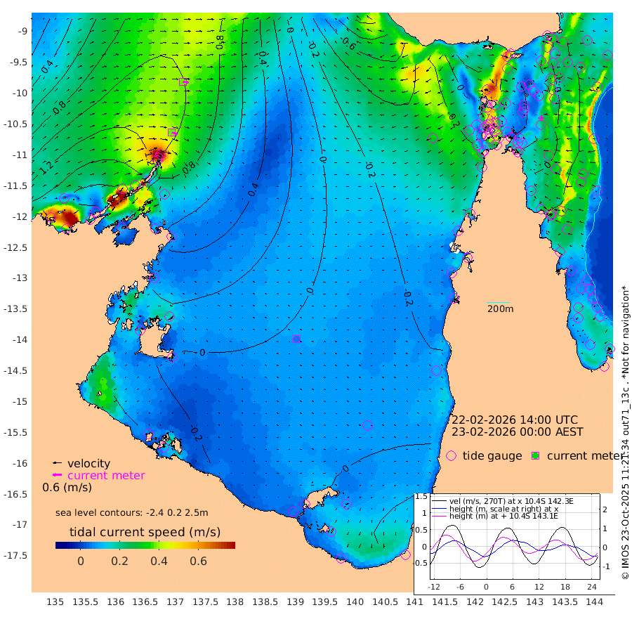 39cm/s 113T +3cm/s rms + 7cm/s -42T. ARA-GOC87 57m 6cm/s -52T +3cm/s rms + 2cm/s -2T. ARA-GOC87 60m 39cm/s 102T +2cm/s rms + 3cm/s 61T. ARA-GOC87 47m 20cm Daru 28cm Bobo Island 29cm Meer Island Barge 30cm Bramble Cay 18cm Unnamed Cay 40cm Pearce Cay 30cm Stephens Island 18cm Merrie England Shoals 8cm Mutacomal Reef 23cm Darnley Island Barge 30cm East Cay 17cm Yorke Island Barge 21cm Rennel Island 24cm Aureed Island 19cm Dungeness Reef 2cm Zagai Island -6cm Yam Island 0cm Dauan Island -24cm Saibai Island 13cm Phipi Reef 4cm Warrior Reef - West -20cm Mabuiag Island Barge 20cm Half Way Island 17cm Coconut Island 11cm Dugong Islet 8cm Poll Island 3cm Kirkcaldie Reef -5cm Suarji Island -11cm Sue Islet -7cm Hawkesbury Island -9cm Alert Patches -5cm Twin Island 9cm Badu Island -7cm St Pauls (Moa Island) 4cm Kubin (Moa Island) -9cm Ince Point -9cm Thursday Island -9cm Nardana Patches 1cm Turtle Head -5cm Round Island 5cm Goods Island -7cm Booby Island -3cm White Rocks Area -48cm Carpentaria -5cm Papou Point -14cm Bampfield Head -1cm Crab Island -9cm Red Wallis Island 3cm Packe Island 14cm Harrington Reef -18cm Herald Camp -13cm Sharp Point -5cm Red Island Point -5cm Possession Island -19cm Alpha Rock 3cm Frederick Point 13cm Wyborn Reef Light 9cm Tetley Island 21cm Triangle Reef 29cm Turtle Head Island 22cm Maclennan Cay 30cm Raine Island 22cm Mcsweeny Reef 19cm Collette Reef 20cm Shadwell Reef 23cm Hannibal Island 34cm Round Point -15cm Vrilya Point 18cm Cape Grenville 29cm Hicks Island 16cm Sir Charles Hardy Island 7cm Harvey Island 17cm Kay Reef 25cm Rocky Island 26cm Chapman Island 18cm Ham Reef 24cm Jubilee Reef 26cm Night Island 21cm Unnamed Reef No. 3 29cm Morris Island 29cm 1st 3 Mile Opening 25cm Creech Reef 36cm Fife Island 36cm Eden Reef 23cm Stanley Island 30cm Normanby River 177cm Yabooma Island 212cm Hutchison River 178cm Elcho Island 167cm North West Crocodile Island 109cm Cape Wessel 163cm Stevens Island 109cm Guluwuru Island 143cm Hopeful Bay 130cm Auster Point 132cm Two Island Bay 197cm Cadell Strait 63cm Mallison Island 108cm Melville Bay (Gove Harbour) 112cm Truant Island 72cm Cape Arnhem 39cm Cape Grey 29cm Hawk Island 0cm Milner Bay (Groote Eylandt) -9cm Cape Beatrice -55cm West Island -55cm Centre Island -20cm Mornington Island -29cm West Wellesley Islands -16cm Bountiful Island 15cm Albert River Mouth 15cm Sweers Island 11cm Karumba -6cm Nassau River Offshore -7cm Christmas Creek -3cm Archer River -13cm Boyd Point -2cm Weipa (Humbug Point) -3cm Pennefather River -20cm Cullen Point