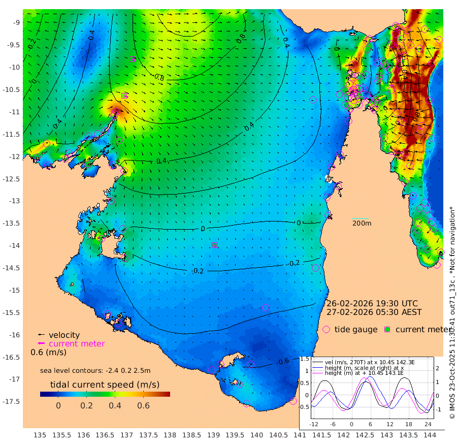 38cm/s 116T +3cm/s rms + 7cm/s -42T. ARA-GOC87 57m 24cm/s 156T +3cm/s rms + 2cm/s -2T. ARA-GOC87 60m 30cm/s 114T +2cm/s rms + 3cm/s 61T. ARA-GOC87 47m 19cm Daru 35cm Bobo Island 89cm Meer Island Barge 78cm Bramble Cay 51cm Unnamed Cay 54cm Pearce Cay 65cm Stephens Island 57cm Merrie England Shoals 21cm Mutacomal Reef 74cm Darnley Island Barge 88cm East Cay 49cm Yorke Island Barge 34cm Rennel Island 37cm Aureed Island 9cm Dungeness Reef -34cm Zagai Island -39cm Yam Island -63cm Dauan Island -56cm Saibai Island -69cm Phipi Reef -41cm Warrior Reef - West -54cm Mabuiag Island Barge 40cm Half Way Island 9cm Coconut Island 25cm Dugong Islet -16cm Poll Island -8cm Kirkcaldie Reef -54cm Suarji Island -13cm Sue Islet 4cm Hawkesbury Island -36cm Alert Patches -33cm Twin Island -12cm Badu Island -49cm St Pauls (Moa Island) -11cm Kubin (Moa Island) -34cm Ince Point -28cm Thursday Island -32cm Nardana Patches -14cm Turtle Head -19cm Round Island 13cm Goods Island 24cm Booby Island 11cm White Rocks Area 39cm Carpentaria -36cm Papou Point 19cm Bampfield Head 16cm Crab Island 16cm Red Wallis Island 0cm Packe Island 15cm Harrington Reef -2cm Herald Camp -28cm Sharp Point -15cm Red Island Point -31cm Possession Island -30cm Alpha Rock -14cm Frederick Point 15cm Wyborn Reef Light 4cm Tetley Island 64cm Triangle Reef 36cm Turtle Head Island 78cm Maclennan Cay 88cm Raine Island 52cm Mcsweeny Reef 58cm Collette Reef 75cm Shadwell Reef 69cm Hannibal Island 78cm Round Point 31cm Vrilya Point 77cm Cape Grenville 80cm Hicks Island 90cm Sir Charles Hardy Island 24cm Harvey Island 92cm Kay Reef 88cm Rocky Island 93cm Chapman Island 92cm Ham Reef 92cm Jubilee Reef 80cm Night Island 93cm Unnamed Reef No. 3 95cm Morris Island 93cm 1st 3 Mile Opening 95cm Creech Reef 89cm Fife Island 121cm Eden Reef 100cm Stanley Island 105cm Normanby River 49cm Yabooma Island 67cm Hutchison River 50cm Elcho Island 36cm North West Crocodile Island 71cm Cape Wessel 57cm Stevens Island 101cm Guluwuru Island 53cm Hopeful Bay 62cm Auster Point 70cm Two Island Bay 98cm Cadell Strait 203cm Mallison Island 72cm Melville Bay (Gove Harbour) 82cm Truant Island 51cm Cape Arnhem 12cm Cape Grey -13cm Hawk Island -53cm Milner Bay (Groote Eylandt) -59cm Cape Beatrice -97cm West Island -99cm Centre Island -102cm Mornington Island -99cm West Wellesley Islands -122cm Bountiful Island -157cm Albert River Mouth -168cm Sweers Island -160cm Karumba -59cm Nassau River Offshore -18cm Christmas Creek 18cm Archer River 27cm Boyd Point 26cm Weipa (Humbug Point) 29cm Pennefather River 22cm Cullen Point