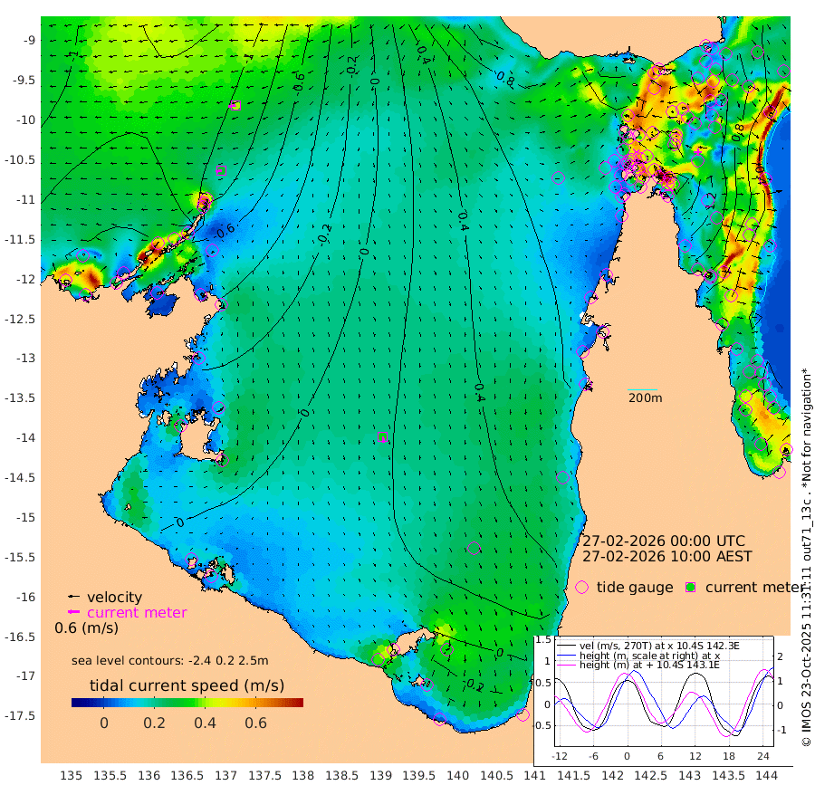 30cm/s -98T +3cm/s rms + 7cm/s -42T. ARA-GOC87 57m 32cm/s 172T +3cm/s rms + 2cm/s -2T. ARA-GOC87 60m 41cm/s -102T +2cm/s rms + 3cm/s 61T. ARA-GOC87 47m 149cm Daru 129cm Bobo Island 54cm Meer Island Barge 86cm Bramble Cay 130cm Unnamed Cay 127cm Pearce Cay 114cm Stephens Island 130cm Merrie England Shoals 158cm Mutacomal Reef 97cm Darnley Island Barge 63cm East Cay 119cm Yorke Island Barge 142cm Rennel Island 128cm Aureed Island 155cm Dungeness Reef 142cm Zagai Island 157cm Yam Island 138cm Dauan Island 121cm Saibai Island 149cm Phipi Reef 156cm Warrior Reef - West 135cm Mabuiag Island Barge 139cm Half Way Island 153cm Coconut Island 157cm Dugong Islet 162cm Poll Island 168cm Kirkcaldie Reef 180cm Suarji Island 153cm Sue Islet 143cm Hawkesbury Island 185cm Alert Patches 178cm Twin Island 139cm Badu Island 180cm St Pauls (Moa Island) 147cm Kubin (Moa Island) 168cm Ince Point 164cm Thursday Island 164cm Nardana Patches 158cm Turtle Head 134cm Round Island 139cm Goods Island 128cm Booby Island 136cm White Rocks Area 100cm Carpentaria 149cm Papou Point 128cm Bampfield Head 102cm Crab Island 133cm Red Wallis Island 153cm Packe Island 172cm Harrington Reef 134cm Herald Camp 52cm Sharp Point 131cm Red Island Point 150cm Possession Island 162cm Alpha Rock 173cm Frederick Point 156cm Wyborn Reef Light 161cm Tetley Island 68cm Triangle Reef 159cm Turtle Head Island 67cm Maclennan Cay 35cm Raine Island 122cm Mcsweeny Reef 106cm Collette Reef 64cm Shadwell Reef 110cm Hannibal Island 93cm Round Point 96cm Vrilya Point 86cm Cape Grenville 71cm Hicks Island 72cm Sir Charles Hardy Island 26cm Harvey Island 65cm Kay Reef 46cm Rocky Island 37cm Chapman Island 35cm Ham Reef 43cm Jubilee Reef 48cm Night Island 41cm Unnamed Reef No. 3 48cm Morris Island 45cm 1st 3 Mile Opening 47cm Creech Reef 48cm Fife Island 36cm Eden Reef 50cm Stanley Island 49cm Normanby River -148cm Yabooma Island -165cm Hutchison River -157cm Elcho Island -149cm North West Crocodile Island -116cm Cape Wessel -144cm Stevens Island -103cm Guluwuru Island -140cm Hopeful Bay -121cm Auster Point -132cm Two Island Bay -161cm Cadell Strait -115cm Mallison Island -94cm Melville Bay (Gove Harbour) -98cm Truant Island -65cm Cape Arnhem -50cm Cape Grey -42cm Hawk Island -46cm Milner Bay (Groote Eylandt) -26cm Cape Beatrice -2cm West Island -7cm Centre Island 4cm Mornington Island 12cm West Wellesley Islands -10cm Bountiful Island -56cm Albert River Mouth -75cm Sweers Island -40cm Karumba 40cm Nassau River Offshore 67cm Christmas Creek 67cm Archer River 76cm Boyd Point 75cm Weipa (Humbug Point) 74cm Pennefather River 86cm Cullen Point