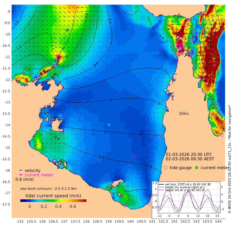 28cm/s 125T +3cm/s rms + 7cm/s -42T. ARA-GOC87 57m 8cm/s 141T +3cm/s rms + 2cm/s -2T. ARA-GOC87 60m 28cm/s 122T +2cm/s rms + 3cm/s 61T. ARA-GOC87 47m -63cm Daru -45cm Bobo Island 45cm Meer Island Barge 27cm Bramble Cay -15cm Unnamed Cay -19cm Pearce Cay -4cm Stephens Island -7cm Merrie England Shoals -49cm Mutacomal Reef 5cm Darnley Island Barge 46cm East Cay -27cm Yorke Island Barge -36cm Rennel Island -41cm Aureed Island -68cm Dungeness Reef -108cm Zagai Island -104cm Yam Island -114cm Dauan Island -103cm Saibai Island -130cm Phipi Reef -119cm Warrior Reef - West -74cm Mabuiag Island Barge -35cm Half Way Island -67cm Coconut Island -52cm Dugong Islet -86cm Poll Island -84cm Kirkcaldie Reef -115cm Suarji Island -83cm Sue Islet 42cm Hawkesbury Island -88cm Alert Patches -89cm Twin Island 3cm Badu Island -108cm St Pauls (Moa Island) -8cm Kubin (Moa Island) -68cm Ince Point -49cm Thursday Island -56cm Nardana Patches -20cm Turtle Head 4cm Round Island 40cm Goods Island 66cm Booby Island 57cm White Rocks Area 66cm Carpentaria -82cm Papou Point 71cm Bampfield Head 44cm Crab Island 53cm Red Wallis Island 11cm Packe Island -68cm Harrington Reef 36cm Herald Camp -50cm Sharp Point -16cm Red Island Point -55cm Possession Island -79cm Alpha Rock -80cm Frederick Point -53cm Wyborn Reef Light -63cm Tetley Island 26cm Triangle Reef -41cm Turtle Head Island 38cm Maclennan Cay 62cm Raine Island -15cm Mcsweeny Reef -1cm Collette Reef 35cm Shadwell Reef 5cm Hannibal Island 31cm Round Point 50cm Vrilya Point 33cm Cape Grenville 36cm Hicks Island 49cm Sir Charles Hardy Island 7cm Harvey Island 59cm Kay Reef 60cm Rocky Island 74cm Chapman Island 70cm Ham Reef 62cm Jubilee Reef 47cm Night Island 69cm Unnamed Reef No. 3 64cm Morris Island 63cm 1st 3 Mile Opening 62cm Creech Reef 54cm Fife Island 90cm Eden Reef 69cm Stanley Island 75cm Normanby River 174cm Yabooma Island 185cm Hutchison River 164cm Elcho Island 151cm North West Crocodile Island 122cm Cape Wessel 148cm Stevens Island 96cm Guluwuru Island 147cm Hopeful Bay 128cm Auster Point 133cm Two Island Bay 154cm Cadell Strait 116cm Mallison Island 84cm Melville Bay (Gove Harbour) 93cm Truant Island 47cm Cape Arnhem 10cm Cape Grey -11cm Hawk Island -46cm Milner Bay (Groote Eylandt) -58cm Cape Beatrice -103cm West Island -105cm Centre Island -129cm Mornington Island -123cm West Wellesley Islands -125cm Bountiful Island -154cm Albert River Mouth -159cm Sweers Island -160cm Karumba -88cm Nassau River Offshore -47cm Christmas Creek 13cm Archer River 26cm Boyd Point 35cm Weipa (Humbug Point) 25cm Pennefather River 44cm Cullen Point