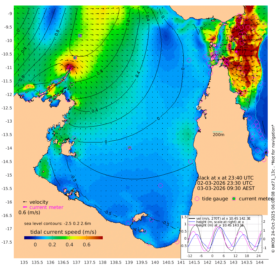27cm/s 115T +3cm/s rms + 7cm/s -42T. ARA-GOC87 57m 24cm/s 170T +3cm/s rms + 2cm/s -2T. ARA-GOC87 60m 20cm/s 107T +2cm/s rms + 3cm/s 61T. ARA-GOC87 47m 136cm Daru 149cm Bobo Island 130cm Meer Island Barge 157cm Bramble Cay 158cm Unnamed Cay 167cm Pearce Cay 161cm Stephens Island 165cm Merrie England Shoals 150cm Mutacomal Reef 148cm Darnley Island Barge 147cm East Cay 139cm Yorke Island Barge 150cm Rennel Island 140cm Aureed Island 121cm Dungeness Reef 60cm Zagai Island 68cm Yam Island 6cm Dauan Island 1cm Saibai Island 9cm Phipi Reef 62cm Warrior Reef - West 12cm Mabuiag Island Barge 145cm Half Way Island 124cm Coconut Island 141cm Dugong Islet 100cm Poll Island 102cm Kirkcaldie Reef 63cm Suarji Island 85cm Sue Islet 63cm Hawkesbury Island 68cm Alert Patches 76cm Twin Island 34cm Badu Island 56cm St Pauls (Moa Island) 57cm Kubin (Moa Island) 52cm Ince Point 46cm Thursday Island 46cm Nardana Patches 49cm Turtle Head 43cm Round Island 51cm Goods Island 34cm Booby Island 49cm White Rocks Area 7cm Carpentaria 57cm Papou Point 47cm Bampfield Head 12cm Crab Island 40cm Red Wallis Island 59cm Packe Island 146cm Harrington Reef 42cm Herald Camp -2cm Sharp Point 43cm Red Island Point 52cm Possession Island 77cm Alpha Rock 106cm Frederick Point 146cm Wyborn Reef Light 135cm Tetley Island 117cm Triangle Reef 160cm Turtle Head Island 128cm Maclennan Cay 111cm Raine Island 149cm Mcsweeny Reef 142cm Collette Reef 120cm Shadwell Reef 158cm Hannibal Island 168cm Round Point 3cm Vrilya Point 147cm Cape Grenville 142cm Hicks Island 146cm Sir Charles Hardy Island 44cm Harvey Island 145cm Kay Reef 127cm Rocky Island 126cm Chapman Island 119cm Ham Reef 122cm Jubilee Reef 113cm Night Island 123cm Unnamed Reef No. 3 133cm Morris Island 115cm 1st 3 Mile Opening 124cm Creech Reef 136cm Fife Island 151cm Eden Reef 135cm Stanley Island 157cm Normanby River 149cm Yabooma Island 176cm Hutchison River 136cm Elcho Island 127cm North West Crocodile Island 126cm Cape Wessel 142cm Stevens Island 128cm Guluwuru Island 126cm Hopeful Bay 124cm Auster Point 129cm Two Island Bay 171cm Cadell Strait 166cm Mallison Island 110cm Melville Bay (Gove Harbour) 121cm Truant Island 69cm Cape Arnhem 25cm Cape Grey 6cm Hawk Island -55cm Milner Bay (Groote Eylandt) -56cm Cape Beatrice -107cm West Island -118cm Centre Island -101cm Mornington Island -94cm West Wellesley Islands -104cm Bountiful Island -149cm Albert River Mouth -161cm Sweers Island -144cm Karumba -54cm Nassau River Offshore -18cm Christmas Creek 5cm Archer River 14cm Boyd Point 16cm Weipa (Humbug Point) -1cm Pennefather River 5cm Cullen Point
