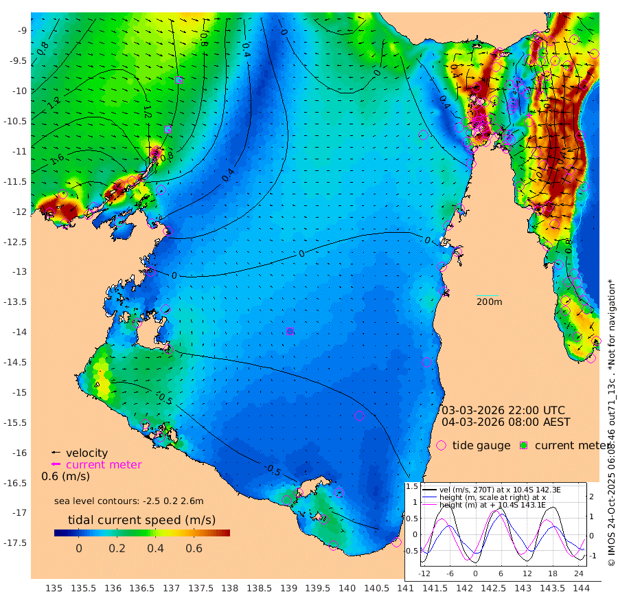 16cm/s 137T +3cm/s rms + 7cm/s -42T. ARA-GOC87 57m 4cm/s -179T +3cm/s rms + 2cm/s -2T. ARA-GOC87 60m 17cm/s 131T +2cm/s rms + 3cm/s 61T. ARA-GOC87 47m -21cm Daru -10cm Bobo Island 54cm Meer Island Barge 52cm Bramble Cay 24cm Unnamed Cay 15cm Pearce Cay 26cm Stephens Island 33cm Merrie England Shoals 0cm Mutacomal Reef 26cm Darnley Island Barge 60cm East Cay 1cm Yorke Island Barge 5cm Rennel Island -9cm Aureed Island -27cm Dungeness Reef -74cm Zagai Island -64cm Yam Island -85cm Dauan Island -83cm Saibai Island -93cm Phipi Reef -80cm Warrior Reef - West -47cm Mabuiag Island Barge 1cm Half Way Island -27cm Coconut Island -11cm Dugong Islet -43cm Poll Island -43cm Kirkcaldie Reef -66cm Suarji Island -49cm Sue Islet 60cm Hawkesbury Island -45cm Alert Patches -48cm Twin Island 22cm Badu Island -67cm St Pauls (Moa Island) 18cm Kubin (Moa Island) -34cm Ince Point -19cm Thursday Island -24cm Nardana Patches 8cm Turtle Head 30cm Round Island 56cm Goods Island 70cm Booby Island 74cm White Rocks Area 48cm Carpentaria -49cm Papou Point 83cm Bampfield Head 42cm Crab Island 61cm Red Wallis Island 35cm Packe Island -22cm Harrington Reef 53cm Herald Camp -39cm Sharp Point 2cm Red Island Point -22cm Possession Island -37cm Alpha Rock -37cm Frederick Point -6cm Wyborn Reef Light -16cm Tetley Island 39cm Triangle Reef 0cm Turtle Head Island 50cm Maclennan Cay 66cm Raine Island 18cm Mcsweeny Reef 27cm Collette Reef 48cm Shadwell Reef 35cm Hannibal Island 59cm Round Point 36cm Vrilya Point 55cm Cape Grenville 53cm Hicks Island 64cm Sir Charles Hardy Island 13cm Harvey Island 74cm Kay Reef 69cm Rocky Island 79cm Chapman Island 72cm Ham Reef 66cm Jubilee Reef 54cm Night Island 72cm Unnamed Reef No. 3 72cm Morris Island 67cm 1st 3 Mile Opening 66cm Creech Reef 64cm Fife Island 93cm Eden Reef 77cm Stanley Island 86cm Normanby River 204cm Yabooma Island 215cm Hutchison River 189cm Elcho Island 179cm North West Crocodile Island 123cm Cape Wessel 169cm Stevens Island 85cm Guluwuru Island 165cm Hopeful Bay 137cm Auster Point 137cm Two Island Bay 157cm Cadell Strait 67cm Mallison Island 83cm Melville Bay (Gove Harbour) 90cm Truant Island 43cm Cape Arnhem 13cm Cape Grey -1cm Hawk Island -33cm Milner Bay (Groote Eylandt) -40cm Cape Beatrice -83cm West Island -88cm Centre Island -99cm Mornington Island -90cm West Wellesley Islands -80cm Bountiful Island -102cm Albert River Mouth -107cm Sweers Island -108cm Karumba -63cm Nassau River Offshore -34cm Christmas Creek 13cm Archer River 21cm Boyd Point 36cm Weipa (Humbug Point) 13cm Pennefather River 36cm Cullen Point