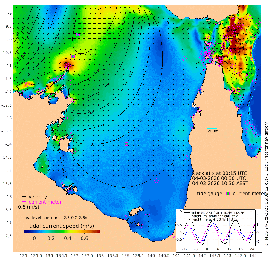 23cm/s 108T +3cm/s rms + 7cm/s -42T. ARA-GOC87 57m 22cm/s 174T +3cm/s rms + 2cm/s -2T. ARA-GOC87 60m 18cm/s 94T +2cm/s rms + 3cm/s 61T. ARA-GOC87 47m 146cm Daru 155cm Bobo Island 111cm Meer Island Barge 142cm Bramble Cay 152cm Unnamed Cay 164cm Pearce Cay 152cm Stephens Island 155cm Merrie England Shoals 154cm Mutacomal Reef 137cm Darnley Island Barge 127cm East Cay 138cm Yorke Island Barge 151cm Rennel Island 144cm Aureed Island 131cm Dungeness Reef 90cm Zagai Island 95cm Yam Island 45cm Dauan Island 39cm Saibai Island 45cm Phipi Reef 96cm Warrior Reef - West 35cm Mabuiag Island Barge 143cm Half Way Island 135cm Coconut Island 144cm Dugong Islet 118cm Poll Island 114cm Kirkcaldie Reef 90cm Suarji Island 103cm Sue Islet 51cm Hawkesbury Island 84cm Alert Patches 94cm Twin Island 33cm Badu Island 81cm St Pauls (Moa Island) 59cm Kubin (Moa Island) 67cm Ince Point 54cm Thursday Island 57cm Nardana Patches 50cm Turtle Head 42cm Round Island 36cm Goods Island 9cm Booby Island 28cm White Rocks Area -20cm Carpentaria 76cm Papou Point 26cm Bampfield Head -8cm Crab Island 20cm Red Wallis Island 53cm Packe Island 153cm Harrington Reef 31cm Herald Camp 10cm Sharp Point 41cm Red Island Point 63cm Possession Island 96cm Alpha Rock 121cm Frederick Point 155cm Wyborn Reef Light 148cm Tetley Island 106cm Triangle Reef 160cm Turtle Head Island 110cm Maclennan Cay 88cm Raine Island 144cm Mcsweeny Reef 133cm Collette Reef 103cm Shadwell Reef 147cm Hannibal Island 151cm Round Point -23cm Vrilya Point 129cm Cape Grenville 124cm Hicks Island 128cm Sir Charles Hardy Island 39cm Harvey Island 121cm Kay Reef 104cm Rocky Island 102cm Chapman Island 95cm Ham Reef 99cm Jubilee Reef 94cm Night Island 98cm Unnamed Reef No. 3 109cm Morris Island 90cm 1st 3 Mile Opening 99cm Creech Reef 116cm Fife Island 119cm Eden Reef 107cm Stanley Island 128cm Normanby River 141cm Yabooma Island 173cm Hutchison River 132cm Elcho Island 124cm North West Crocodile Island 126cm Cape Wessel 140cm Stevens Island 131cm Guluwuru Island 122cm Hopeful Bay 121cm Auster Point 127cm Two Island Bay 171cm Cadell Strait 169cm Mallison Island 116cm Melville Bay (Gove Harbour) 126cm Truant Island 76cm Cape Arnhem 32cm Cape Grey 17cm Hawk Island -43cm Milner Bay (Groote Eylandt) -44cm Cape Beatrice -94cm West Island -106cm Centre Island -80cm Mornington Island -76cm West Wellesley Islands -81cm Bountiful Island -116cm Albert River Mouth -127cm Sweers Island -111cm Karumba -45cm Nassau River Offshore -19cm Christmas Creek -9cm Archer River 0cm Boyd Point -1cm Weipa (Humbug Point) -22cm Pennefather River -14cm Cullen Point