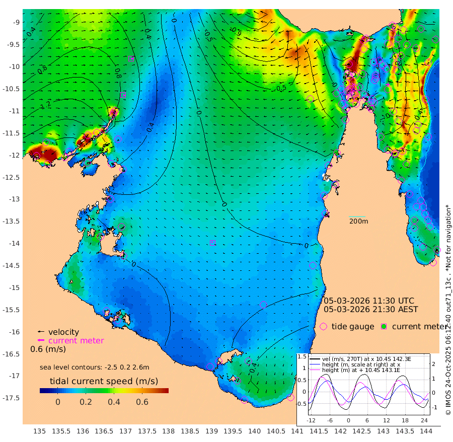 20cm/s 114T +3cm/s rms + 7cm/s -42T. ARA-GOC87 57m 13cm/s -49T +3cm/s rms + 2cm/s -2T. ARA-GOC87 60m 24cm/s 99T +2cm/s rms + 3cm/s 61T. ARA-GOC87 47m 13cm Daru 22cm Bobo Island 38cm Meer Island Barge 50cm Bramble Cay 31cm Unnamed Cay 37cm Pearce Cay 34cm Stephens Island 43cm Merrie England Shoals 20cm Mutacomal Reef 26cm Darnley Island Barge 50cm East Cay 13cm Yorke Island Barge 23cm Rennel Island 13cm Aureed Island 4cm Dungeness Reef -37cm Zagai Island -37cm Yam Island -55cm Dauan Island -64cm Saibai Island -24cm Phipi Reef -36cm Warrior Reef - West -47cm Mabuiag Island Barge 16cm Half Way Island 7cm Coconut Island 1cm Dugong Islet -15cm Poll Island -11cm Kirkcaldie Reef -36cm Suarji Island -28cm Sue Islet -6cm Hawkesbury Island -27cm Alert Patches -30cm Twin Island -3cm Badu Island -45cm St Pauls (Moa Island) -21cm Kubin (Moa Island) -33cm Ince Point -31cm Thursday Island -32cm Nardana Patches -14cm Turtle Head -15cm Round Island 0cm Goods Island -10cm Booby Island 1cm White Rocks Area -57cm Carpentaria -33cm Papou Point -19cm Bampfield Head 0cm Crab Island -11cm Red Wallis Island -10cm Packe Island 5cm Harrington Reef -27cm Herald Camp -23cm Sharp Point -1cm Red Island Point -23cm Possession Island -34cm Alpha Rock -15cm Frederick Point 11cm Wyborn Reef Light 2cm Tetley Island 27cm Triangle Reef 17cm Turtle Head Island 31cm Maclennan Cay 49cm Raine Island 27cm Mcsweeny Reef 33cm Collette Reef 38cm Shadwell Reef 41cm Hannibal Island 57cm Round Point -12cm Vrilya Point 42cm Cape Grenville 44cm Hicks Island 32cm Sir Charles Hardy Island 11cm Harvey Island 51cm Kay Reef 47cm Rocky Island 55cm Chapman Island 42cm Ham Reef 43cm Jubilee Reef 39cm Night Island 47cm Unnamed Reef No. 3 51cm Morris Island 42cm 1st 3 Mile Opening 44cm Creech Reef 52cm Fife Island 62cm Eden Reef 51cm Stanley Island 60cm Normanby River 161cm Yabooma Island 184cm Hutchison River 159cm Elcho Island 154cm North West Crocodile Island 76cm Cape Wessel 145cm Stevens Island 61cm Guluwuru Island 135cm Hopeful Bay 102cm Auster Point 91cm Two Island Bay 148cm Cadell Strait 39cm Mallison Island 68cm Melville Bay (Gove Harbour) 65cm Truant Island 36cm Cape Arnhem 28cm Cape Grey 26cm Hawk Island 9cm Milner Bay (Groote Eylandt) 8cm Cape Beatrice -25cm West Island -23cm Centre Island 24cm Mornington Island 19cm West Wellesley Islands 44cm Bountiful Island 76cm Albert River Mouth 80cm Sweers Island 78cm Karumba 34cm Nassau River Offshore 22cm Christmas Creek 23cm Archer River -7cm Boyd Point 10cm Weipa (Humbug Point) 6cm Pennefather River -20cm Cullen Point