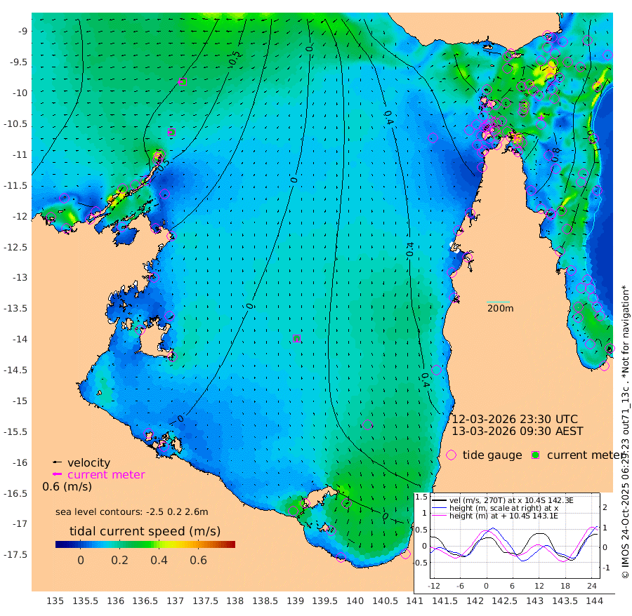 29cm/s -96T +3cm/s rms + 7cm/s -42T. ARA-GOC87 57m 27cm/s 177T +3cm/s rms + 2cm/s -2T. ARA-GOC87 60m 36cm/s -100T +2cm/s rms + 3cm/s 61T. ARA-GOC87 47m 99cm Daru 96cm Bobo Island 51cm Meer Island Barge 71cm Bramble Cay 91cm Unnamed Cay 103cm Pearce Cay 88cm Stephens Island 92cm Merrie England Shoals 106cm Mutacomal Reef 75cm Darnley Island Barge 64cm East Cay 85cm Yorke Island Barge 103cm Rennel Island 99cm Aureed Island 107cm Dungeness Reef 86cm Zagai Island 97cm Yam Island 80cm Dauan Island 69cm Saibai Island 93cm Phipi Reef 99cm Warrior Reef - West 85cm Mabuiag Island Barge 98cm Half Way Island 107cm Coconut Island 109cm Dugong Islet 109cm Poll Island 109cm Kirkcaldie Reef 124cm Suarji Island 97cm Sue Islet 116cm Hawkesbury Island 124cm Alert Patches 120cm Twin Island 99cm Badu Island 116cm St Pauls (Moa Island) 109cm Kubin (Moa Island) 114cm Ince Point 113cm Thursday Island 112cm Nardana Patches 115cm Turtle Head 105cm Round Island 109cm Goods Island 103cm Booby Island 111cm White Rocks Area 76cm Carpentaria 97cm Papou Point 110cm Bampfield Head 77cm Crab Island 108cm Red Wallis Island 121cm Packe Island 123cm Harrington Reef 115cm Herald Camp 28cm Sharp Point 101cm Red Island Point 110cm Possession Island 105cm Alpha Rock 120cm Frederick Point 106cm Wyborn Reef Light 108cm Tetley Island 62cm Triangle Reef 110cm Turtle Head Island 62cm Maclennan Cay 40cm Raine Island 91cm Mcsweeny Reef 80cm Collette Reef 53cm Shadwell Reef 83cm Hannibal Island 81cm Round Point 69cm Vrilya Point 73cm Cape Grenville 65cm Hicks Island 67cm Sir Charles Hardy Island 22cm Harvey Island 61cm Kay Reef 51cm Rocky Island 50cm Chapman Island 45cm Ham Reef 45cm Jubilee Reef 49cm Night Island 50cm Unnamed Reef No. 3 52cm Morris Island 43cm 1st 3 Mile Opening 50cm Creech Reef 56cm Fife Island 47cm Eden Reef 51cm Stanley Island 57cm Normanby River -81cm Yabooma Island -93cm Hutchison River -90cm Elcho Island -84cm North West Crocodile Island -69cm Cape Wessel -91cm Stevens Island -83cm Guluwuru Island -79cm Hopeful Bay -72cm Auster Point -80cm Two Island Bay -102cm Cadell Strait -134cm Mallison Island -67cm Melville Bay (Gove Harbour) -70cm Truant Island -50cm Cape Arnhem -41cm Cape Grey -29cm Hawk Island -42cm Milner Bay (Groote Eylandt) -26cm Cape Beatrice -11cm West Island -14cm Centre Island 1cm Mornington Island 4cm West Wellesley Islands 0cm Bountiful Island -50cm Albert River Mouth -52cm Sweers Island -26cm Karumba 36cm Nassau River Offshore 56cm Christmas Creek 59cm Archer River 63cm Boyd Point 66cm Weipa (Humbug Point) 51cm Pennefather River 70cm Cullen Point