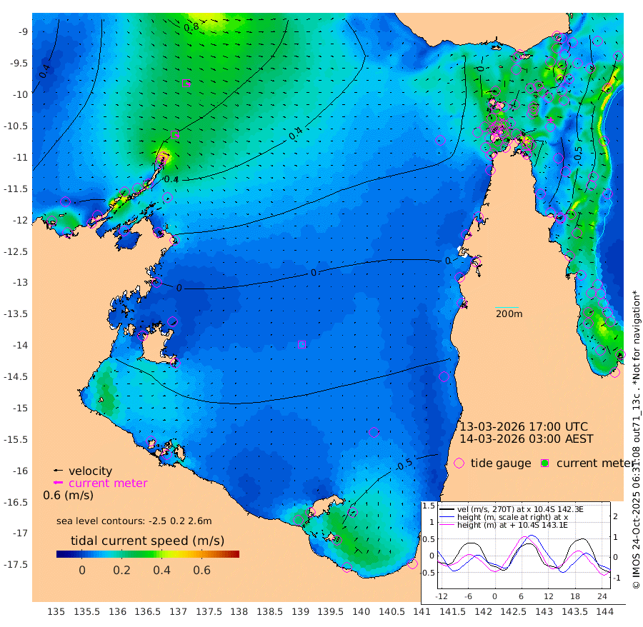 32cm/s 116T +3cm/s rms + 7cm/s -42T. ARA-GOC87 57m 8cm/s 69T +3cm/s rms + 2cm/s -2T. ARA-GOC87 60m 30cm/s 113T +2cm/s rms + 3cm/s 61T. ARA-GOC87 47m -67cm Daru -67cm Bobo Island -24cm Meer Island Barge -48cm Bramble Cay -62cm Unnamed Cay -66cm Pearce Cay -57cm Stephens Island -68cm Merrie England Shoals -77cm Mutacomal Reef -46cm Darnley Island Barge -39cm East Cay -53cm Yorke Island Barge -68cm Rennel Island -64cm Aureed Island -62cm Dungeness Reef -41cm Zagai Island -46cm Yam Island -11cm Dauan Island -15cm Saibai Island -35cm Phipi Reef -50cm Warrior Reef - West -11cm Mabuiag Island Barge -60cm Half Way Island -66cm Coconut Island -65cm Dugong Islet -58cm Poll Island -61cm Kirkcaldie Reef -60cm Suarji Island -52cm Sue Islet 18cm Hawkesbury Island -50cm Alert Patches -49cm Twin Island 19cm Badu Island -41cm St Pauls (Moa Island) 8cm Kubin (Moa Island) -28cm Ince Point -15cm Thursday Island -18cm Nardana Patches -5cm Turtle Head 11cm Round Island 23cm Goods Island 41cm Booby Island 23cm White Rocks Area 51cm Carpentaria -34cm Papou Point 45cm Bampfield Head 35cm Crab Island 28cm Red Wallis Island 5cm Packe Island -79cm Harrington Reef 26cm Herald Camp -18cm Sharp Point -16cm Red Island Point -25cm Possession Island -50cm Alpha Rock -61cm Frederick Point -68cm Wyborn Reef Light -65cm Tetley Island -29cm Triangle Reef -57cm Turtle Head Island -30cm Maclennan Cay -14cm Raine Island -59cm Mcsweeny Reef -54cm Collette Reef -29cm Shadwell Reef -58cm Hannibal Island -54cm Round Point 40cm Vrilya Point -47cm Cape Grenville -37cm Hicks Island -32cm Sir Charles Hardy Island -13cm Harvey Island -39cm Kay Reef -26cm Rocky Island -25cm Chapman Island -20cm Ham Reef -19cm Jubilee Reef -23cm Night Island -25cm Unnamed Reef No. 3 -26cm Morris Island -10cm 1st 3 Mile Opening -21cm Creech Reef -34cm Fife Island -21cm Eden Reef -26cm Stanley Island -36cm Normanby River 83cm Yabooma Island 93cm Hutchison River 83cm Elcho Island 72cm North West Crocodile Island 66cm Cape Wessel 77cm Stevens Island 73cm Guluwuru Island 66cm Hopeful Bay 70cm Auster Point 83cm Two Island Bay 94cm Cadell Strait 81cm Mallison Island 59cm Melville Bay (Gove Harbour) 68cm Truant Island 42cm Cape Arnhem 13cm Cape Grey -6cm Hawk Island -19cm Milner Bay (Groote Eylandt) -36cm Cape Beatrice -65cm West Island -63cm Centre Island -94cm Mornington Island -98cm West Wellesley Islands -106cm Bountiful Island -106cm Albert River Mouth -114cm Sweers Island -118cm Karumba -80cm Nassau River Offshore -52cm Christmas Creek -15cm Archer River 7cm Boyd Point 7cm Weipa (Humbug Point) 18cm Pennefather River 31cm Cullen Point