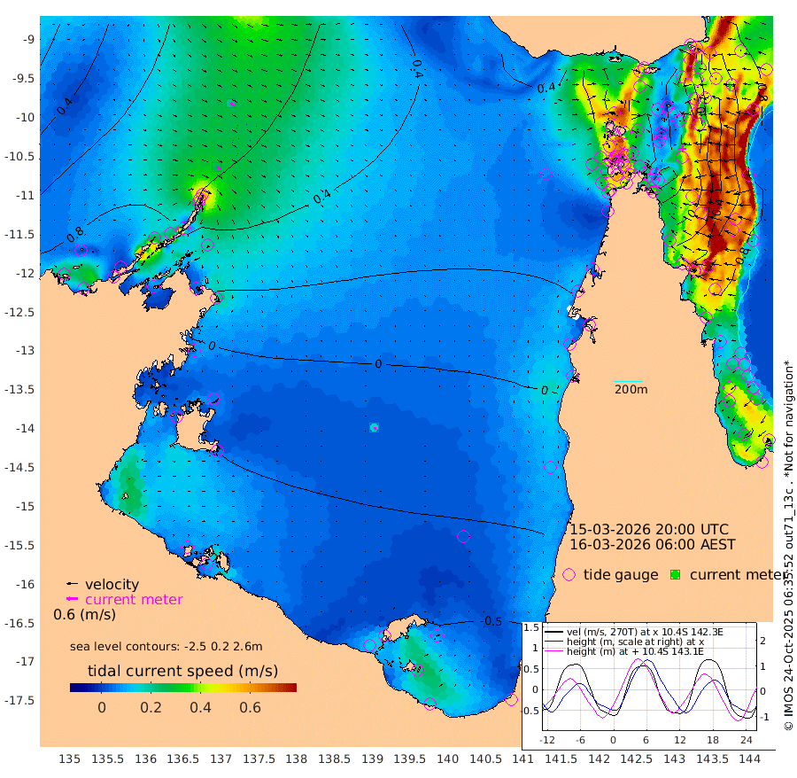 25cm/s 124T +3cm/s rms + 7cm/s -42T. ARA-GOC87 57m 15cm/s 153T +3cm/s rms + 2cm/s -2T. ARA-GOC87 60m 21cm/s 128T +2cm/s rms + 3cm/s 61T. ARA-GOC87 47m -8cm Daru -5cm Bobo Island 63cm Meer Island Barge 53cm Bramble Cay 31cm Unnamed Cay 15cm Pearce Cay 36cm Stephens Island 38cm Merrie England Shoals 3cm Mutacomal Reef 41cm Darnley Island Barge 60cm East Cay 17cm Yorke Island Barge 9cm Rennel Island -3cm Aureed Island -16cm Dungeness Reef -59cm Zagai Island -50cm Yam Island -71cm Dauan Island -71cm Saibai Island -84cm Phipi Reef -67cm Warrior Reef - West -48cm Mabuiag Island Barge 16cm Half Way Island -22cm Coconut Island 4cm Dugong Islet -36cm Poll Island -25cm Kirkcaldie Reef -69cm Suarji Island -33cm Sue Islet 36cm Hawkesbury Island -43cm Alert Patches -44cm Twin Island 8cm Badu Island -57cm St Pauls (Moa Island) 8cm Kubin (Moa Island) -32cm Ince Point -19cm Thursday Island -24cm Nardana Patches 1cm Turtle Head 8cm Round Island 40cm Goods Island 58cm Booby Island 49cm White Rocks Area 60cm Carpentaria -44cm Papou Point 55cm Bampfield Head 41cm Crab Island 46cm Red Wallis Island 21cm Packe Island -14cm Harrington Reef 35cm Herald Camp -31cm Sharp Point -10cm Red Island Point -30cm Possession Island -35cm Alpha Rock -33cm Frederick Point -6cm Wyborn Reef Light -15cm Tetley Island 39cm Triangle Reef 11cm Turtle Head Island 55cm Maclennan Cay 68cm Raine Island 25cm Mcsweeny Reef 33cm Collette Reef 55cm Shadwell Reef 42cm Hannibal Island 53cm Round Point 51cm Vrilya Point 57cm Cape Grenville 56cm Hicks Island 68cm Sir Charles Hardy Island 16cm Harvey Island 72cm Kay Reef 67cm Rocky Island 70cm Chapman Island 70cm Ham Reef 71cm Jubilee Reef 58cm Night Island 69cm Unnamed Reef No. 3 73cm Morris Island 77cm 1st 3 Mile Opening 72cm Creech Reef 62cm Fife Island 95cm Eden Reef 82cm Stanley Island 83cm Normanby River 97cm Yabooma Island 100cm Hutchison River 85cm Elcho Island 74cm North West Crocodile Island 68cm Cape Wessel 83cm Stevens Island 74cm Guluwuru Island 77cm Hopeful Bay 72cm Auster Point 81cm Two Island Bay 94cm Cadell Strait 131cm Mallison Island 56cm Melville Bay (Gove Harbour) 63cm Truant Island 32cm Cape Arnhem 4cm Cape Grey -19cm Hawk Island -42cm Milner Bay (Groote Eylandt) -48cm Cape Beatrice -79cm West Island -84cm Centre Island -101cm Mornington Island -91cm West Wellesley Islands -104cm Bountiful Island -130cm Albert River Mouth -147cm Sweers Island -141cm Karumba -60cm Nassau River Offshore -22cm Christmas Creek 17cm Archer River 30cm Boyd Point 36cm Weipa (Humbug Point) 33cm Pennefather River 41cm Cullen Point