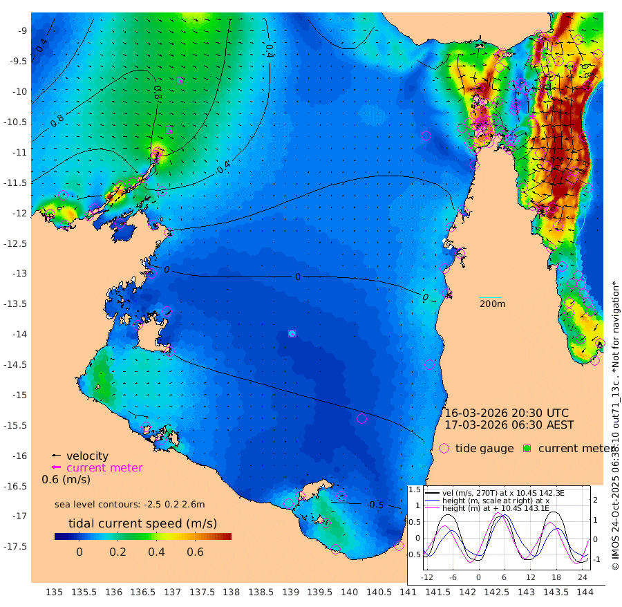 23cm/s 126T +3cm/s rms + 7cm/s -42T. ARA-GOC87 57m 13cm/s 156T +3cm/s rms + 2cm/s -2T. ARA-GOC87 60m 21cm/s 129T +2cm/s rms + 3cm/s 61T. ARA-GOC87 47m -8cm Daru -2cm Bobo Island 69cm Meer Island Barge 59cm Bramble Cay 34cm Unnamed Cay 22cm Pearce Cay 42cm Stephens Island 42cm Merrie England Shoals 3cm Mutacomal Reef 45cm Darnley Island Barge 68cm East Cay 19cm Yorke Island Barge 14cm Rennel Island 1cm Aureed Island -14cm Dungeness Reef -67cm Zagai Island -55cm Yam Island -84cm Dauan Island -85cm Saibai Island -95cm Phipi Reef -75cm Warrior Reef - West -56cm Mabuiag Island Barge 21cm Half Way Island -23cm Coconut Island 7cm Dugong Islet -37cm Poll Island -25cm Kirkcaldie Reef -72cm Suarji Island -38cm Sue Islet 38cm Hawkesbury Island -47cm Alert Patches -47cm Twin Island 7cm Badu Island -63cm St Pauls (Moa Island) 8cm Kubin (Moa Island) -36cm Ince Point -22cm Thursday Island -28cm Nardana Patches 0cm Turtle Head 5cm Round Island 43cm Goods Island 60cm Booby Island 54cm White Rocks Area 55cm Carpentaria -47cm Papou Point 52cm Bampfield Head 40cm Crab Island 48cm Red Wallis Island 20cm Packe Island -10cm Harrington Reef 33cm Herald Camp -35cm Sharp Point -7cm Red Island Point -34cm Possession Island -40cm Alpha Rock -34cm Frederick Point -7cm Wyborn Reef Light -18cm Tetley Island 42cm Triangle Reef 15cm Turtle Head Island 62cm Maclennan Cay 75cm Raine Island 29cm Mcsweeny Reef 35cm Collette Reef 58cm Shadwell Reef 45cm Hannibal Island 60cm Round Point 48cm Vrilya Point 62cm Cape Grenville 63cm Hicks Island 74cm Sir Charles Hardy Island 18cm Harvey Island 79cm Kay Reef 75cm Rocky Island 76cm Chapman Island 77cm Ham Reef 78cm Jubilee Reef 64cm Night Island 75cm Unnamed Reef No. 3 81cm Morris Island 84cm 1st 3 Mile Opening 79cm Creech Reef 70cm Fife Island 104cm Eden Reef 89cm Stanley Island 95cm Normanby River 128cm Yabooma Island 132cm Hutchison River 113cm Elcho Island 104cm North West Crocodile Island 81cm Cape Wessel 102cm Stevens Island 77cm Guluwuru Island 95cm Hopeful Bay 88cm Auster Point 97cm Two Island Bay 115cm Cadell Strait 89cm Mallison Island 61cm Melville Bay (Gove Harbour) 68cm Truant Island 33cm Cape Arnhem 7cm Cape Grey -18cm Hawk Island -40cm Milner Bay (Groote Eylandt) -44cm Cape Beatrice -75cm West Island -83cm Centre Island -98cm Mornington Island -86cm West Wellesley Islands -93cm Bountiful Island -118cm Albert River Mouth -136cm Sweers Island -129cm Karumba -57cm Nassau River Offshore -22cm Christmas Creek 16cm Archer River 27cm Boyd Point 36cm Weipa (Humbug Point) 28cm Pennefather River 37cm Cullen Point
