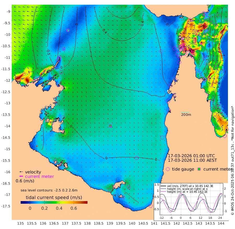 8cm/s -111T +3cm/s rms + 7cm/s -42T. ARA-GOC87 57m 30cm/s 172T +3cm/s rms + 2cm/s -2T. ARA-GOC87 60m 18cm/s -97T +2cm/s rms + 3cm/s 61T. ARA-GOC87 47m 155cm Daru 140cm Bobo Island 47cm Meer Island Barge 87cm Bramble Cay 128cm Unnamed Cay 129cm Pearce Cay 111cm Stephens Island 128cm Merrie England Shoals 163cm Mutacomal Reef 94cm Darnley Island Barge 57cm East Cay 120cm Yorke Island Barge 139cm Rennel Island 131cm Aureed Island 148cm Dungeness Reef 154cm Zagai Island 161cm Yam Island 145cm Dauan Island 135cm Saibai Island 140cm Phipi Reef 170cm Warrior Reef - West 123cm Mabuiag Island Barge 133cm Half Way Island 156cm Coconut Island 149cm Dugong Islet 162cm Poll Island 156cm Kirkcaldie Reef 165cm Suarji Island 151cm Sue Islet 90cm Hawkesbury Island 159cm Alert Patches 163cm Twin Island 95cm Badu Island 167cm St Pauls (Moa Island) 112cm Kubin (Moa Island) 142cm Ince Point 128cm Thursday Island 132cm Nardana Patches 112cm Turtle Head 90cm Round Island 77cm Goods Island 52cm Booby Island 66cm White Rocks Area 30cm Carpentaria 138cm Papou Point 55cm Bampfield Head 38cm Crab Island 70cm Red Wallis Island 110cm Packe Island 165cm Harrington Reef 74cm Herald Camp 50cm Sharp Point 89cm Red Island Point 117cm Possession Island 160cm Alpha Rock 166cm Frederick Point 166cm Wyborn Reef Light 172cm Tetley Island 67cm Triangle Reef 150cm Turtle Head Island 56cm Maclennan Cay 23cm Raine Island 120cm Mcsweeny Reef 103cm Collette Reef 56cm Shadwell Reef 108cm Hannibal Island 93cm Round Point 26cm Vrilya Point 77cm Cape Grenville 63cm Hicks Island 67cm Sir Charles Hardy Island 22cm Harvey Island 55cm Kay Reef 36cm Rocky Island 30cm Chapman Island 26cm Ham Reef 33cm Jubilee Reef 39cm Night Island 32cm Unnamed Reef No. 3 37cm Morris Island 24cm 1st 3 Mile Opening 32cm Creech Reef 46cm Fife Island 25cm Eden Reef 34cm Stanley Island 39cm Normanby River -61cm Yabooma Island -55cm Hutchison River -62cm Elcho Island -59cm North West Crocodile Island -21cm Cape Wessel -37cm Stevens Island -3cm Guluwuru Island -48cm Hopeful Bay -37cm Auster Point -38cm Two Island Bay -37cm Cadell Strait 71cm Mallison Island -6cm Melville Bay (Gove Harbour) -4cm Truant Island -1cm Cape Arnhem -19cm Cape Grey -13cm Hawk Island -42cm Milner Bay (Groote Eylandt) -30cm Cape Beatrice -36cm West Island -45cm Centre Island -23cm Mornington Island -21cm West Wellesley Islands -44cm Bountiful Island -70cm Albert River Mouth -93cm Sweers Island -62cm Karumba 8cm Nassau River Offshore 29cm Christmas Creek 21cm Archer River 31cm Boyd Point 24cm Weipa (Humbug Point) 19cm Pennefather River 30cm Cullen Point